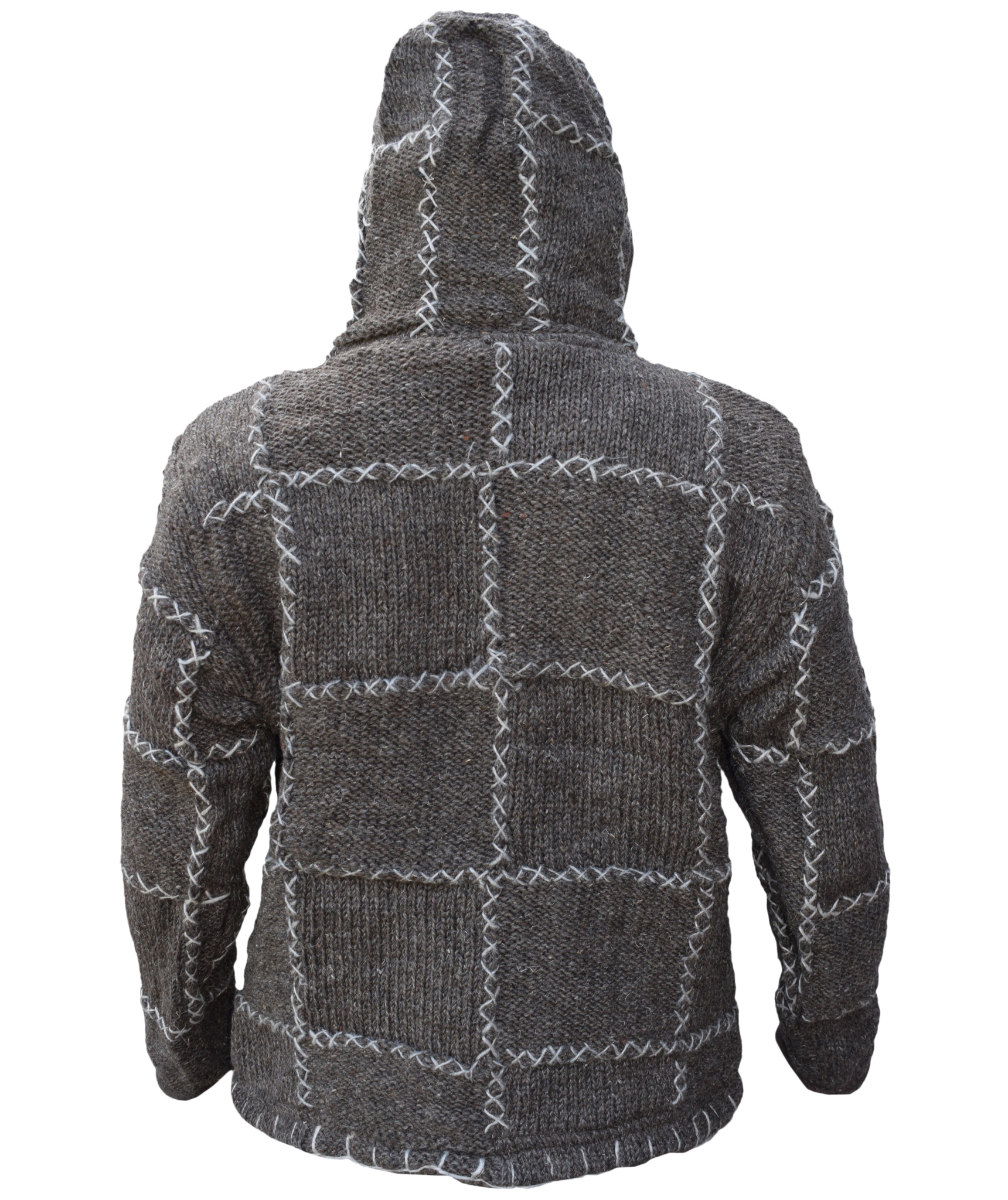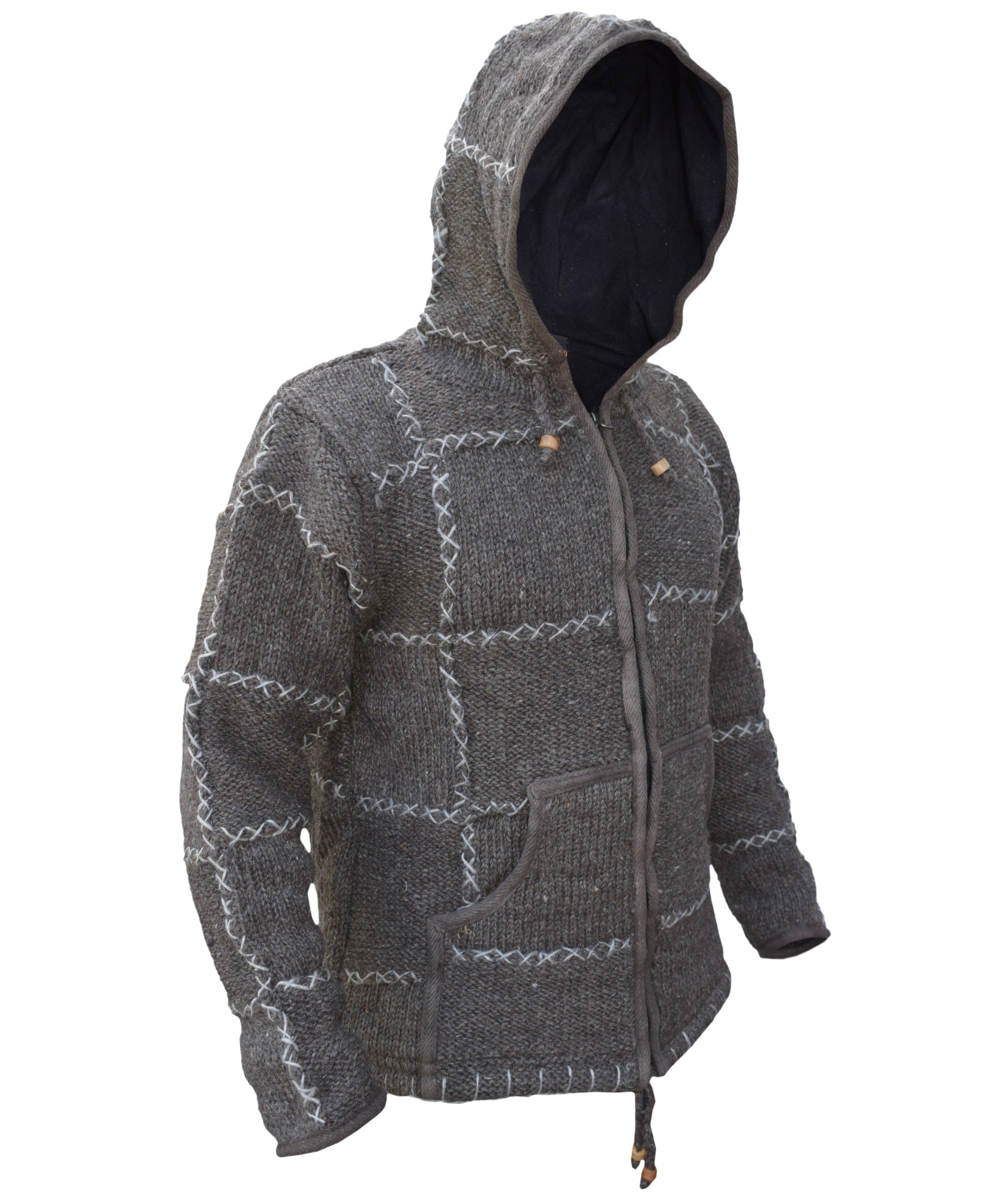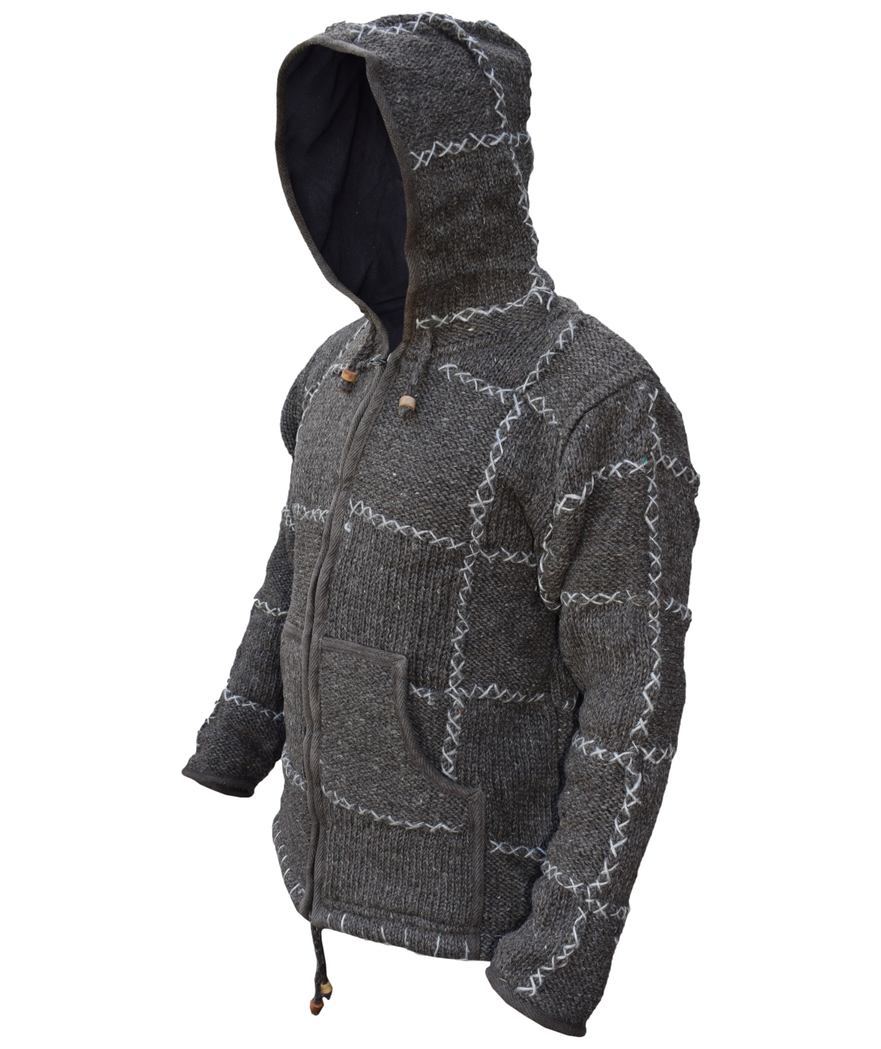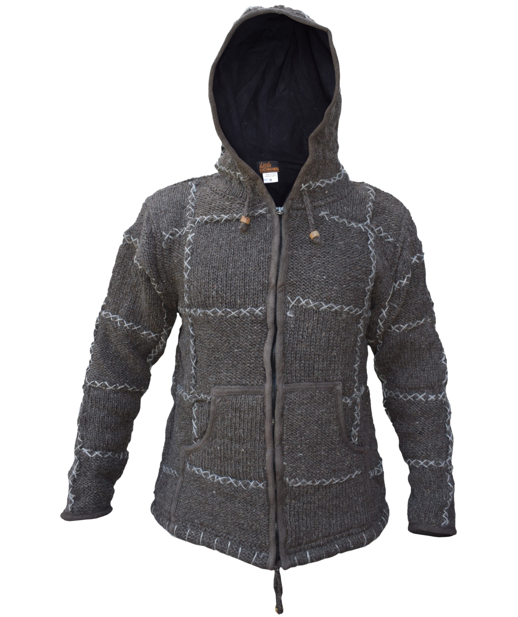 This hand knitted woolen jacket has hoodie and hem that's got drawstring with wooden beads to adjust size. It's fleece lined and double lined so that it keeps you warm in chilling weather. There are two pockets at the front and inner breast pocket on one side. It's woolen outside and fleece lined inside. The stitches are meant to be there. They add more beauty to the already beautiful jumper.