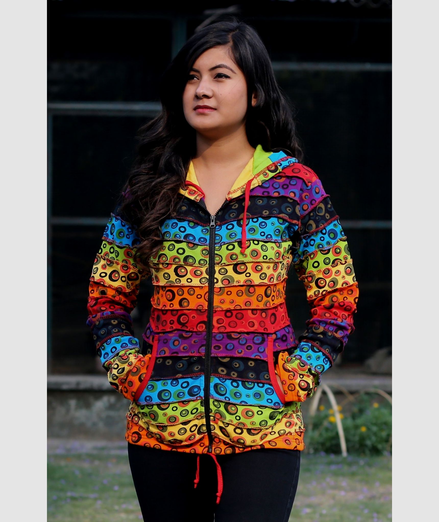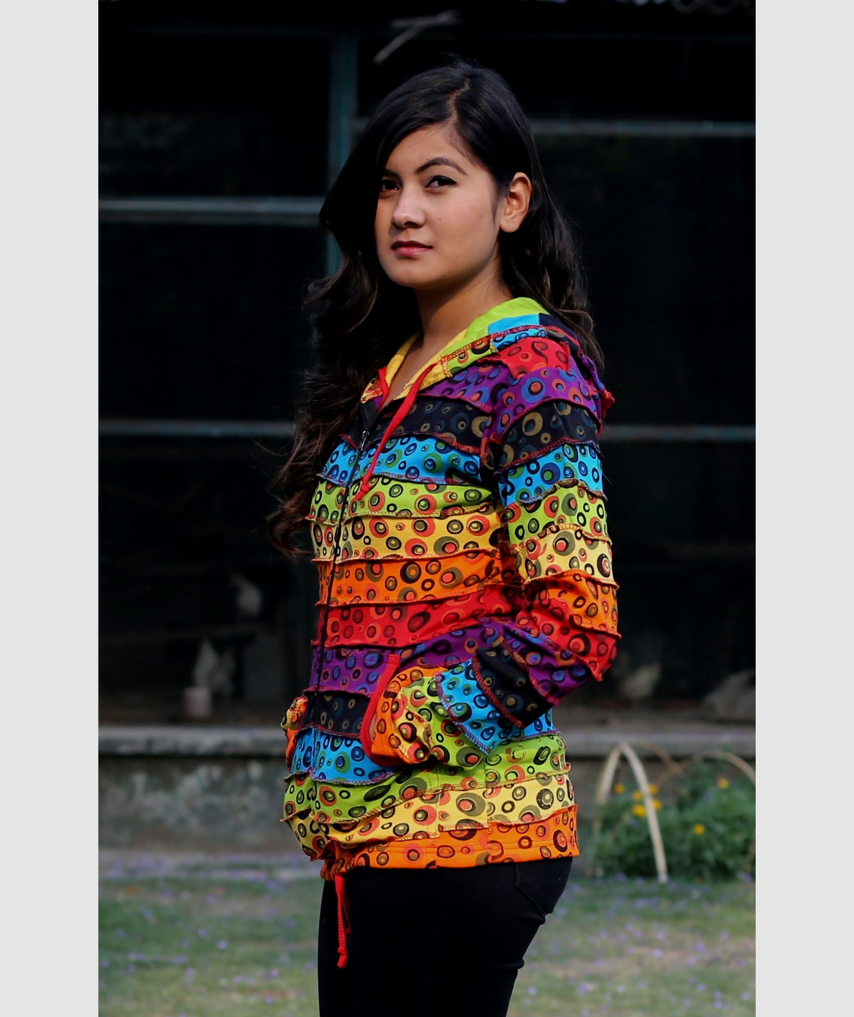 Cotton rainbow striped ribs jackets with bubble print. They have got full length front zip fastening. There are two deep front pockets. Drawstring is provided to the hem and hoodie for size adjustment. They have long elf pointed hood. They are hand made and every details are provided with special care.