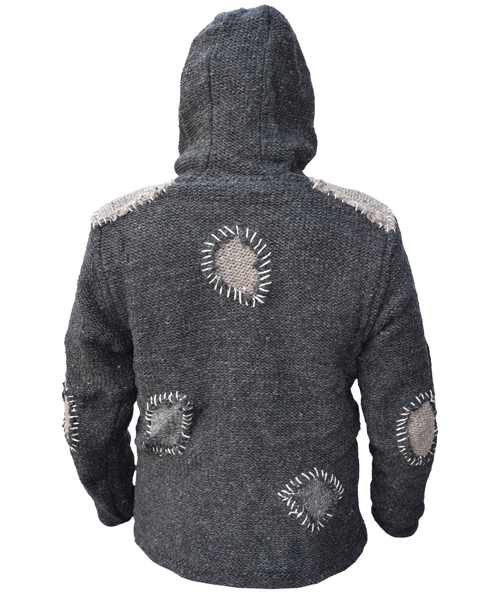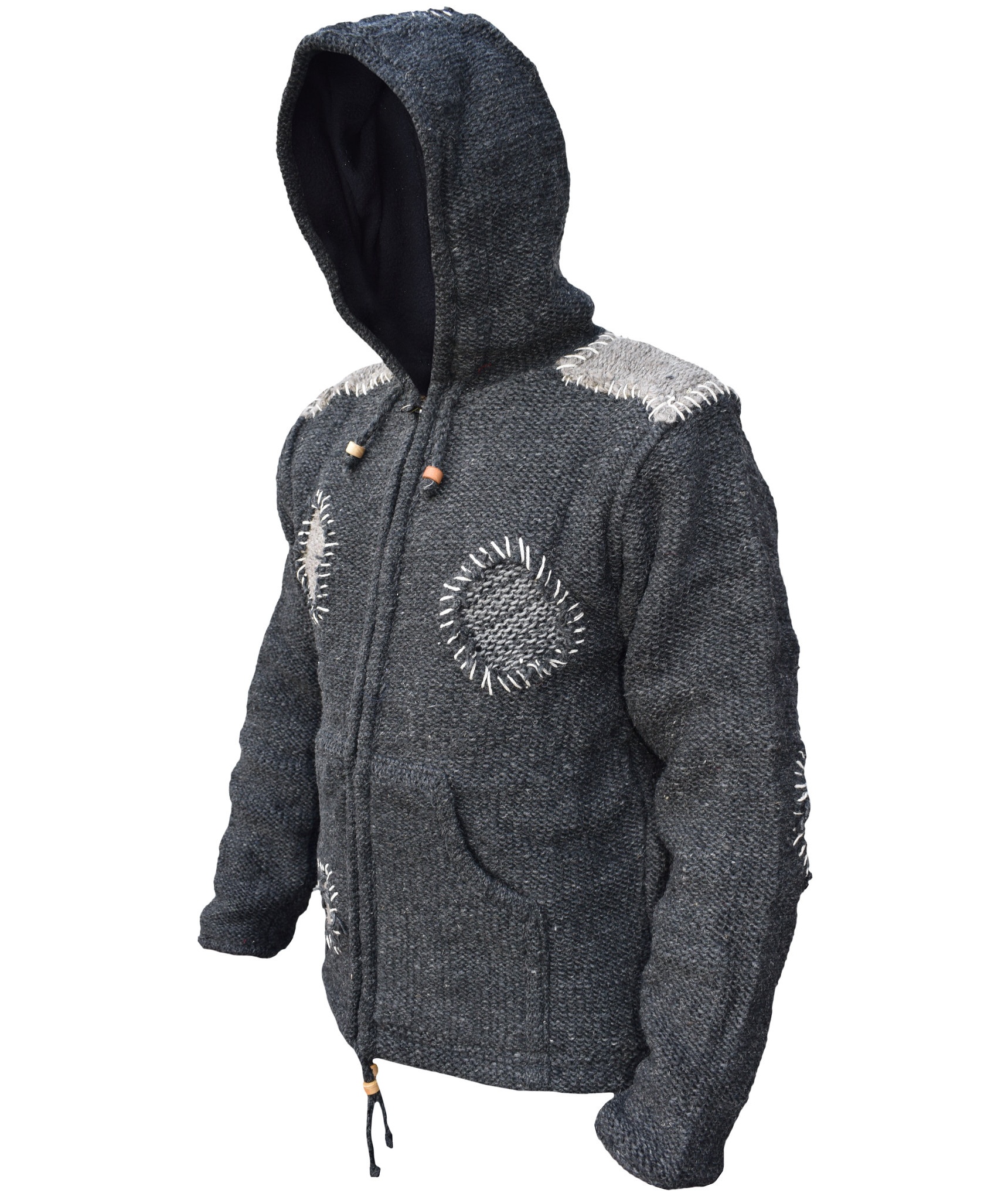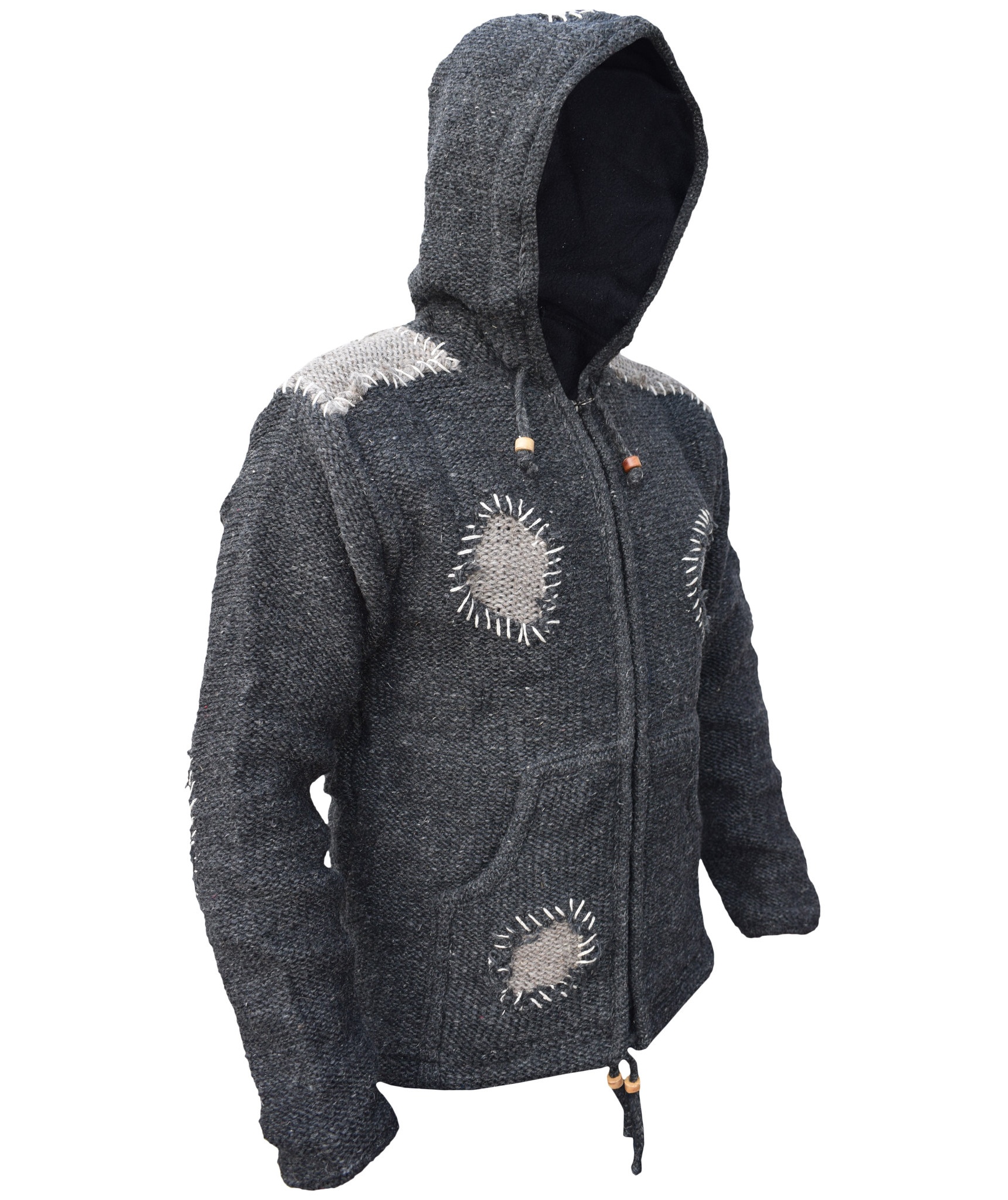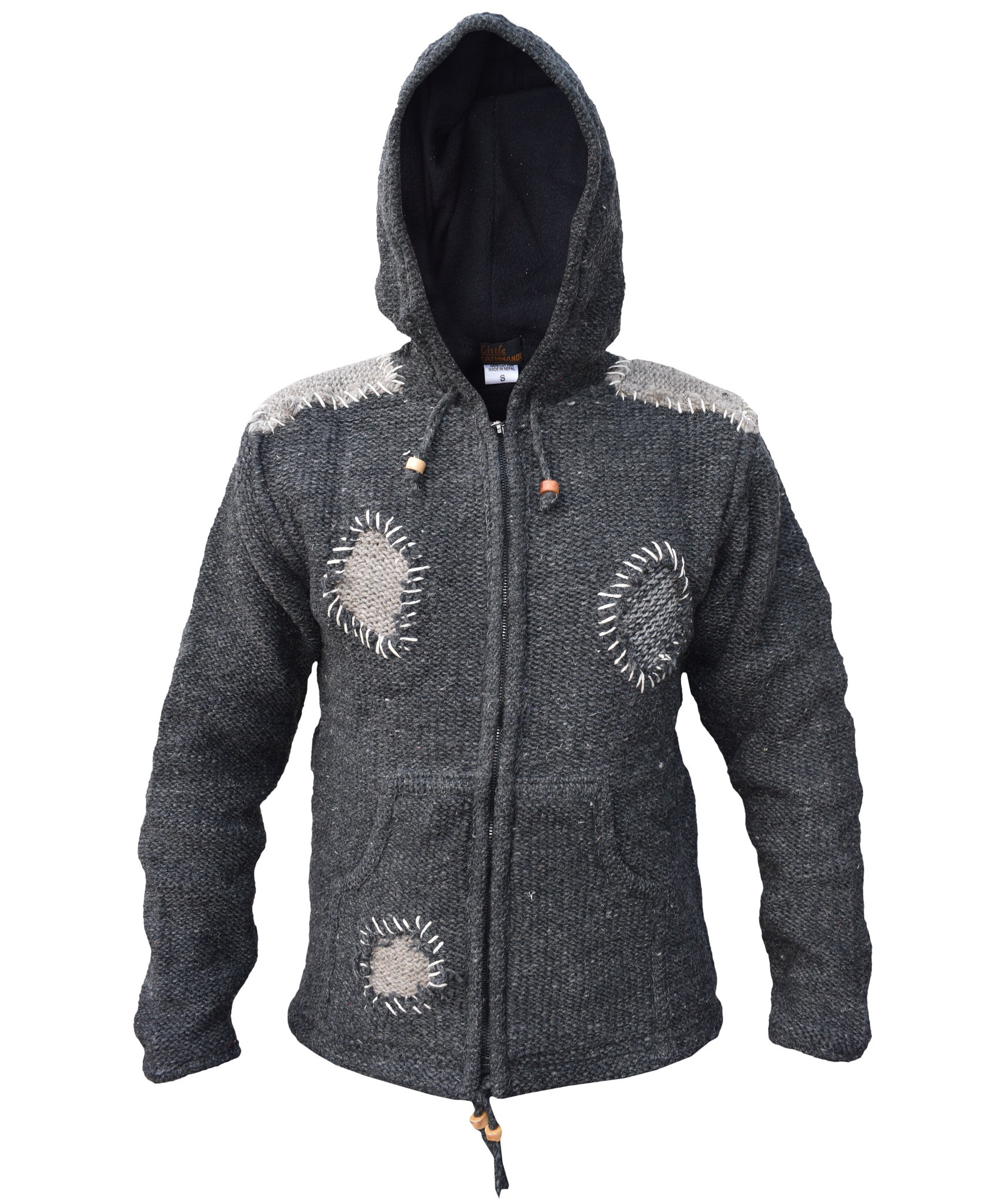 100% natural wool outside. Fleece lined inside. These woolen jackets have two deep front pockets and an inner breast pocket at one side. They are hooded jacket with hood and bottom hem provided with a drawstring that has wooden beads. They have full zip fastening. They are double knitted as well as fleece lined that makes these jackets more suitable for chilling weather. These jackets may be exactly what you are looking for this winter. Every details is provided with special attention so the resultant product speaks of absolute finery. Addition of them to your wardrobe won't go waste. Please don't be fooled by cheap imitations as our jackets are double knitted and the quality of wool is much different than what you find online. The materials are all sourced from Nepal. They are of high quality. There may be slight variation in color and size as these products are hand made individually. It can no way be considered as defect, rather it reflects unique origin. All of our products are fair trade. It is assured that no child labor is used for the production of any of our products. They are ethically sourced.Made in Kathmandu, Nepal. Wash in cold water. Do not use bleach.UNISEX clothing.