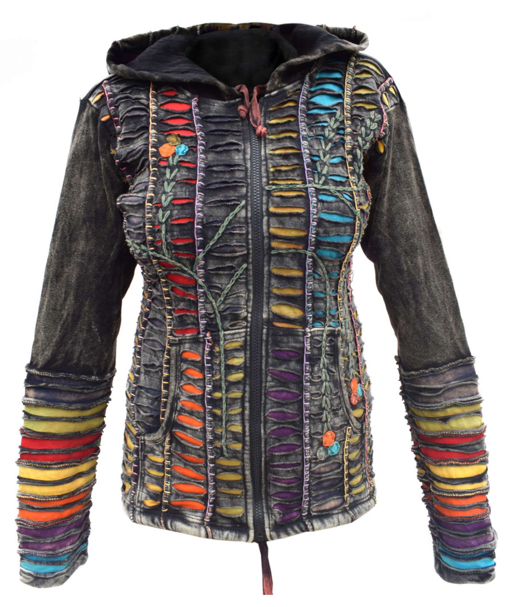 These cotton jackets embroidered jackets with pixie pointed hood. They have got full length front zip fastening. There are two deep front pockets. Drawstring is provided to the hem and hoodie for size adjustment. The pixie pointed wizard hood and razor cut ribs give them more funky look and make you stand out in mass. They are hand made and every details are provided with special care.