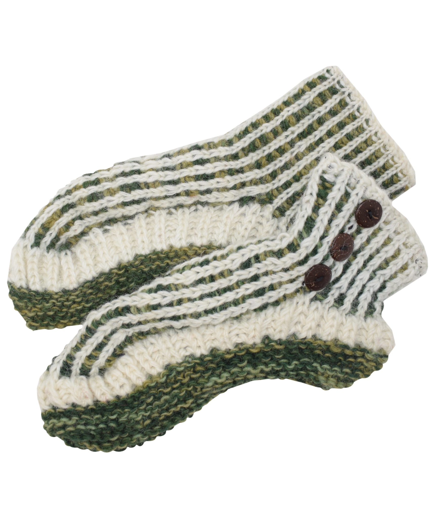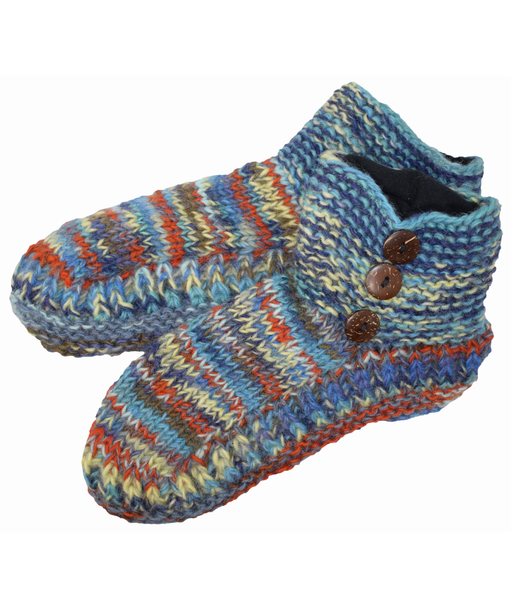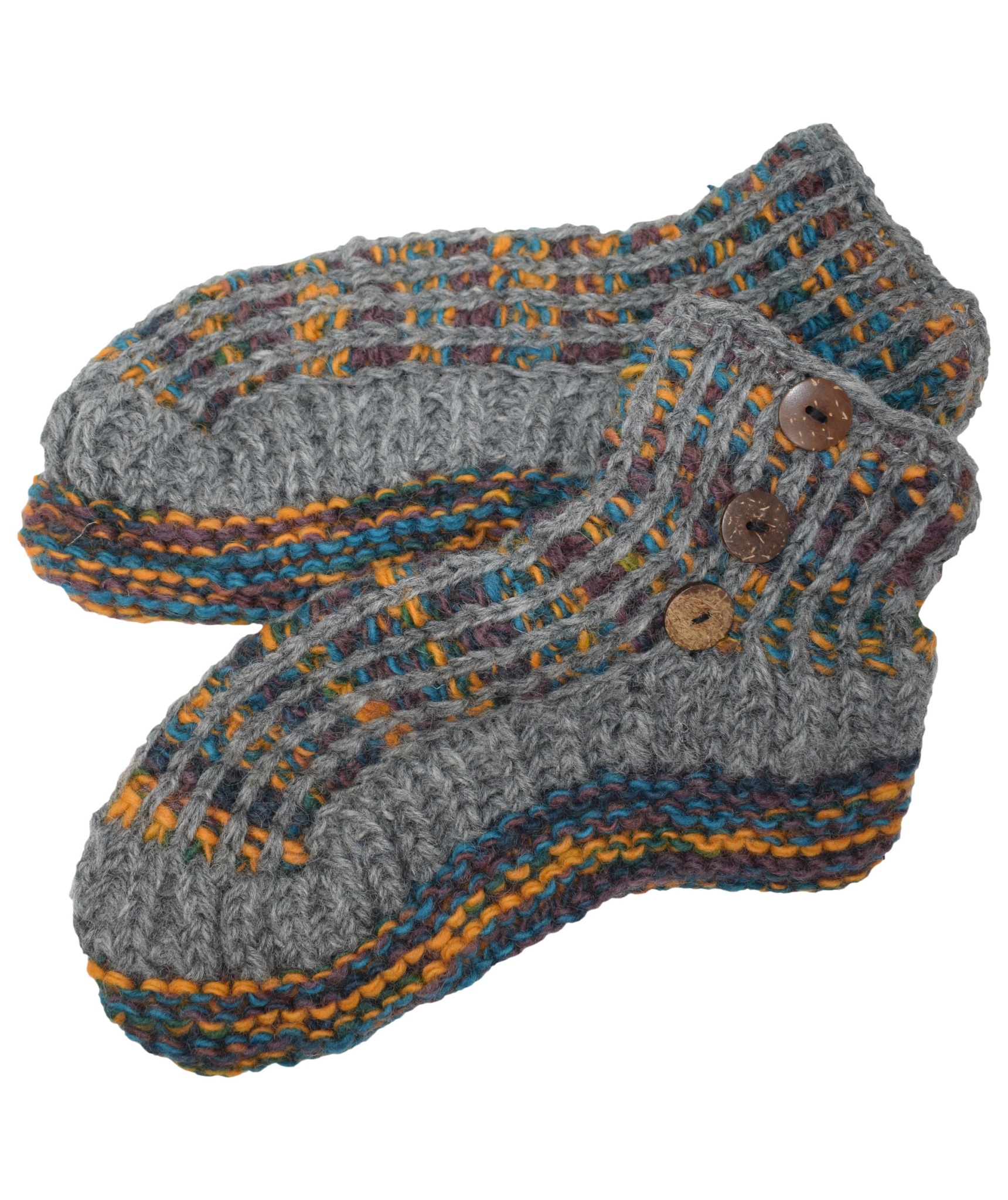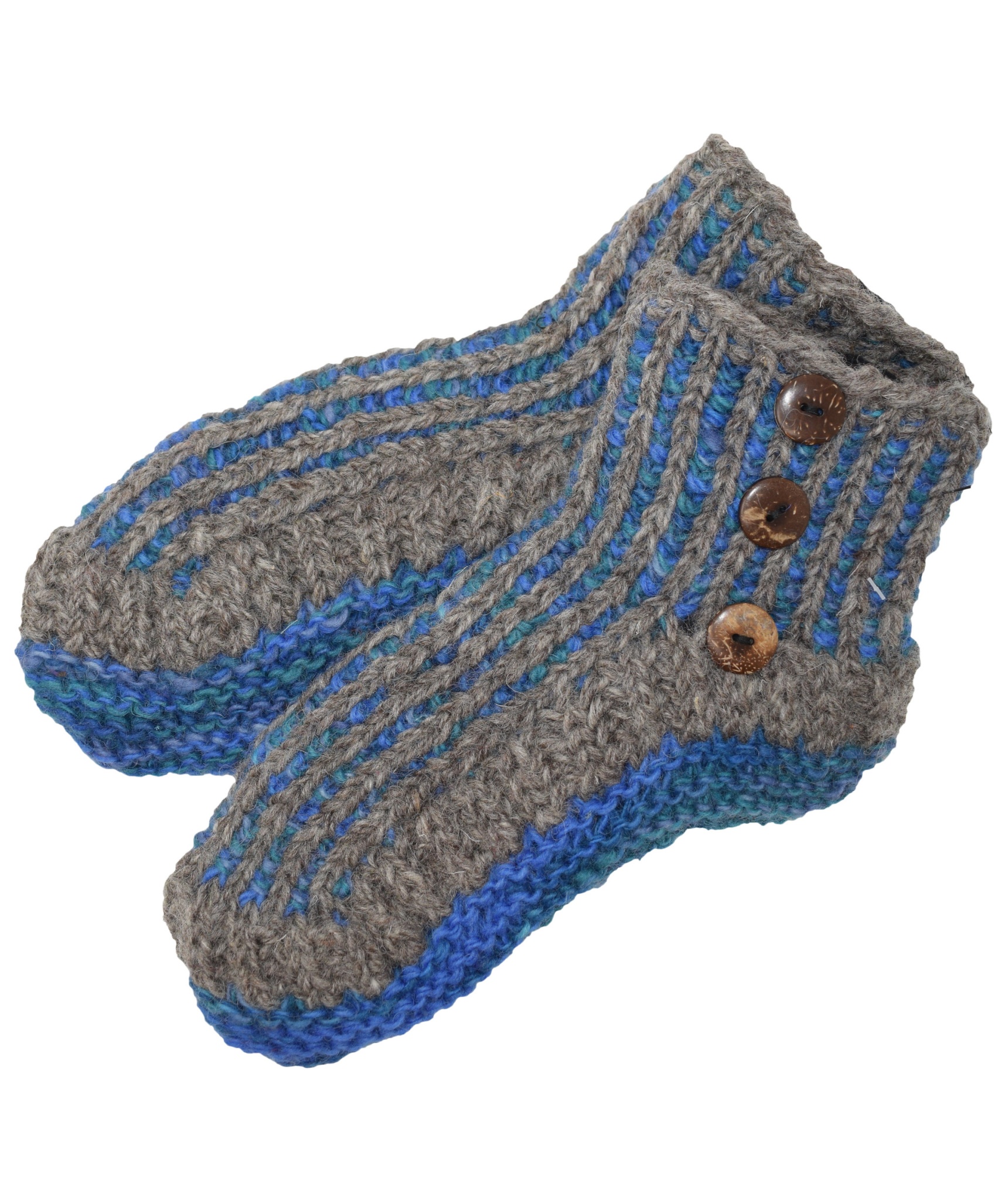 Keep your toes feeling toasty with this cozy hand knitted wool slipper socks . Ankle high design with added button detail for style. Fully fleece lined for extra comfort and give you extra warmth when the weather gets chilly.