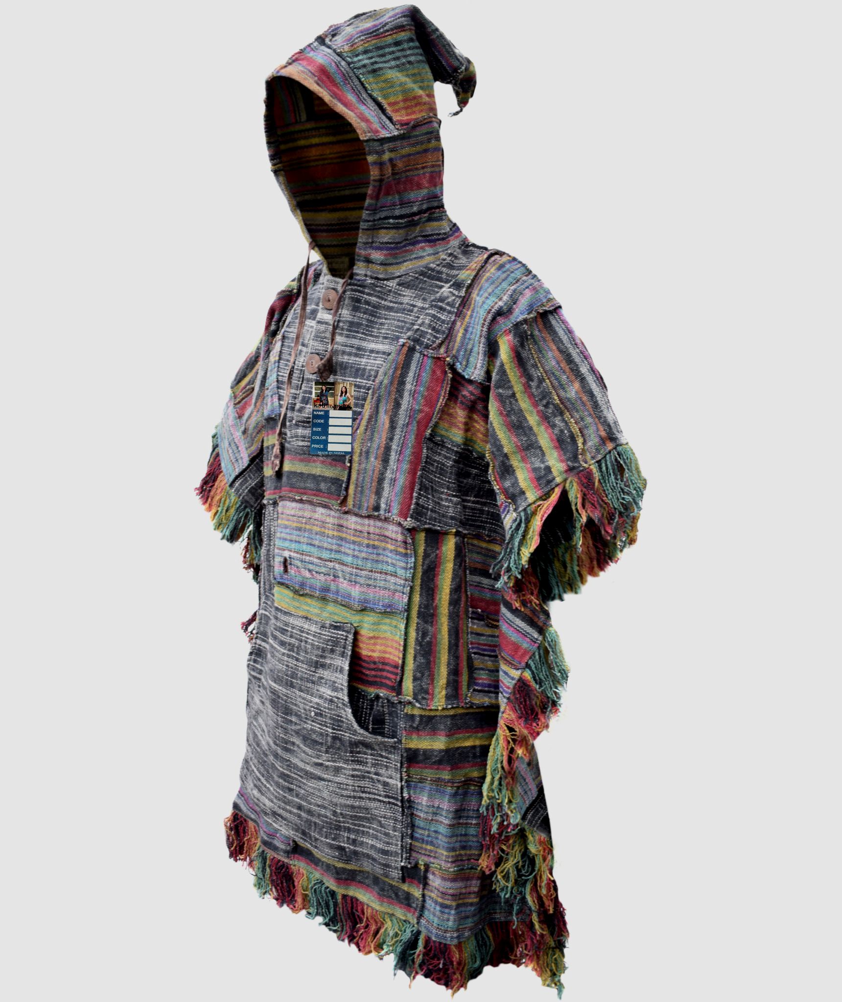 This multi colored poncho has a hoodie with drawstring. There are two deep front pockets. It has three button design at the front neck. It is designed to look fashionable as well as to provide warmth remaining breathable and comfortable. The hem has fringes making it even more beautiful. It has openings as sleeves and a drawstring that can be pulled and tie a knot at front or can be left as it is.