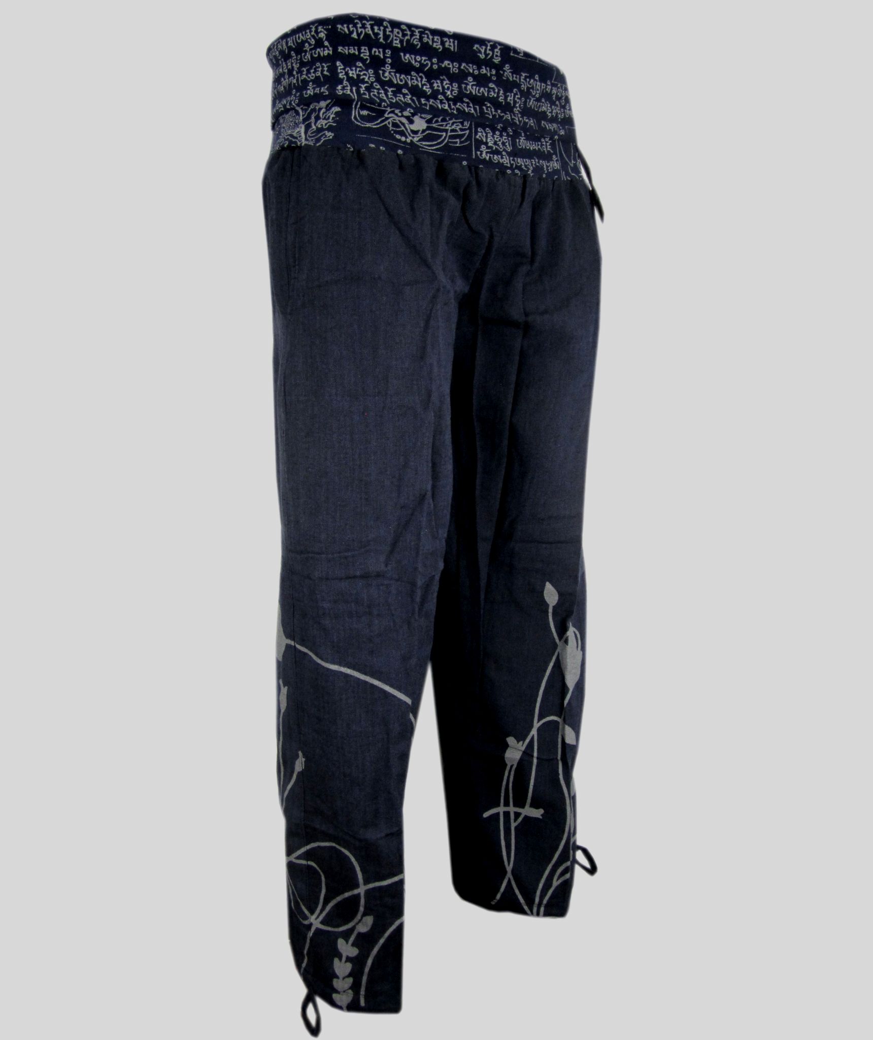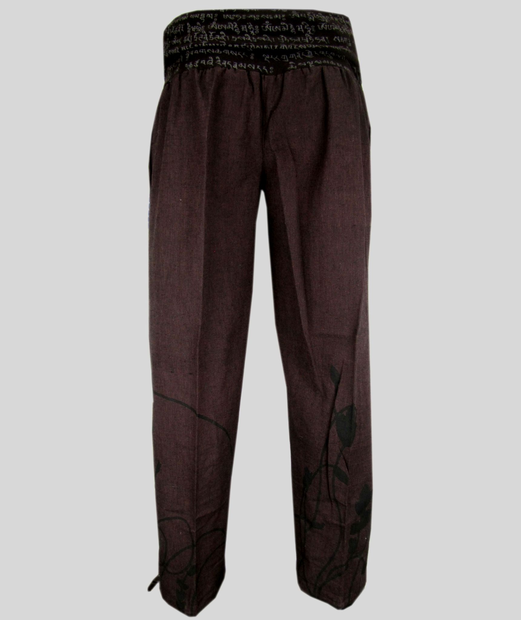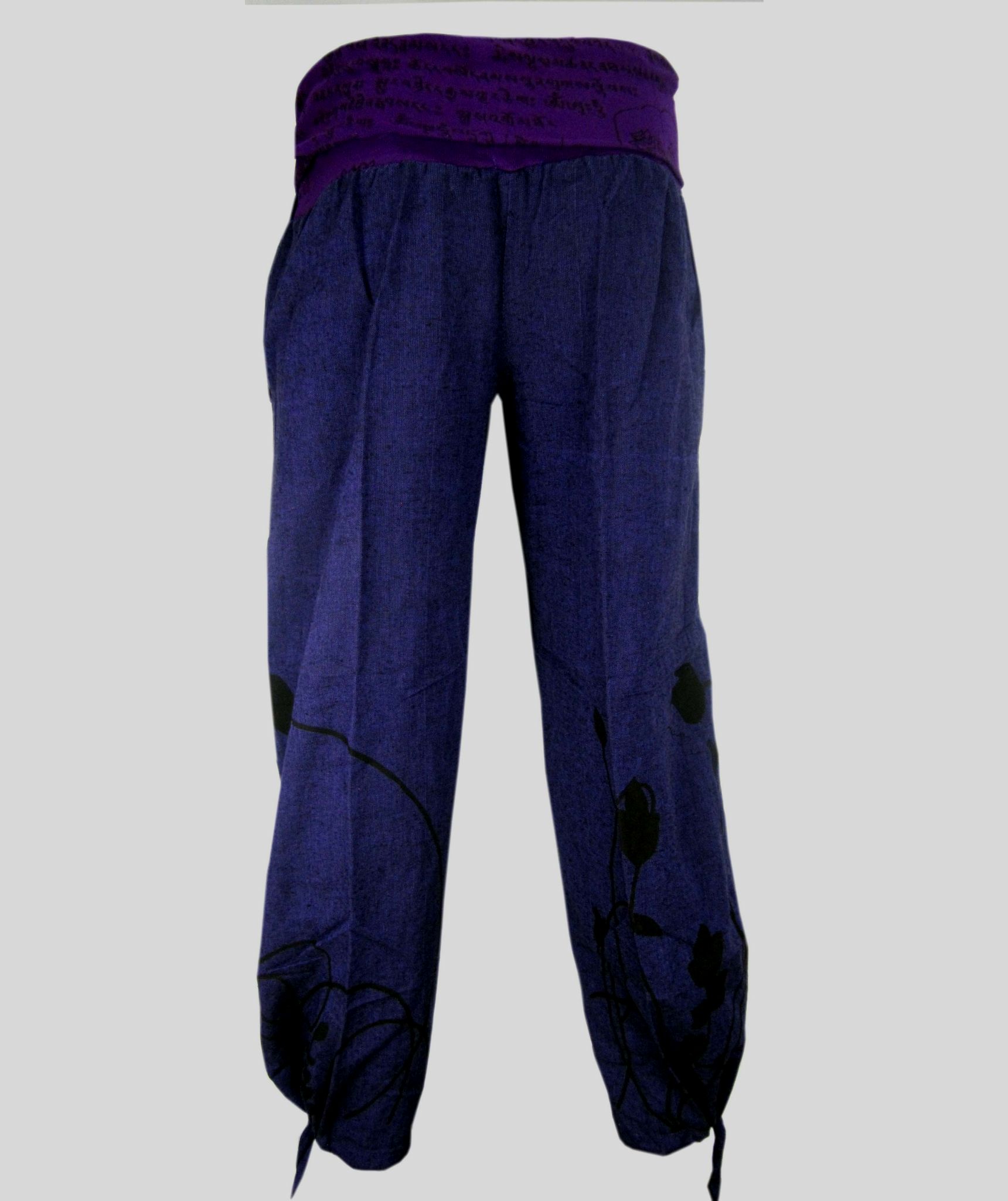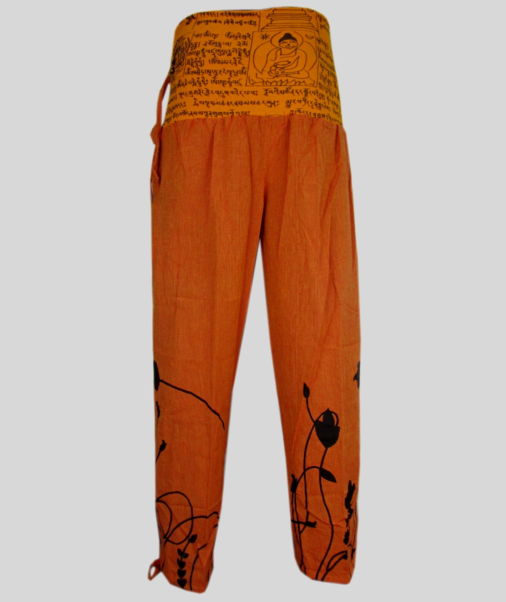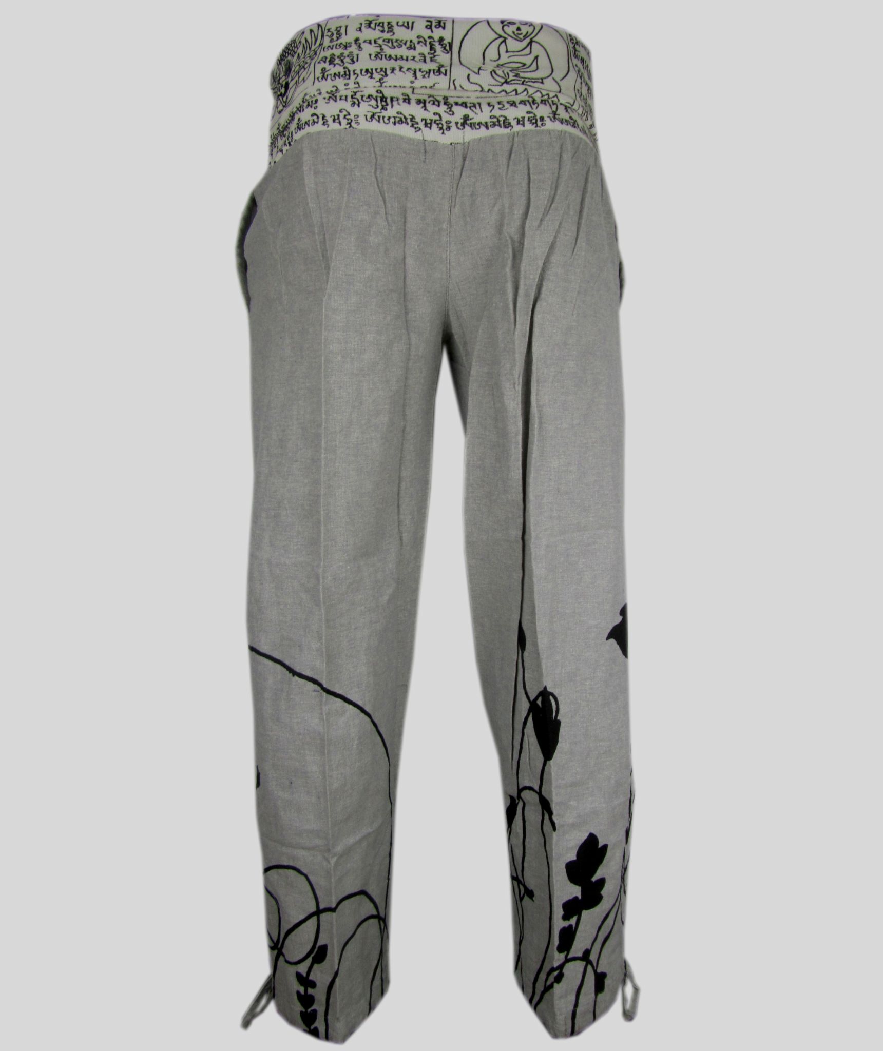 These are cotton hemp loose trousers with high waist. They have drawstring at the side waist and ankle. There is various Mantra printed on waist and floral pattern at the hem part. There are 2 side pockets and the trousers can be folded at the waist to decrease its length. The ankle has drawstring to make it narrow.