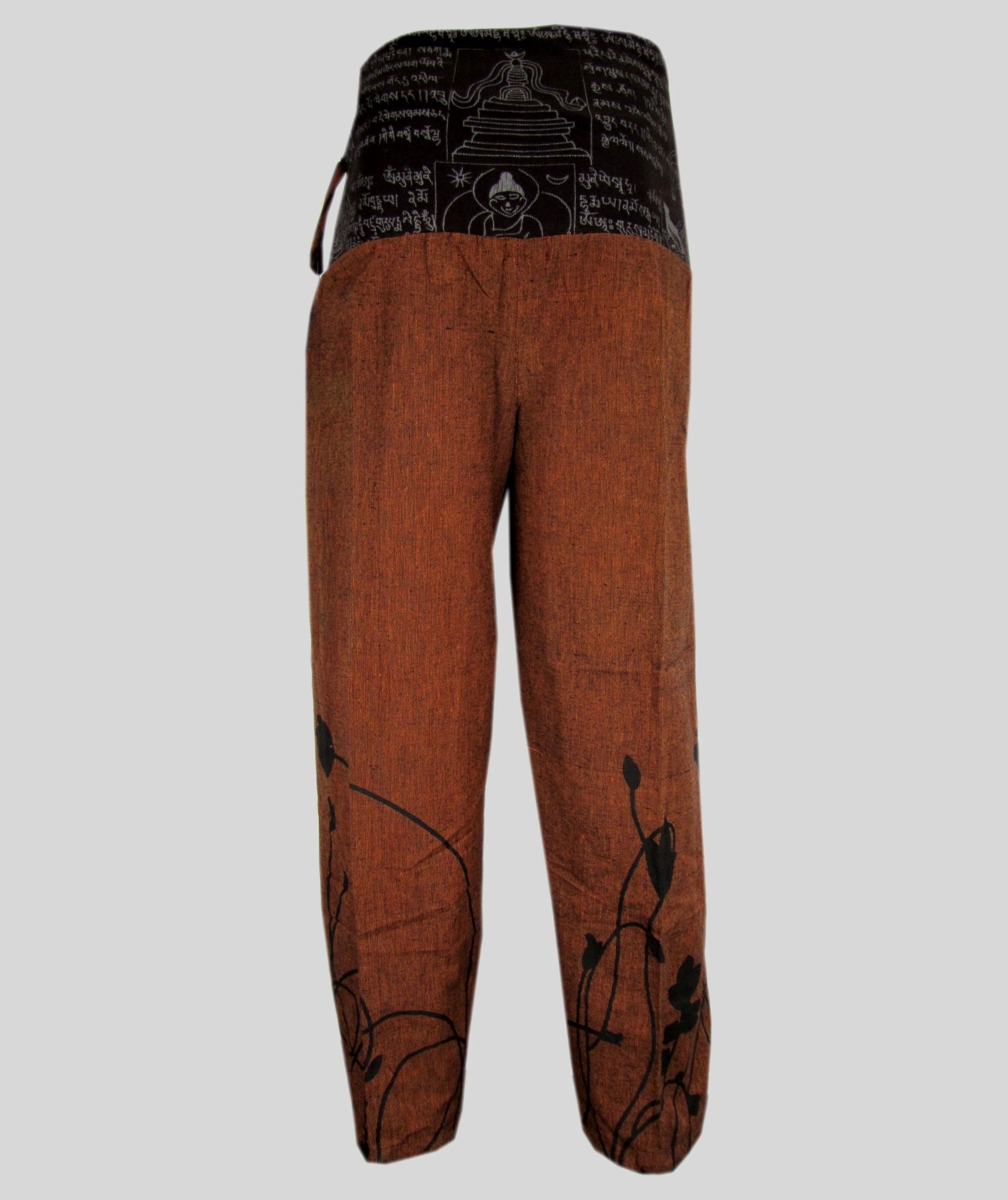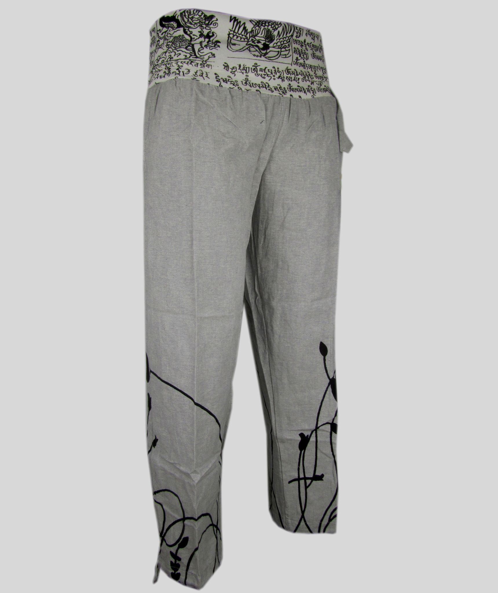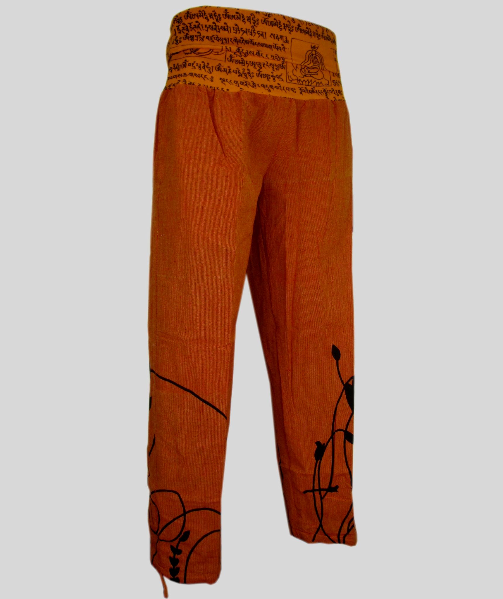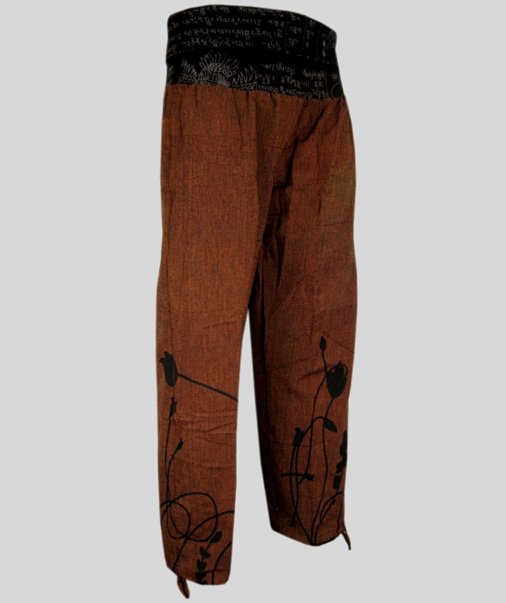 These are cotton hemp loose trousers with high waist. They have drawstring at the side waist and ankle. There is various Mantra printed on waist and floral pattern at the hem part. There are 2 side pockets and the trousers can be folded at the waist to decrease its length. The ankle has drawstring to make it narrow.