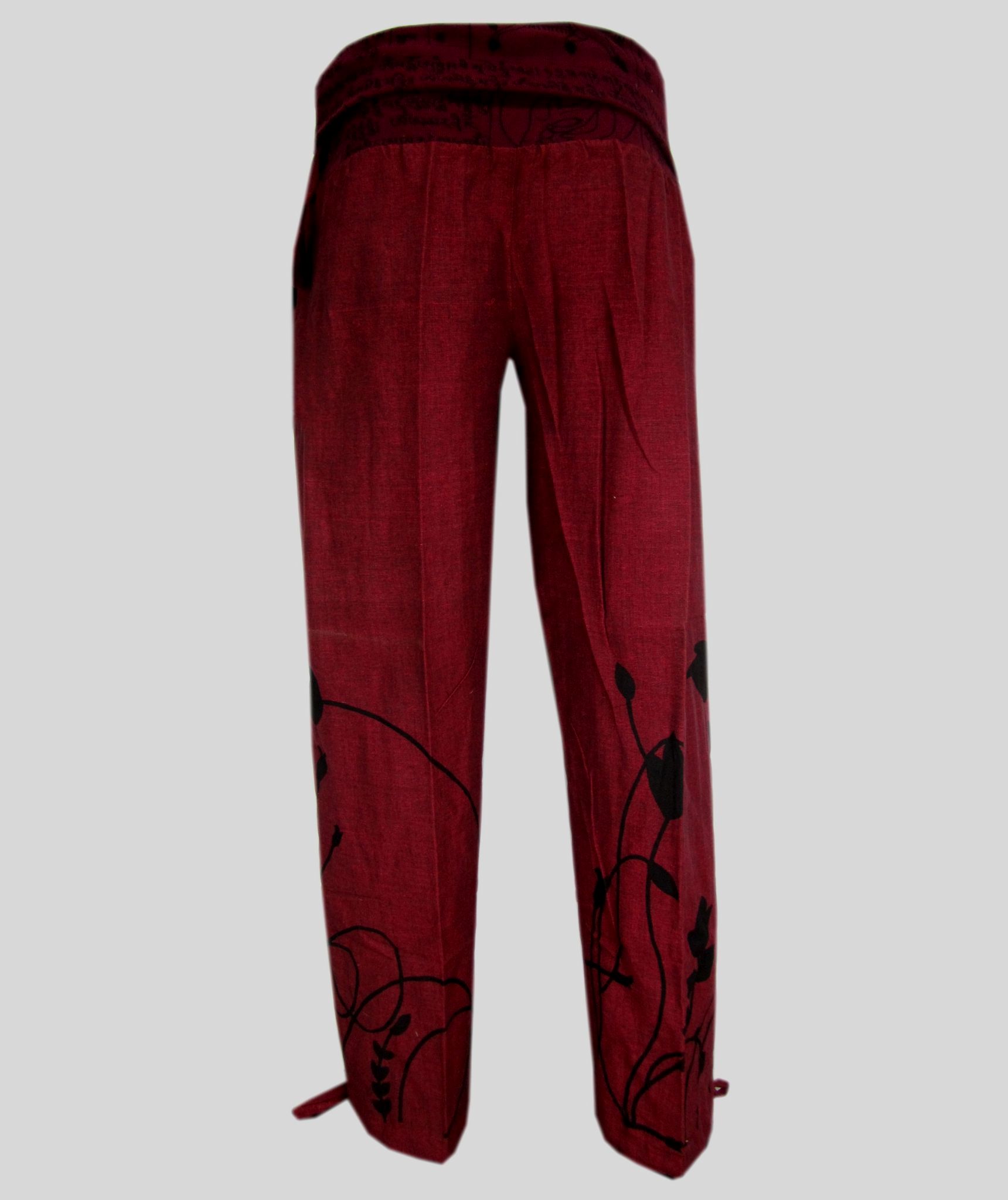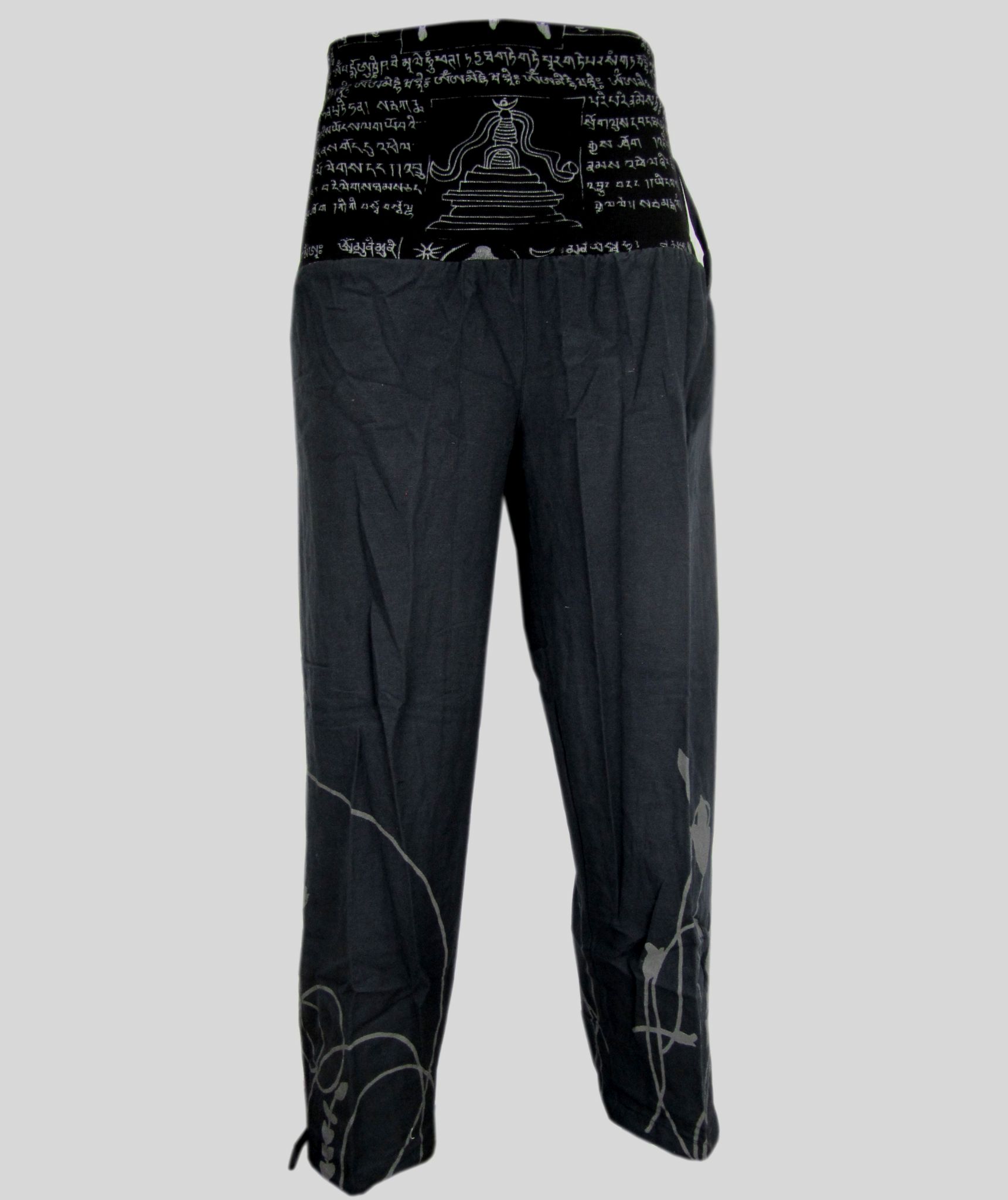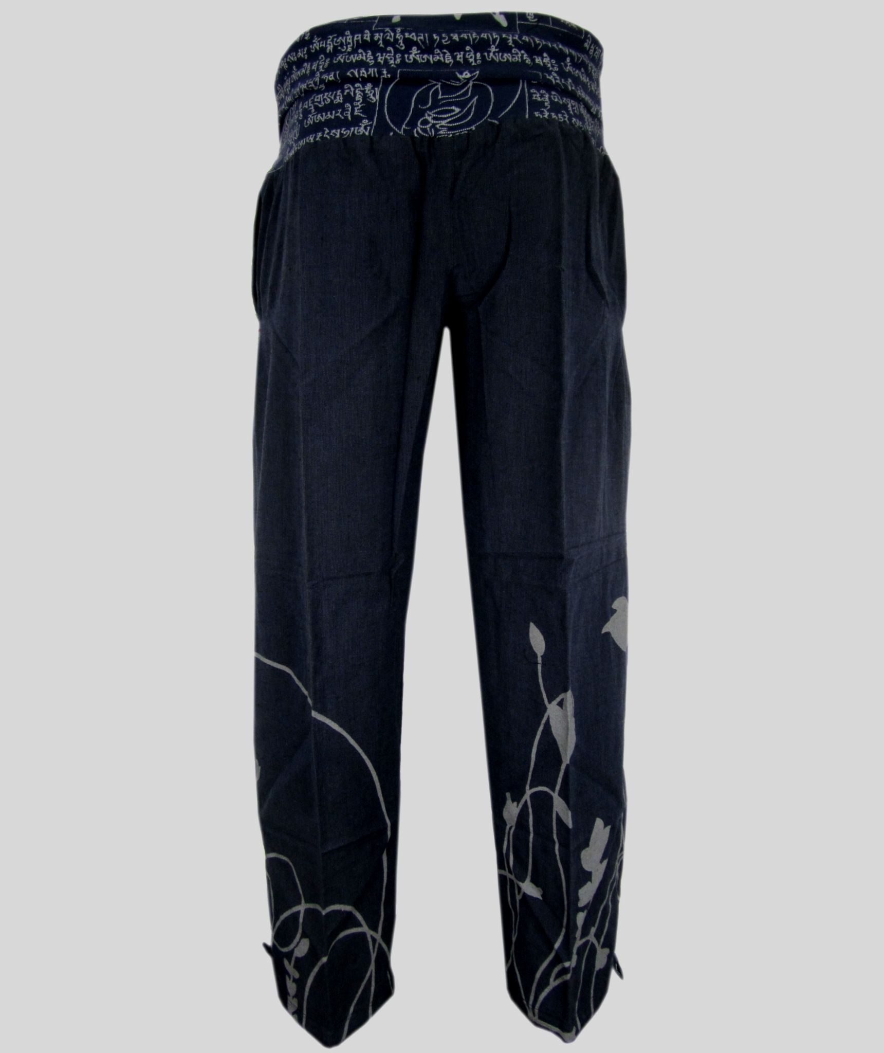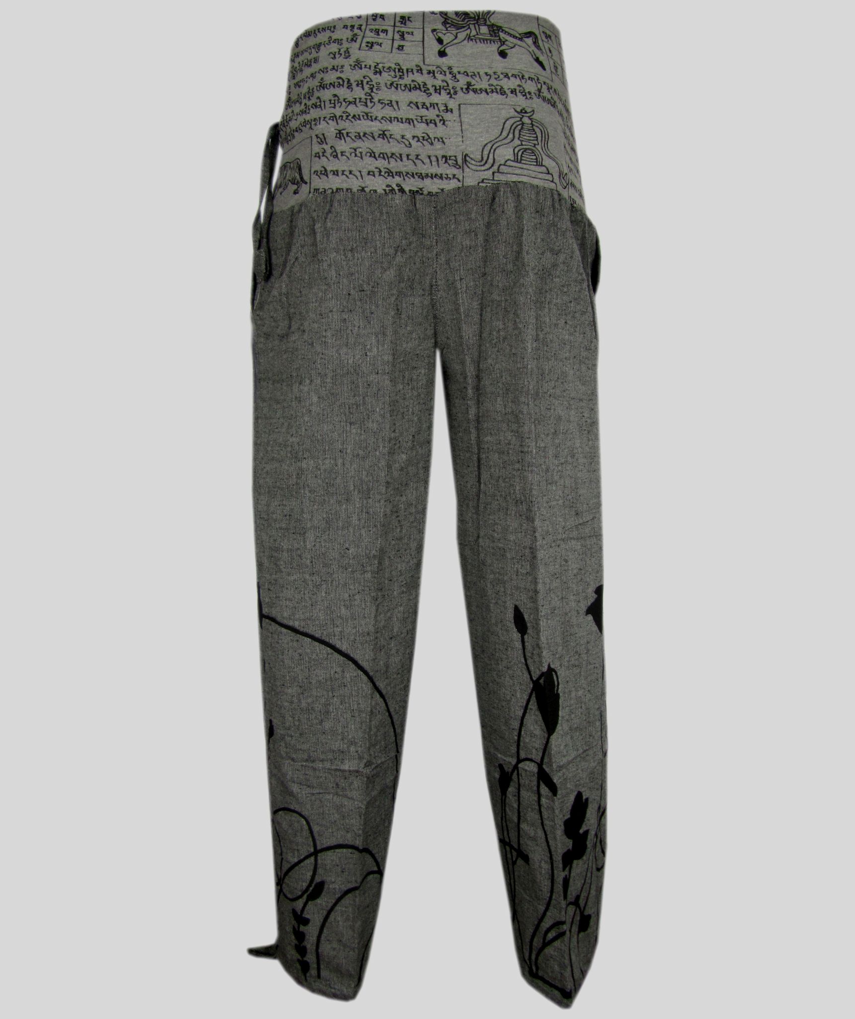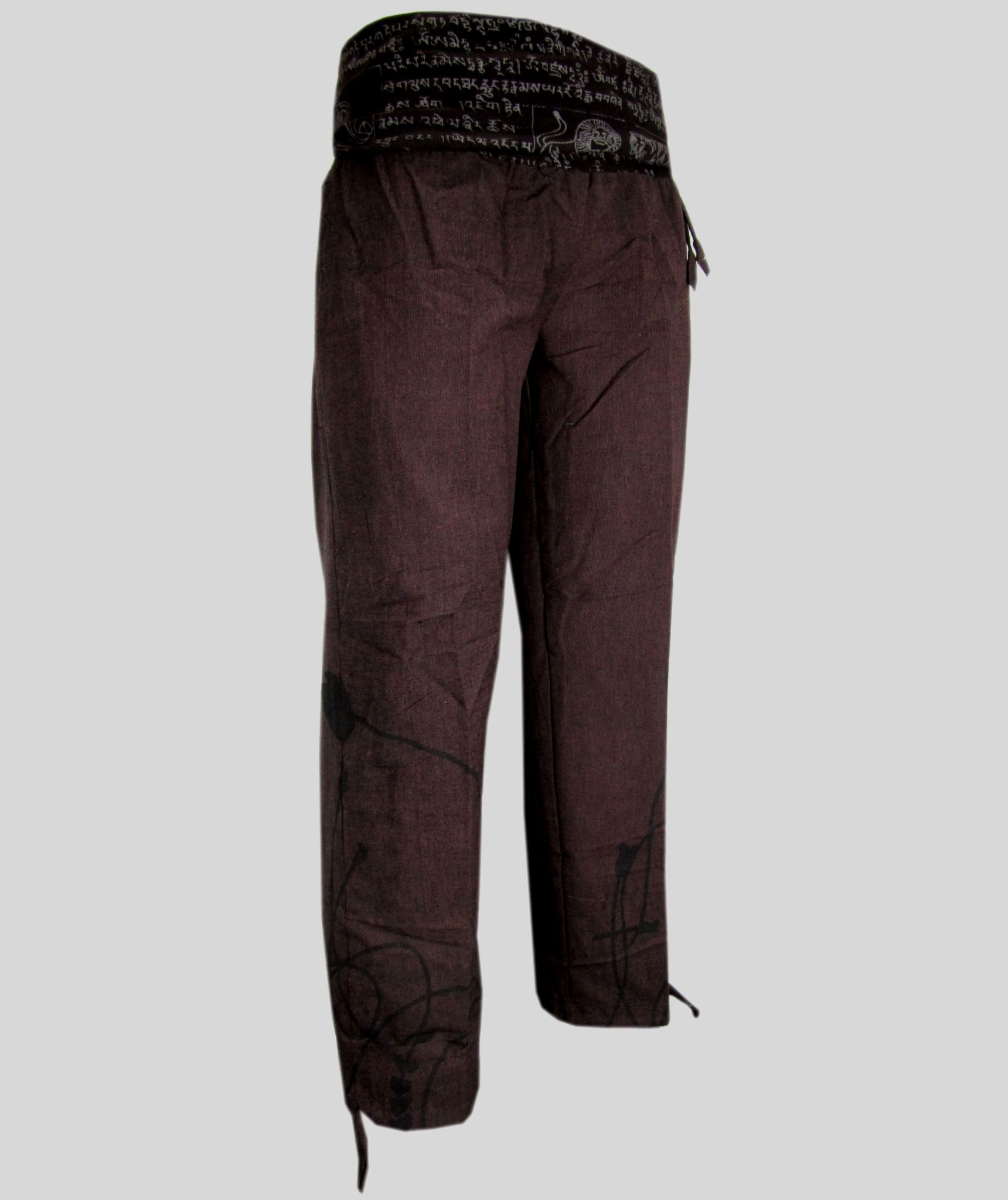 These are cotton hemp loose trousers with high waist. They have drawstring at the side waist and ankle. There is various Mantra printed on waist and floral pattern at the hem part. There are 2 side pockets and the trousers can be folded at the waist to decrease its length. The ankle has drawstring to make it narrow.