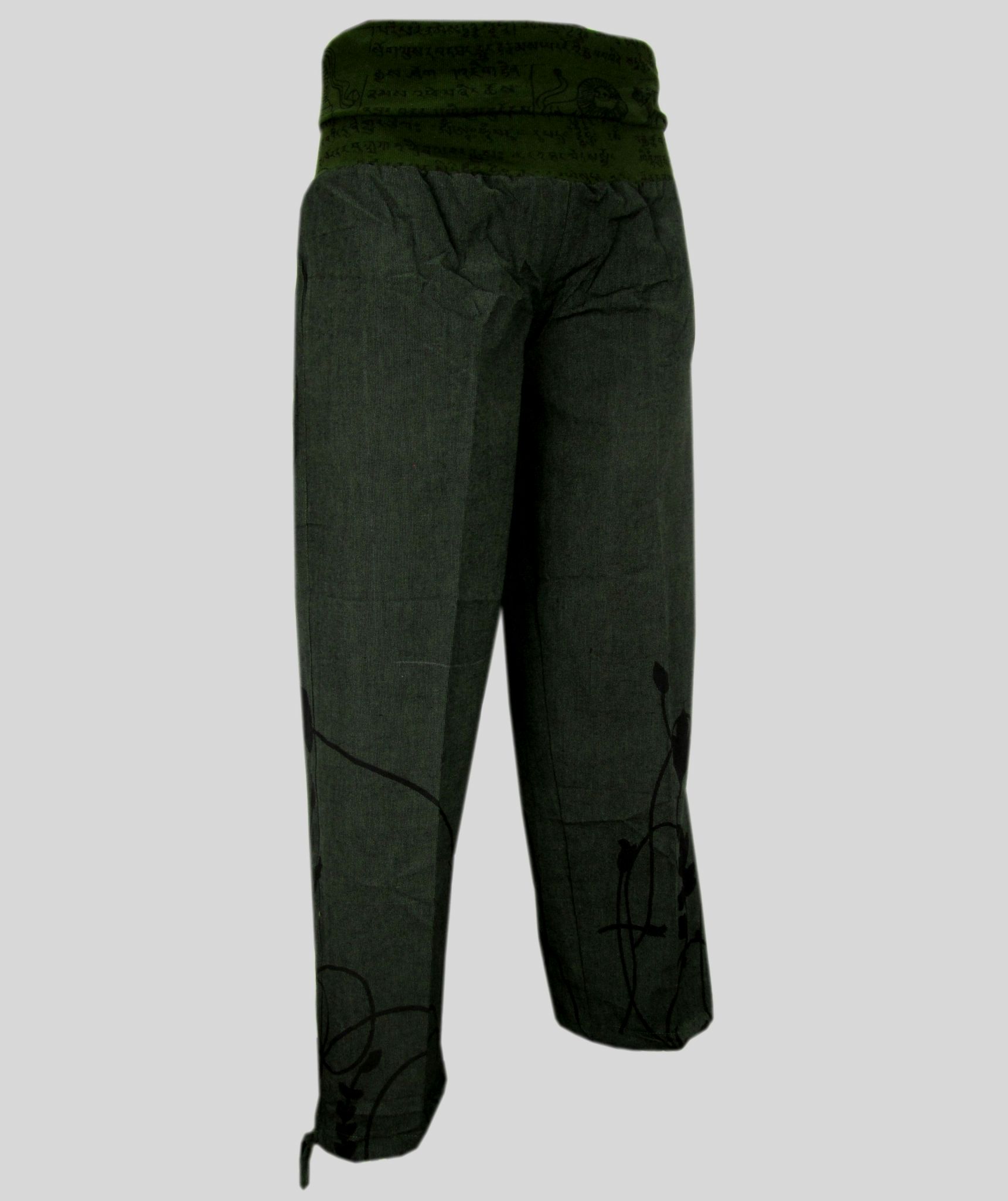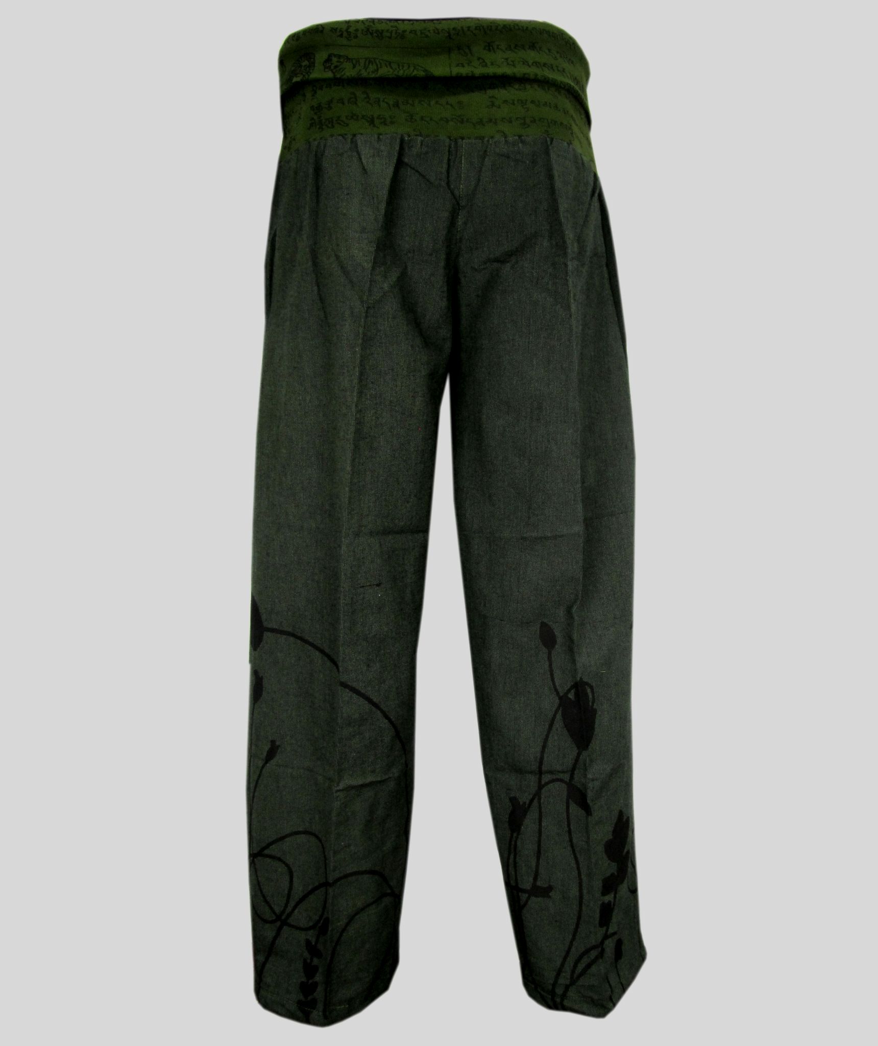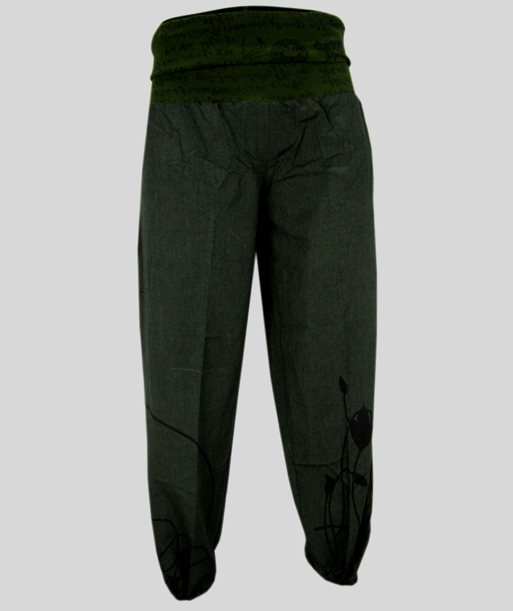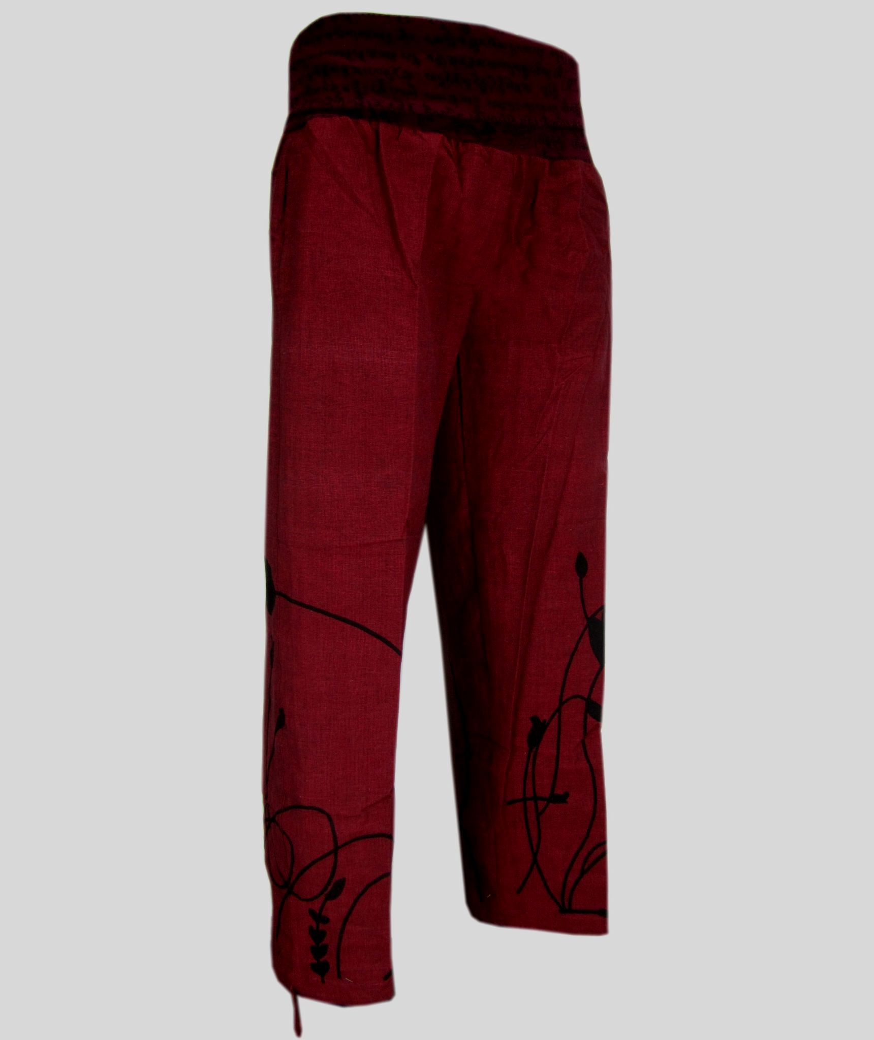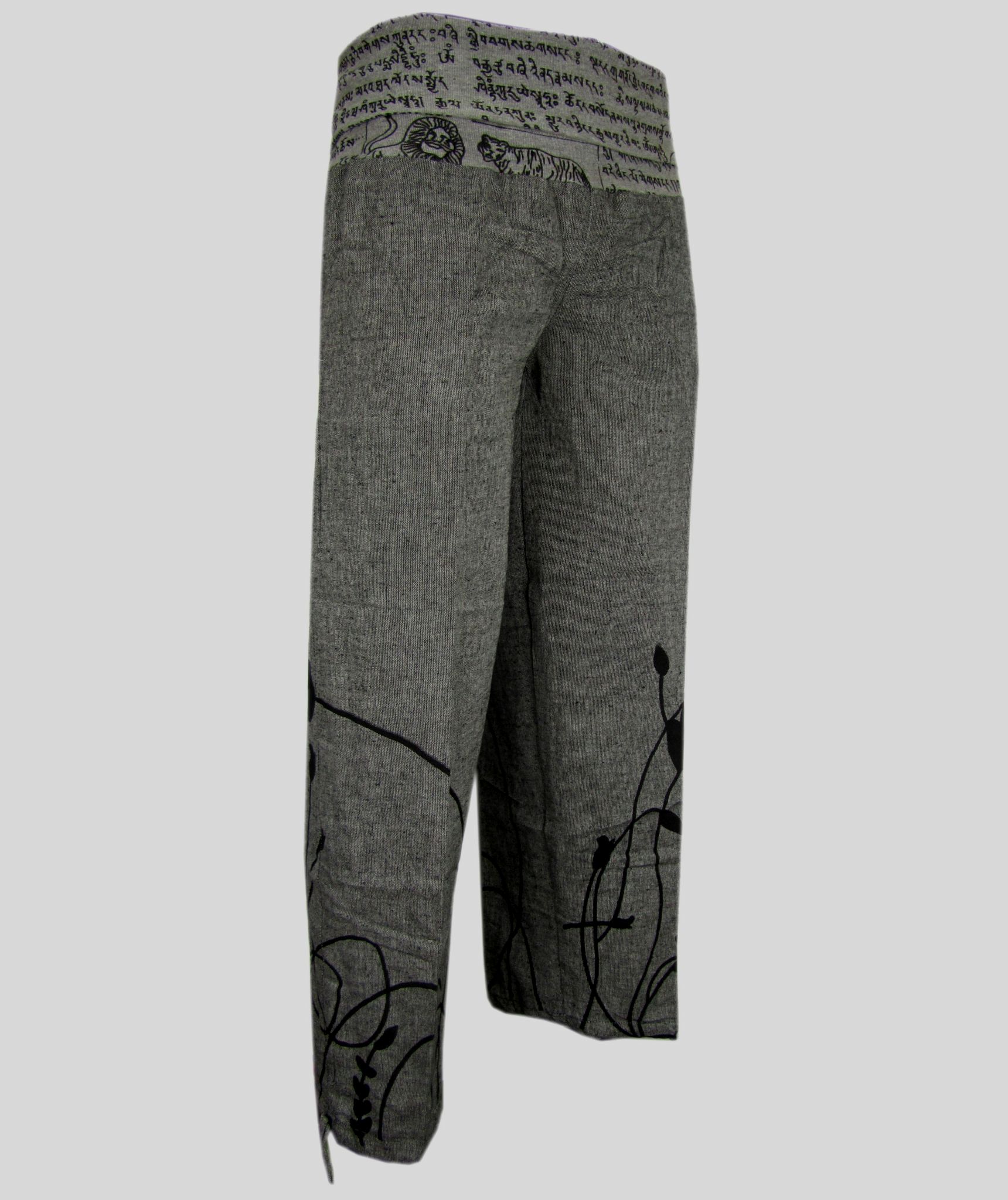 These are cotton hemp loose trousers with high waist. They have drawstring at the side waist and ankle. There is various Mantra printed on waist and floral pattern at the hem part. There are 2 side pockets and the trousers can be folded at the waist to decrease its length. The ankle has drawstring to make it narrow.