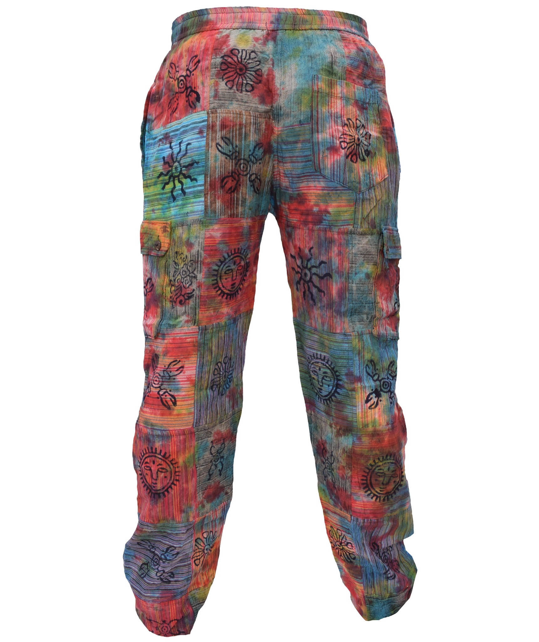 Tie dye patchwork design with a variety of tribal symbols. Colorful and vibrant with multi colored patches of different colors joined together.