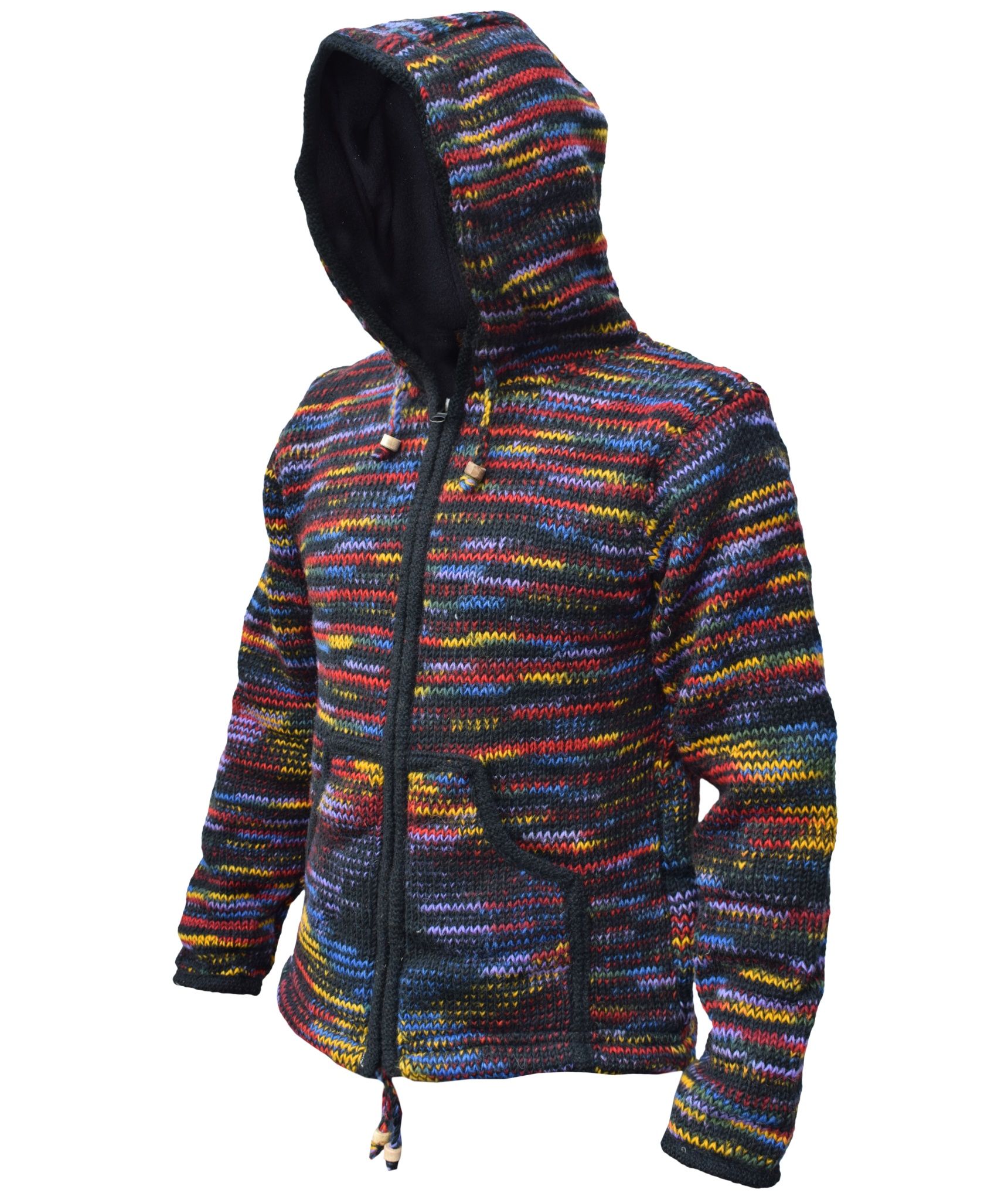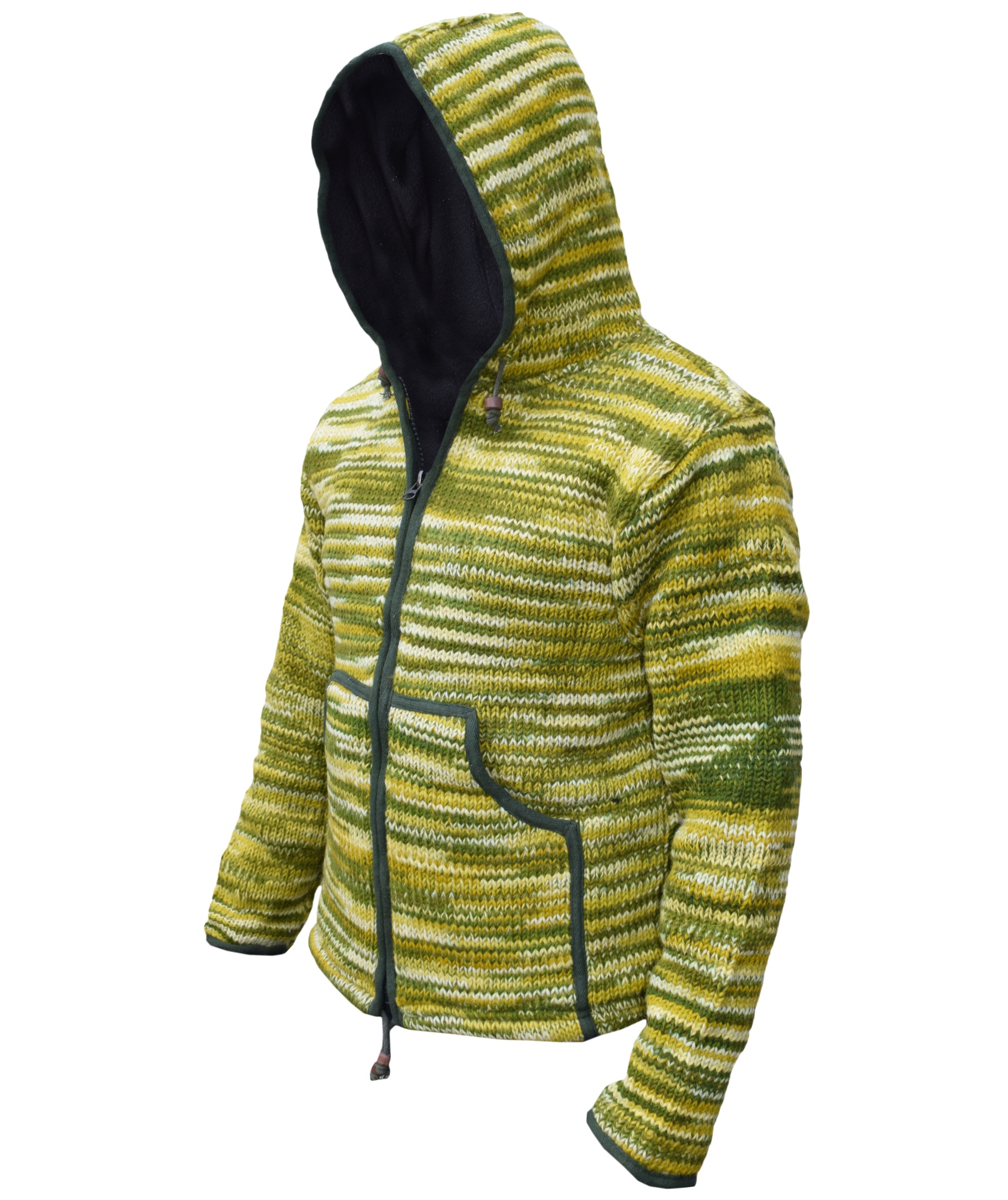 This woolen jacket has two front pockets and an inner breast pocket at one side. It is hooded jacket with hood and bottom hem provided with a drawstring that has wooden beads. It has full front zip fastening. It is fleece lined that makes this jacket more suitable for chilling weather. They are made from tie dyed material. Tie dye is the process of folding, twisting, pleating or crumpling fabric or a garment and the fabric for these jackets are made from this process.