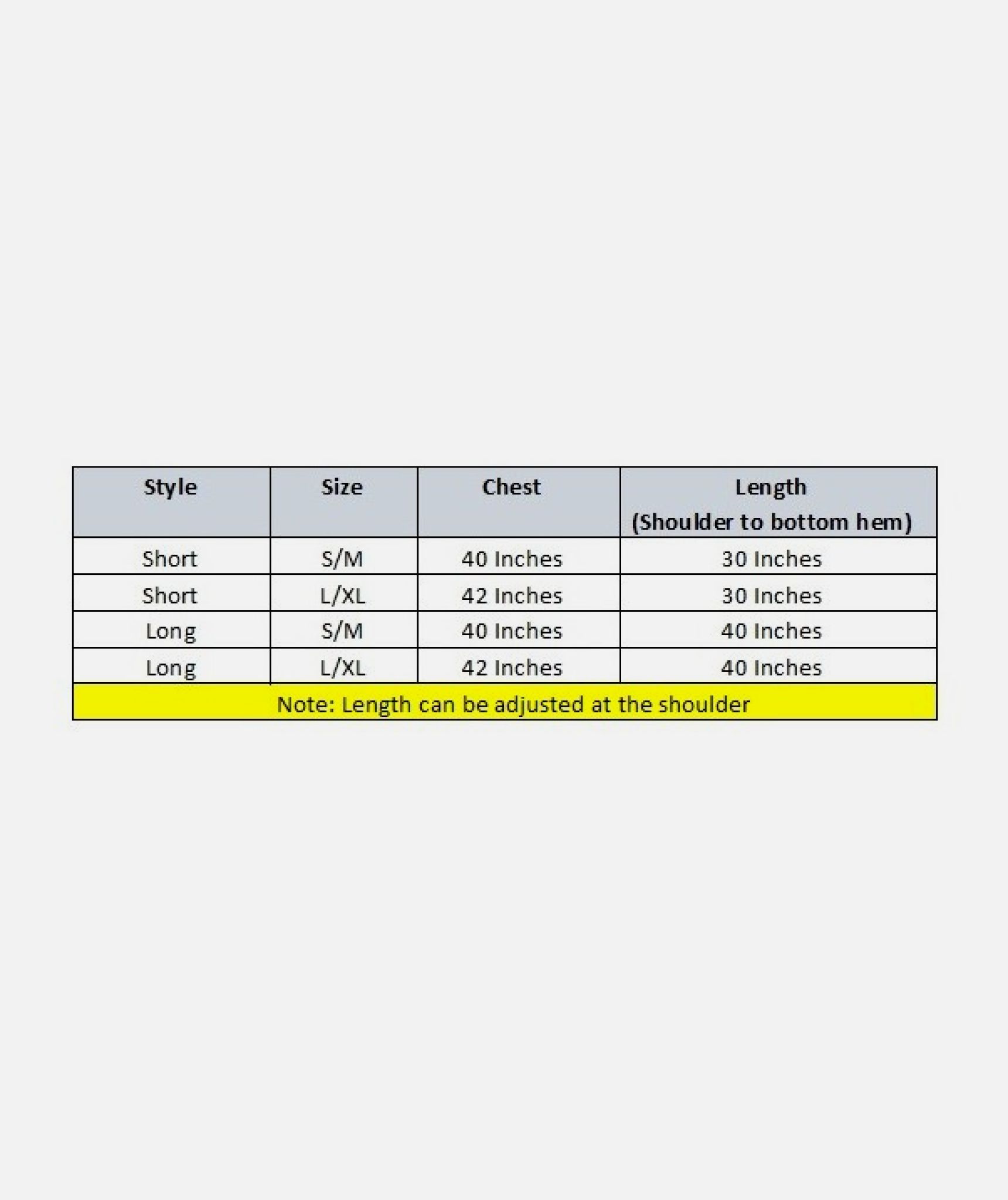 Adjustable length from the shoulder with wooden buttons. Front and side pockets.
