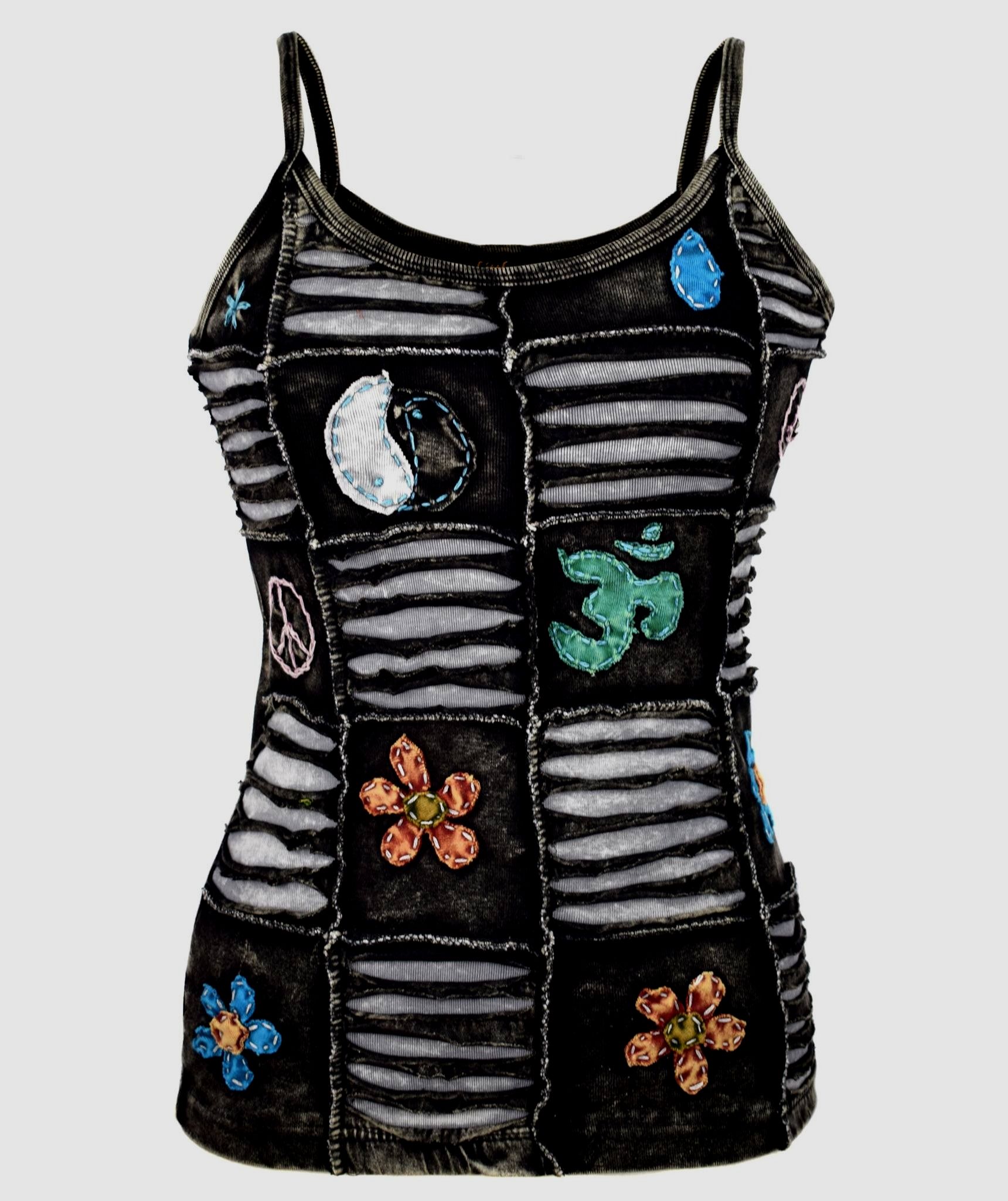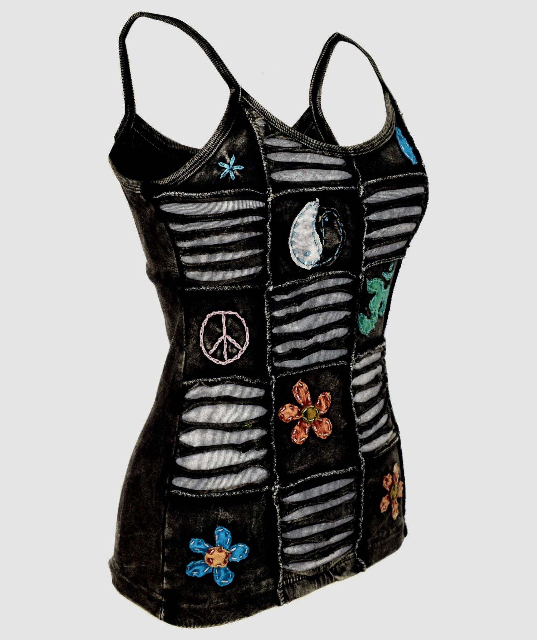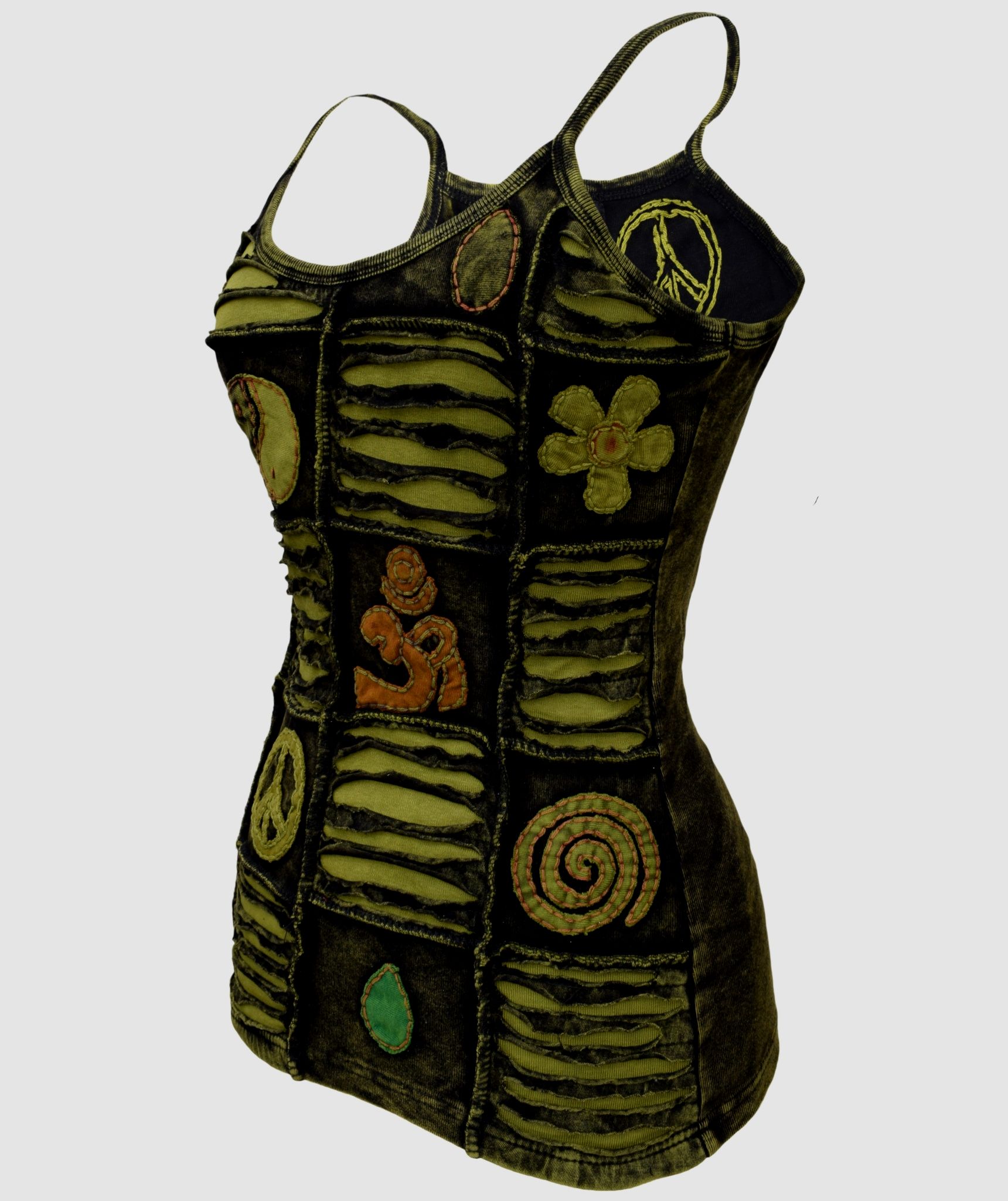 S/M: chest- 24 (stretches up to 5 inches), length from top of strap to bottom hem-25 inches approx.