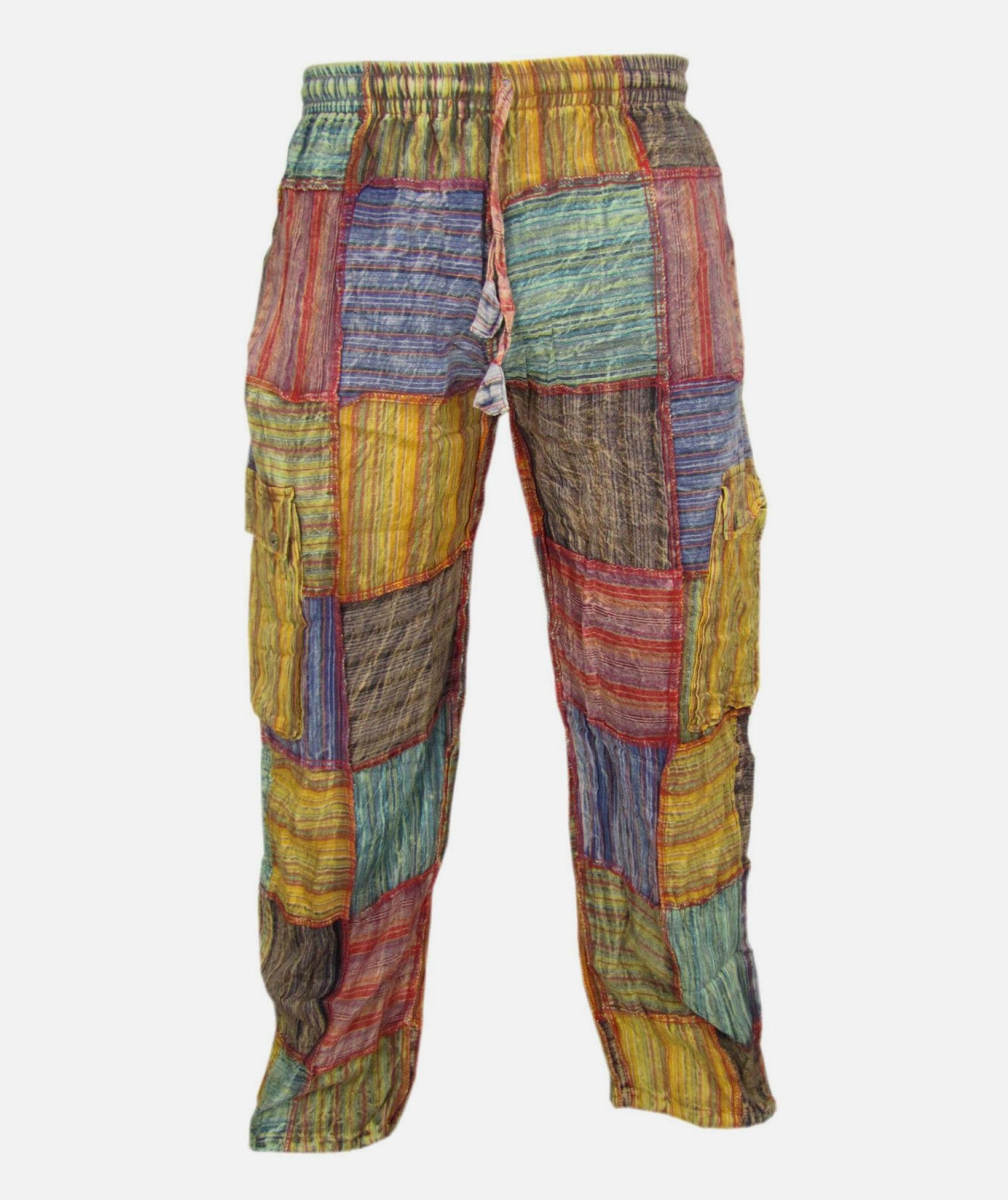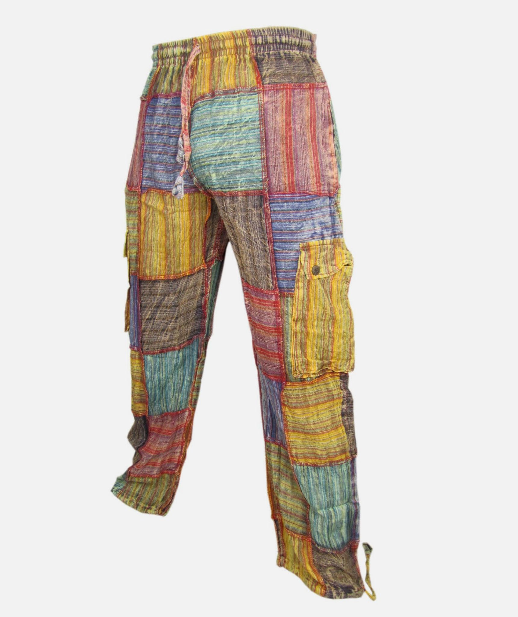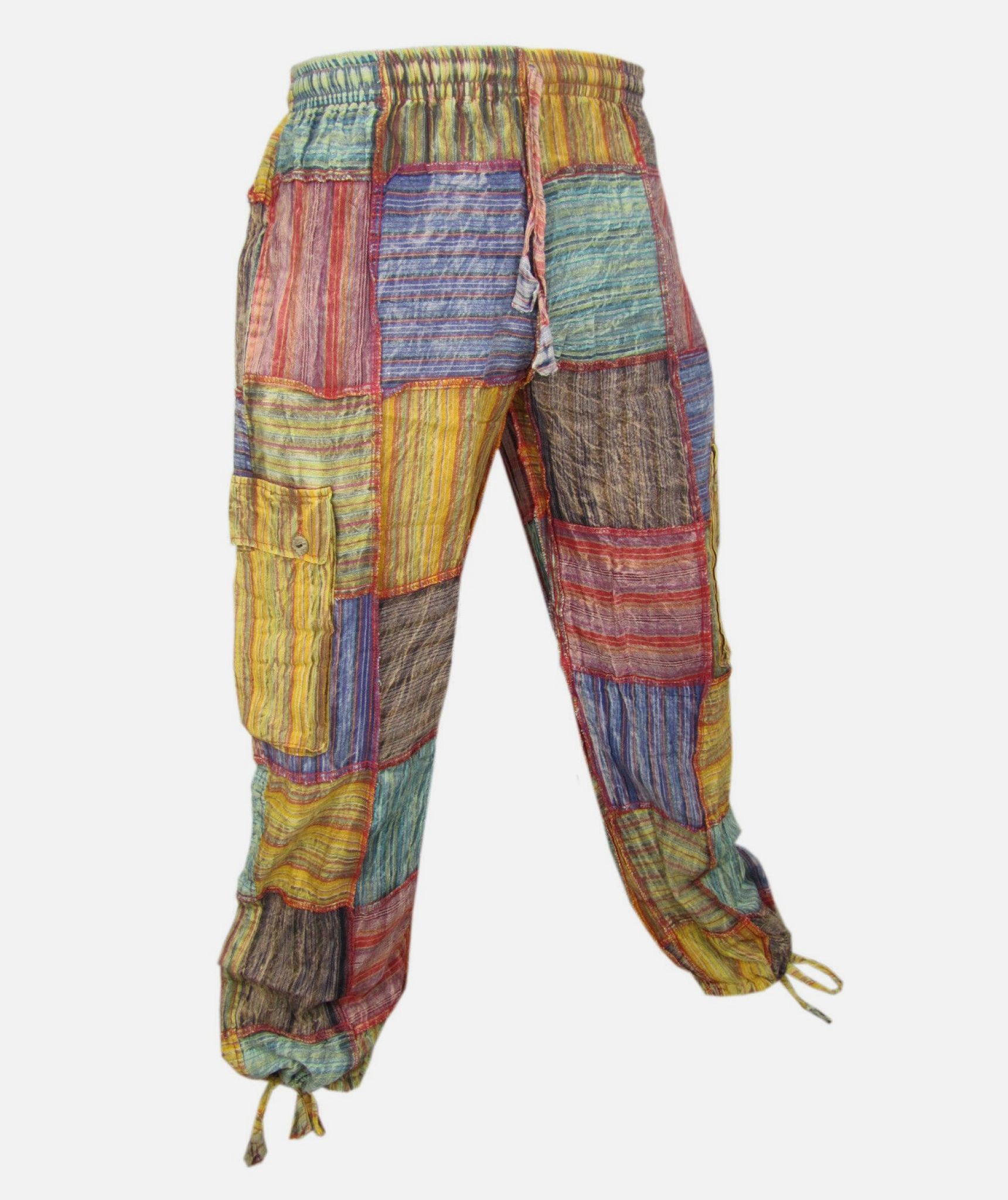Straight trousers are made from100% cotton. They are designed for casual and lounge wear. These are patchwork trousers with patches having different stripy fabrics.They have 2 side pockets, 2 side buttoned pockets at lower thigh region and elastic waist with a drawstring. They also have drawstring at the hem so that they can have narrow ankles. These trousers may be exactly what you are looking for to get comfy as well as stylish looks.