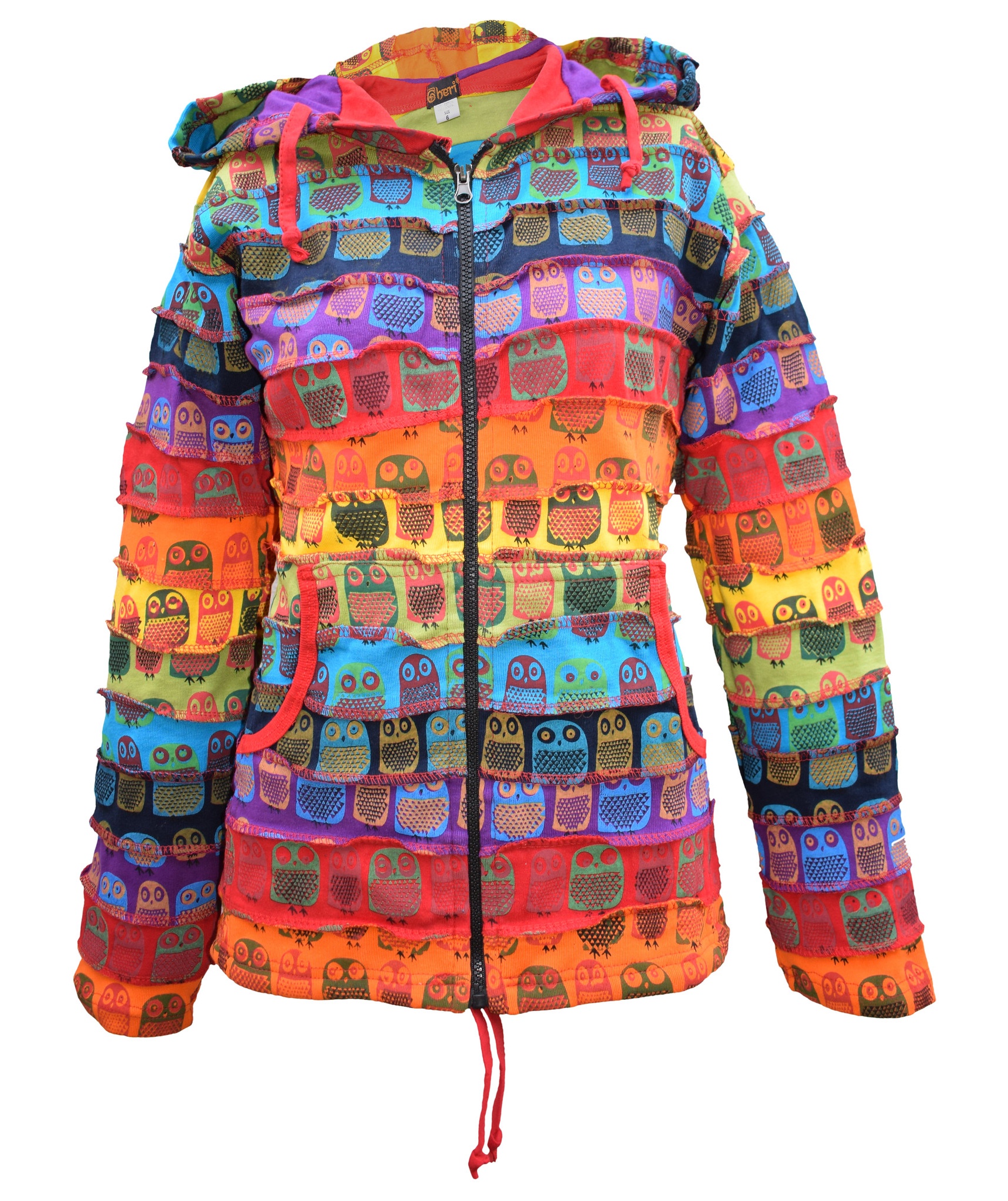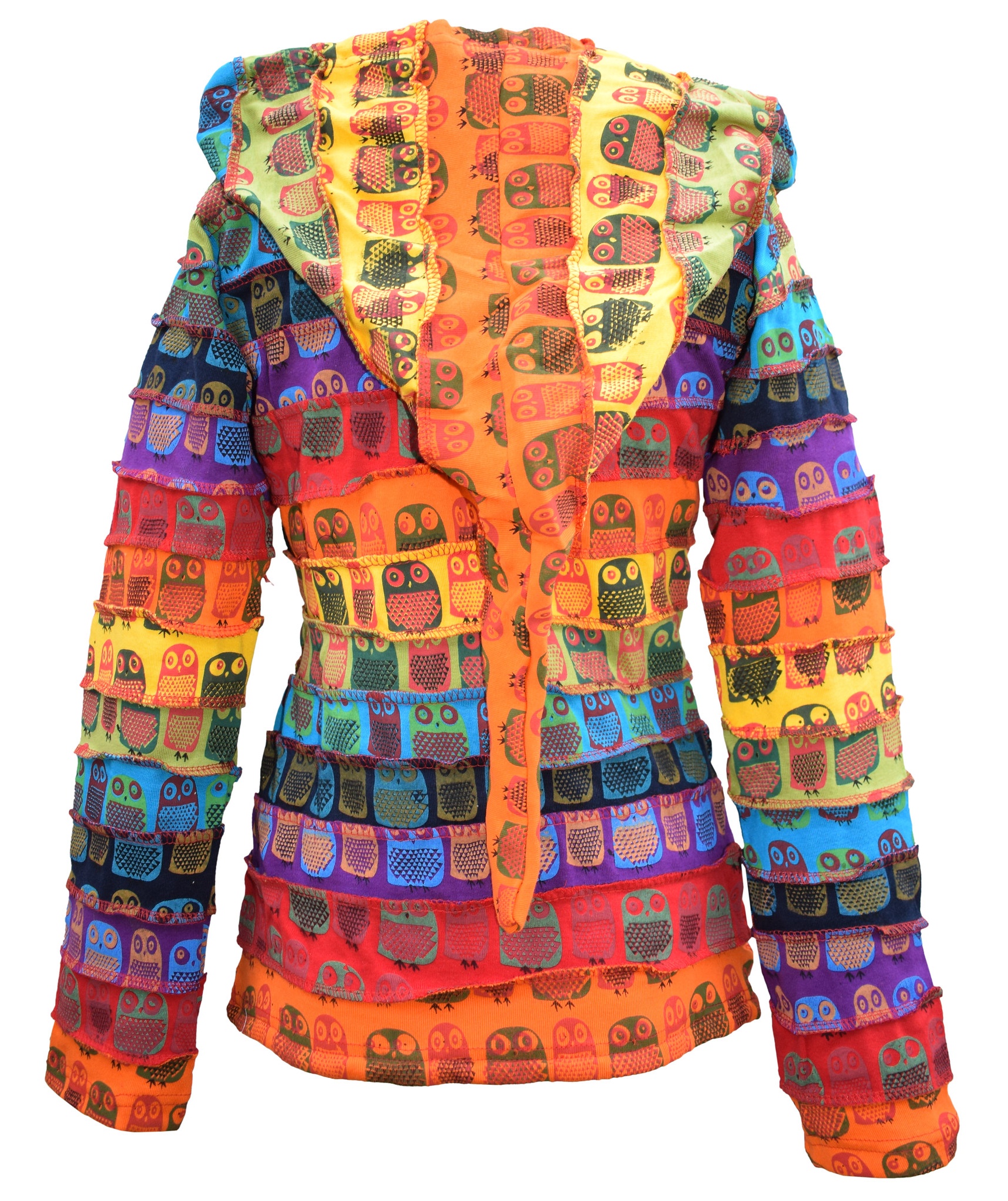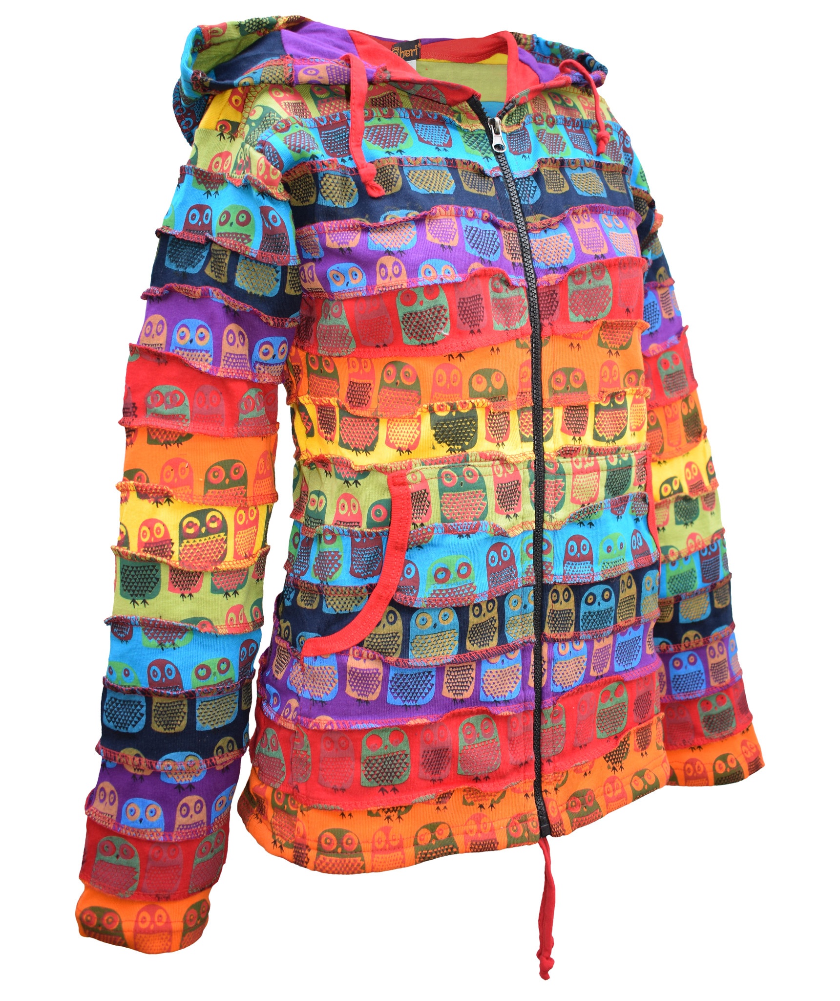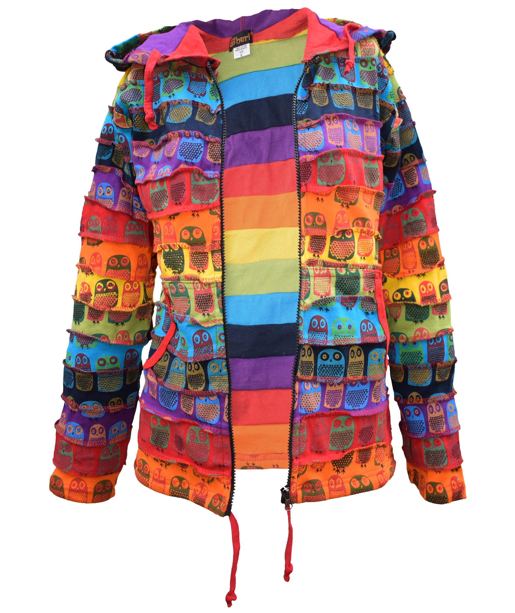 Cotton rainbow striped ribs jackets with owl print. They have got full length front zip fastening. There are two deep front pockets. Drawstring is provided to the hem and hoodie for size adjustment. They have long elf pointed hood. They are hand made and every details are provided with special care.