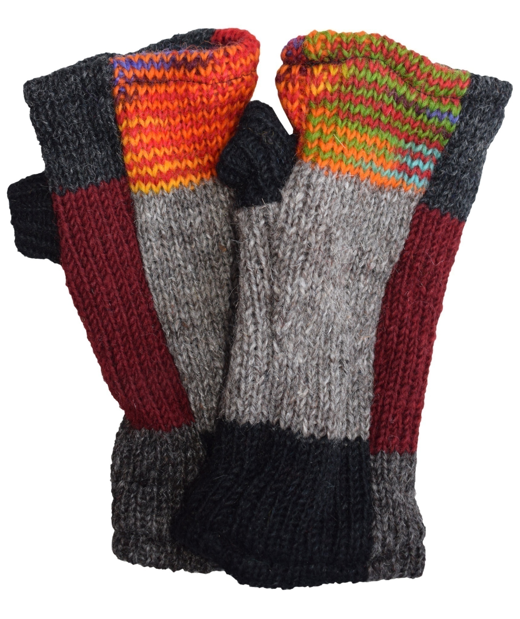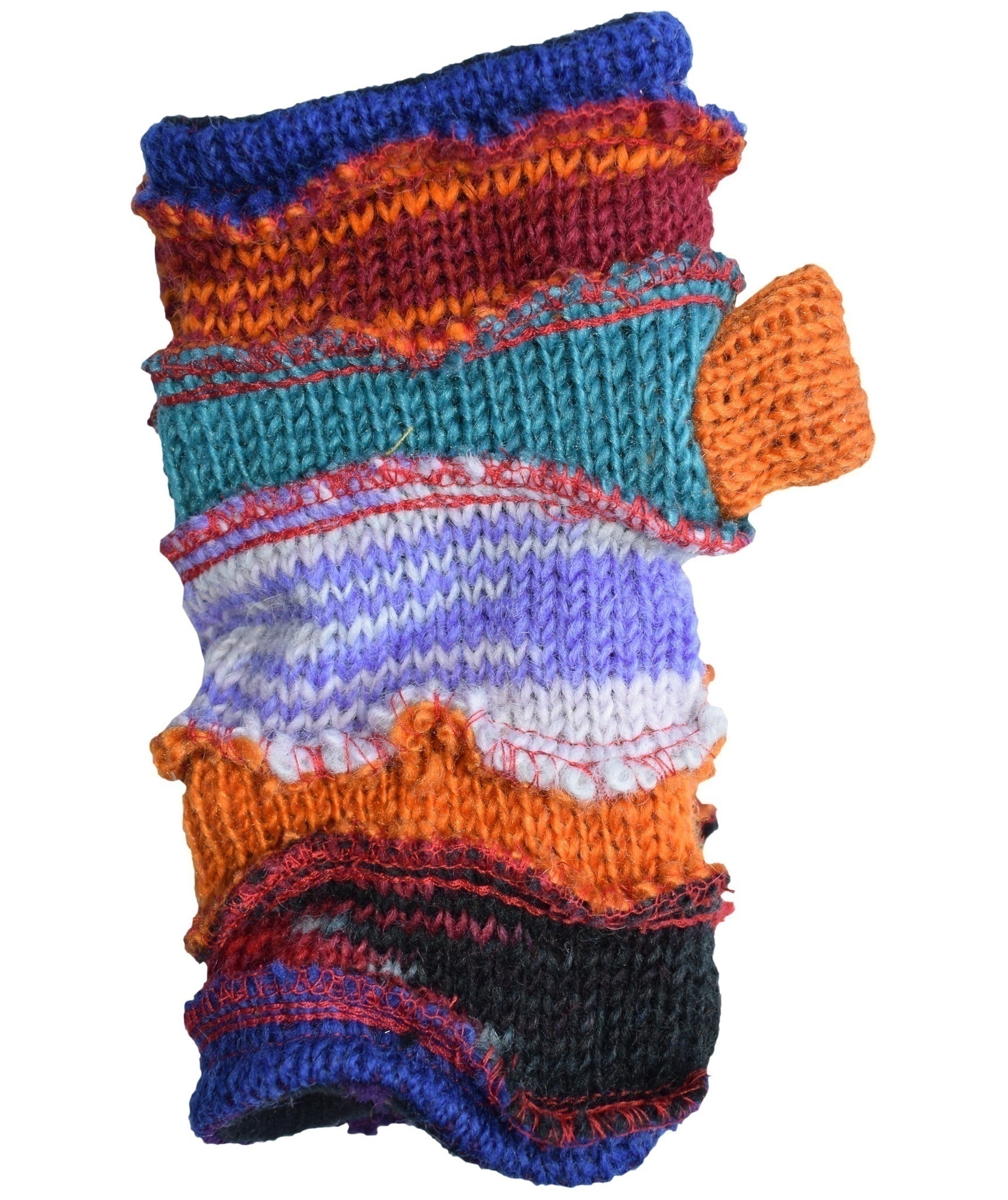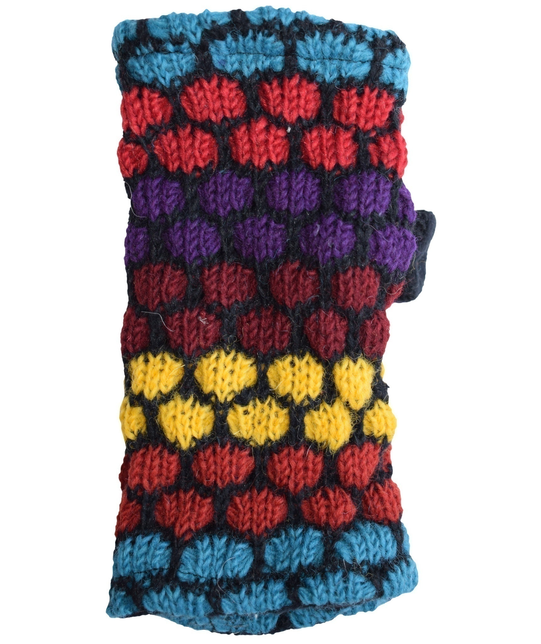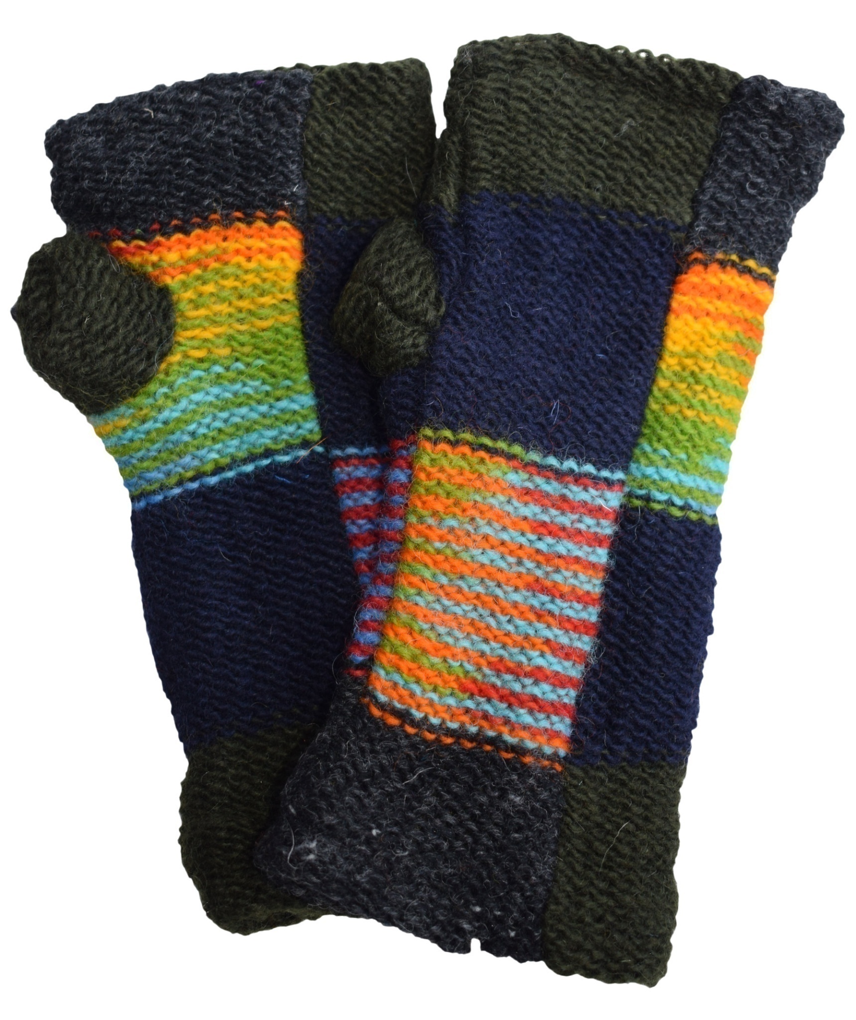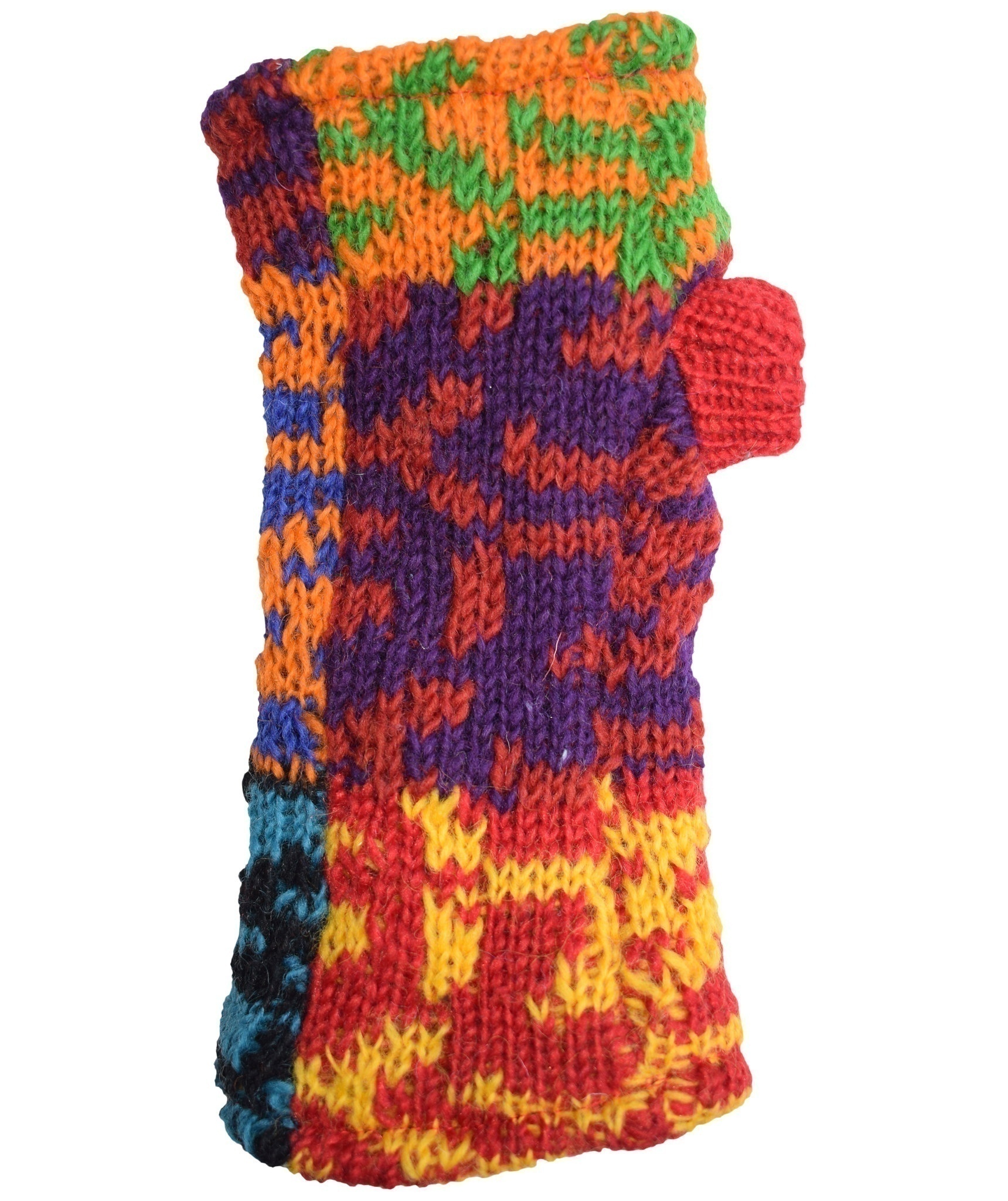 Multicolored fingerless long mittens with 2 separate sections for thumb and other fingers