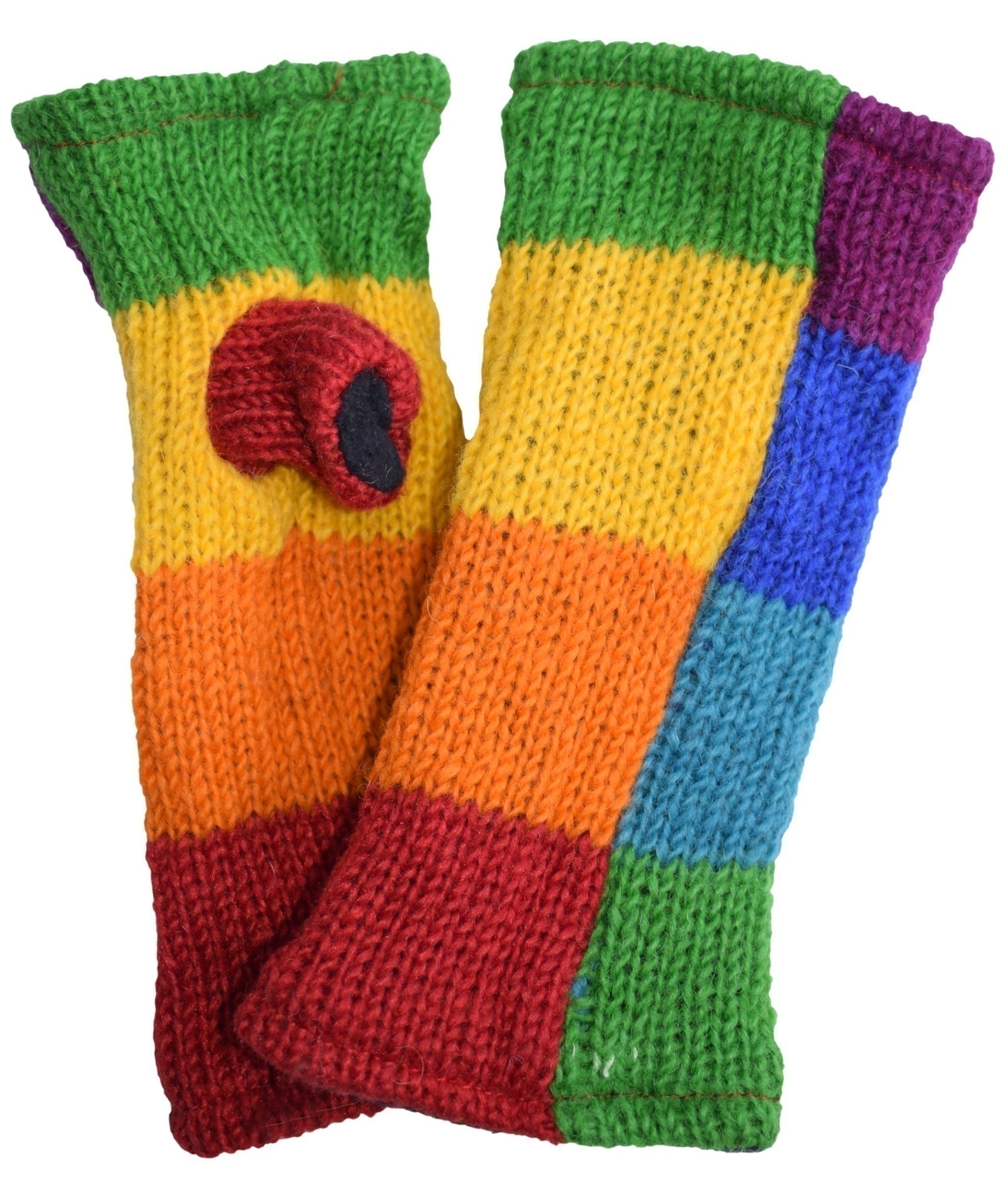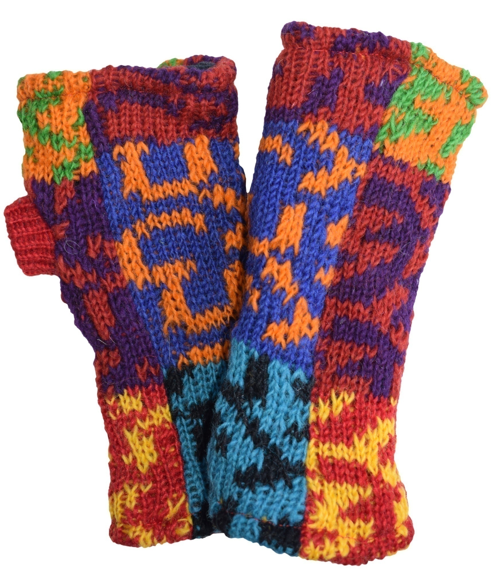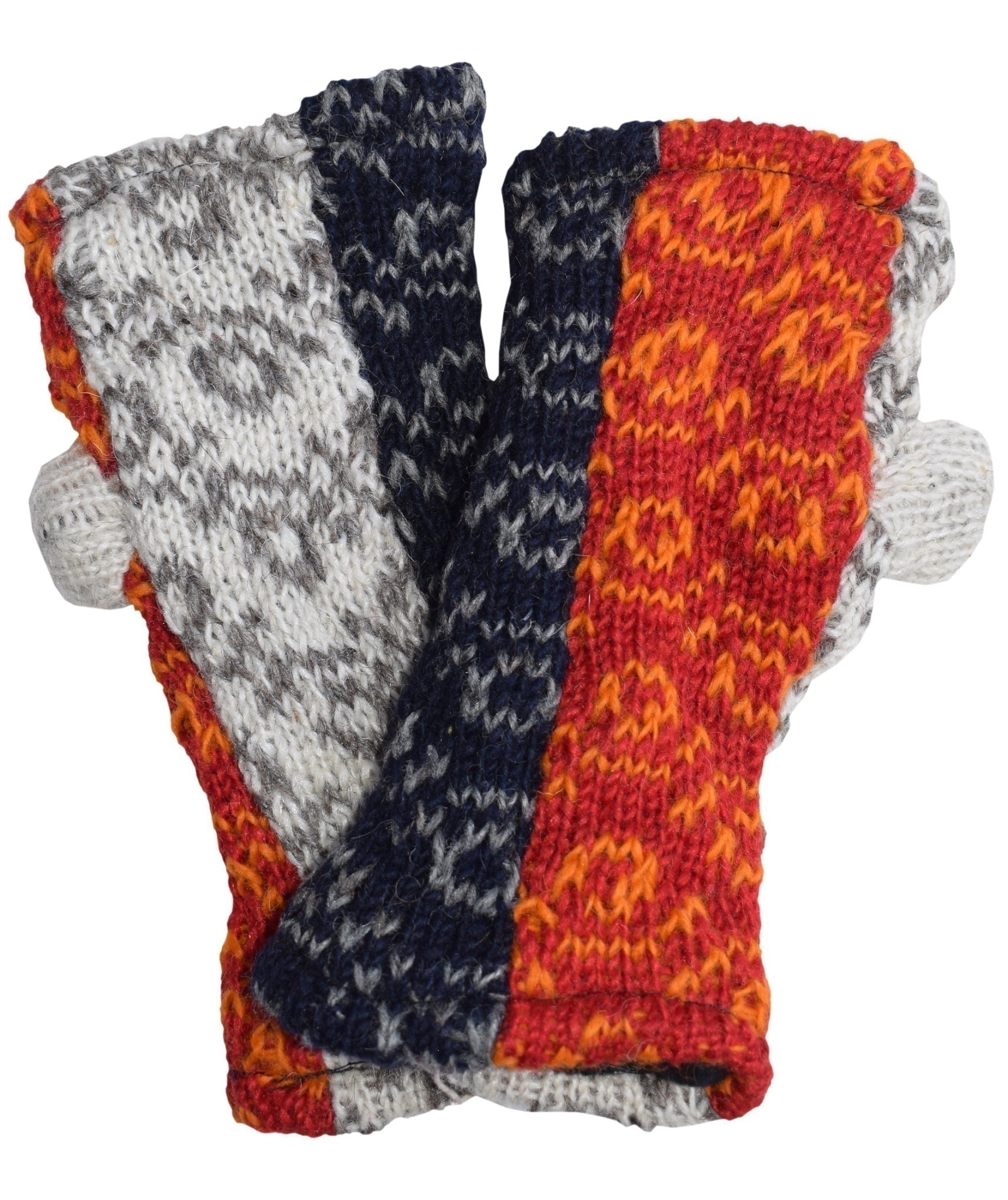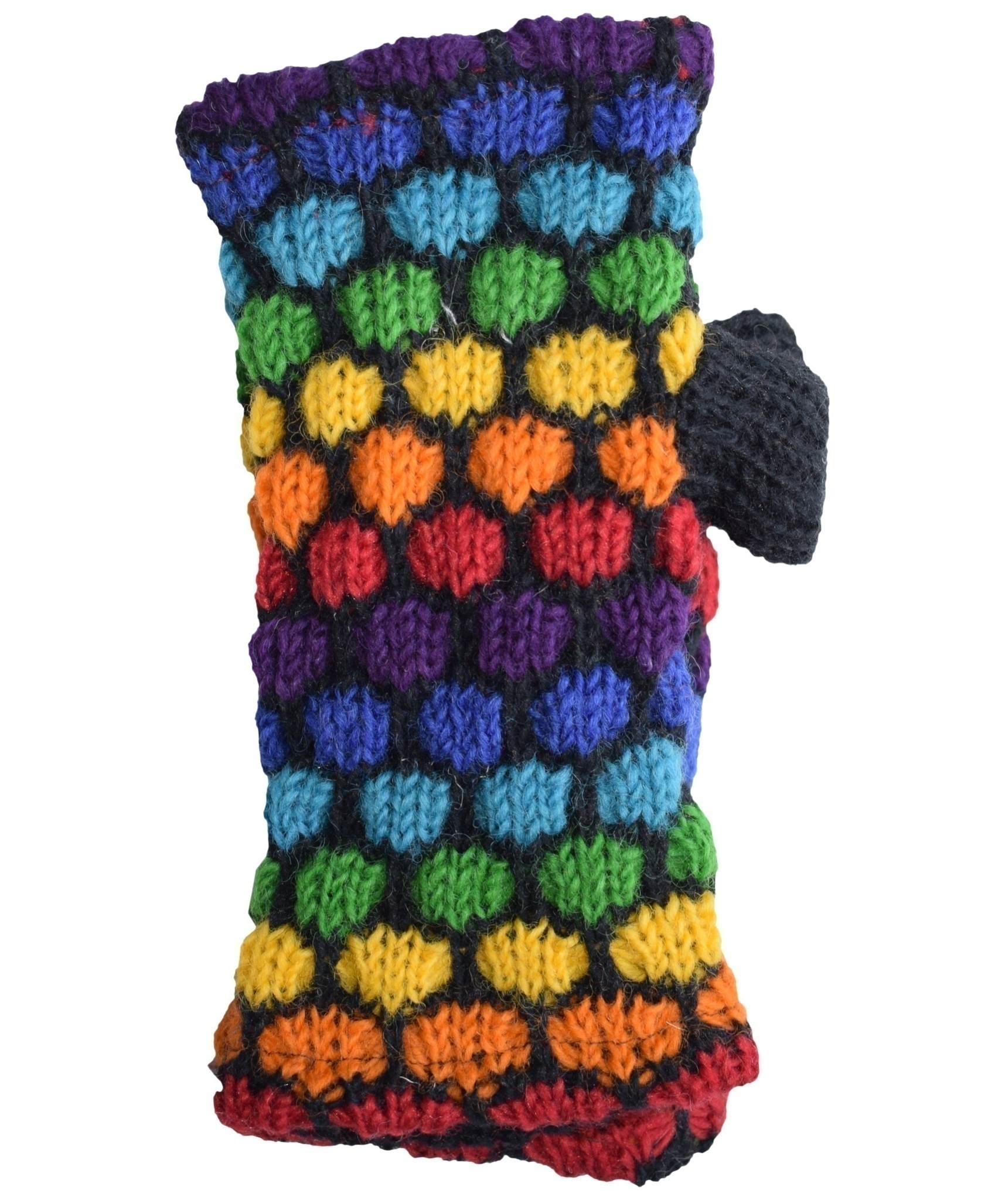 Multicolored fingerless long mittens with 2 separate sections for thumb and other fingers
