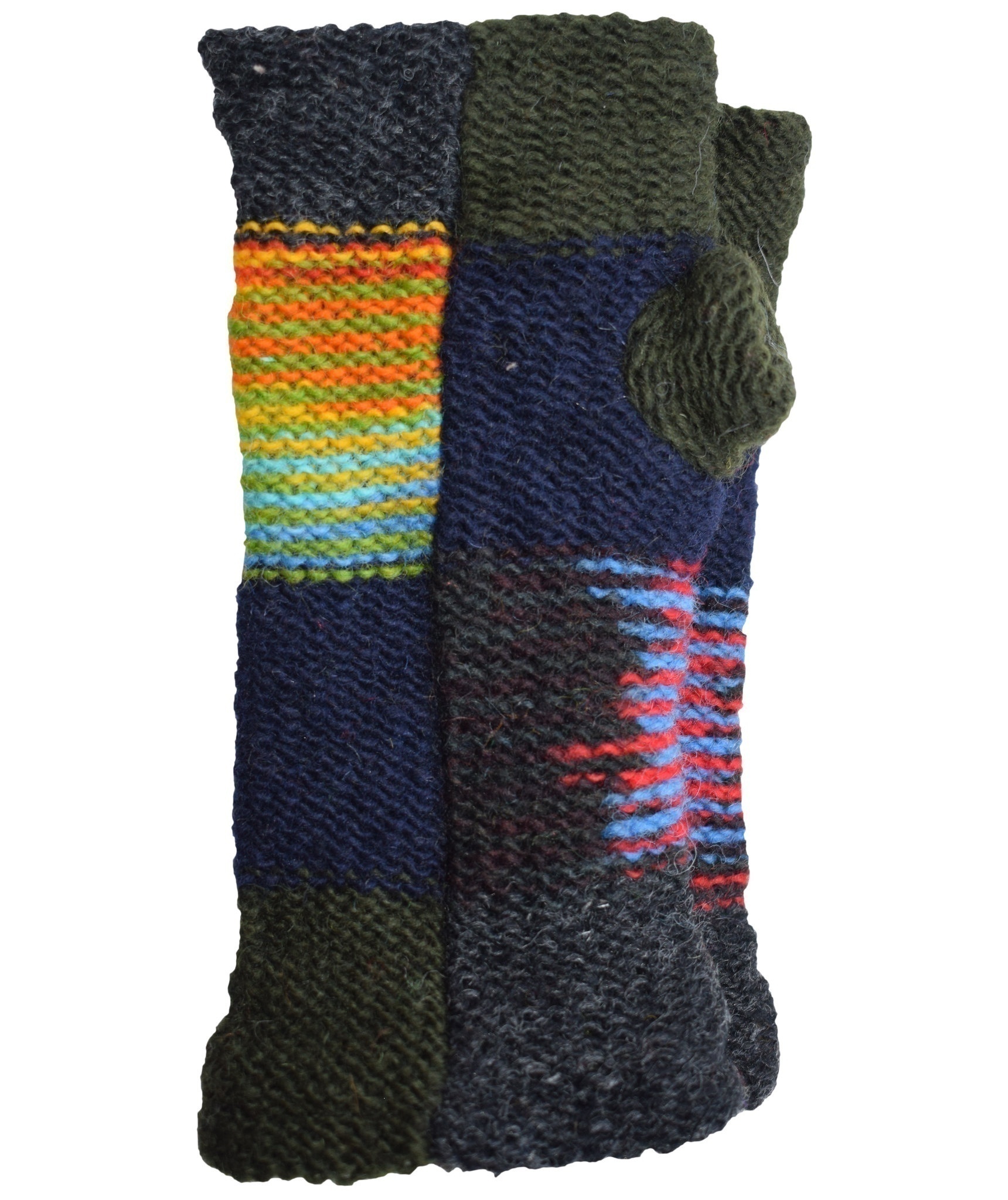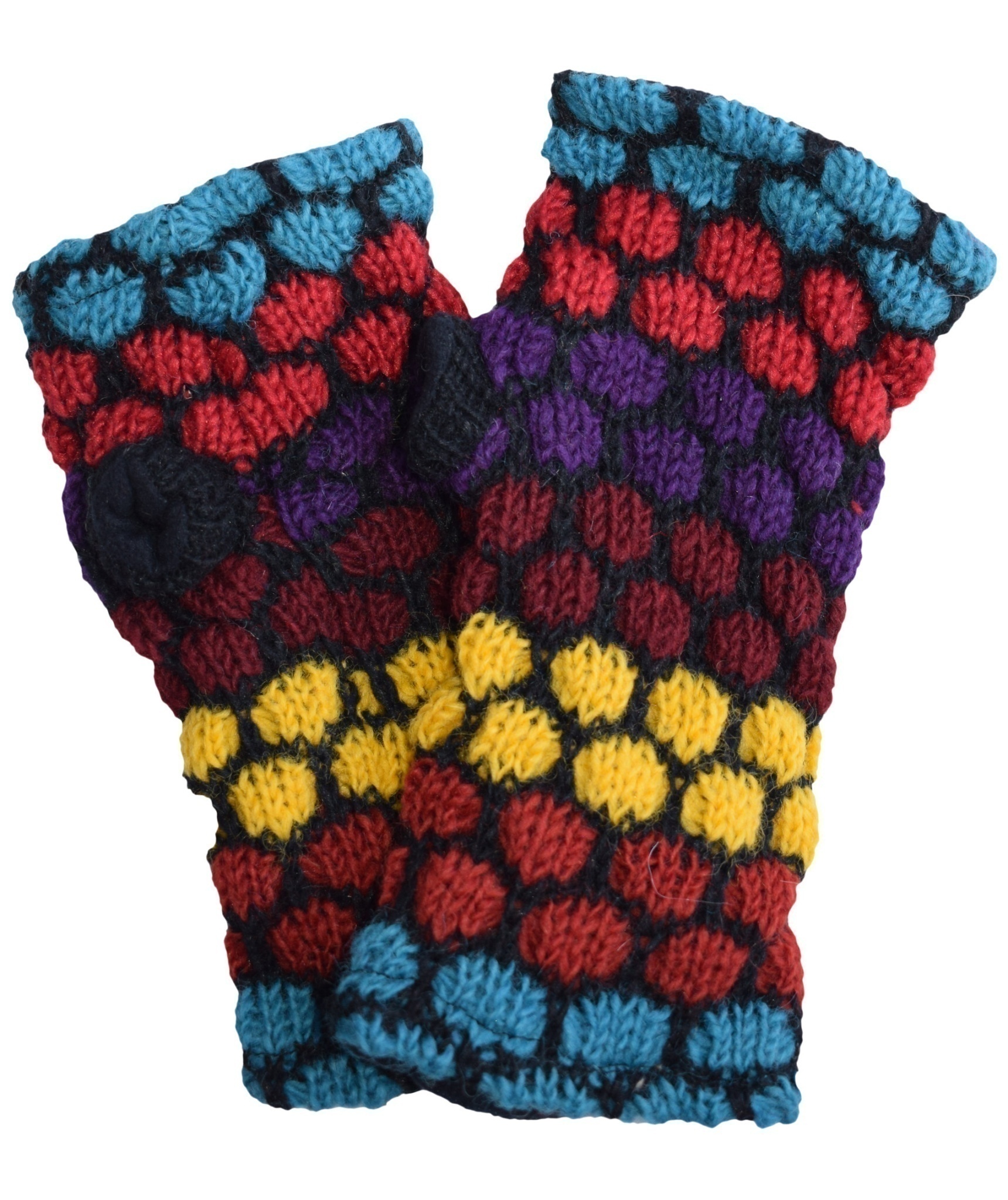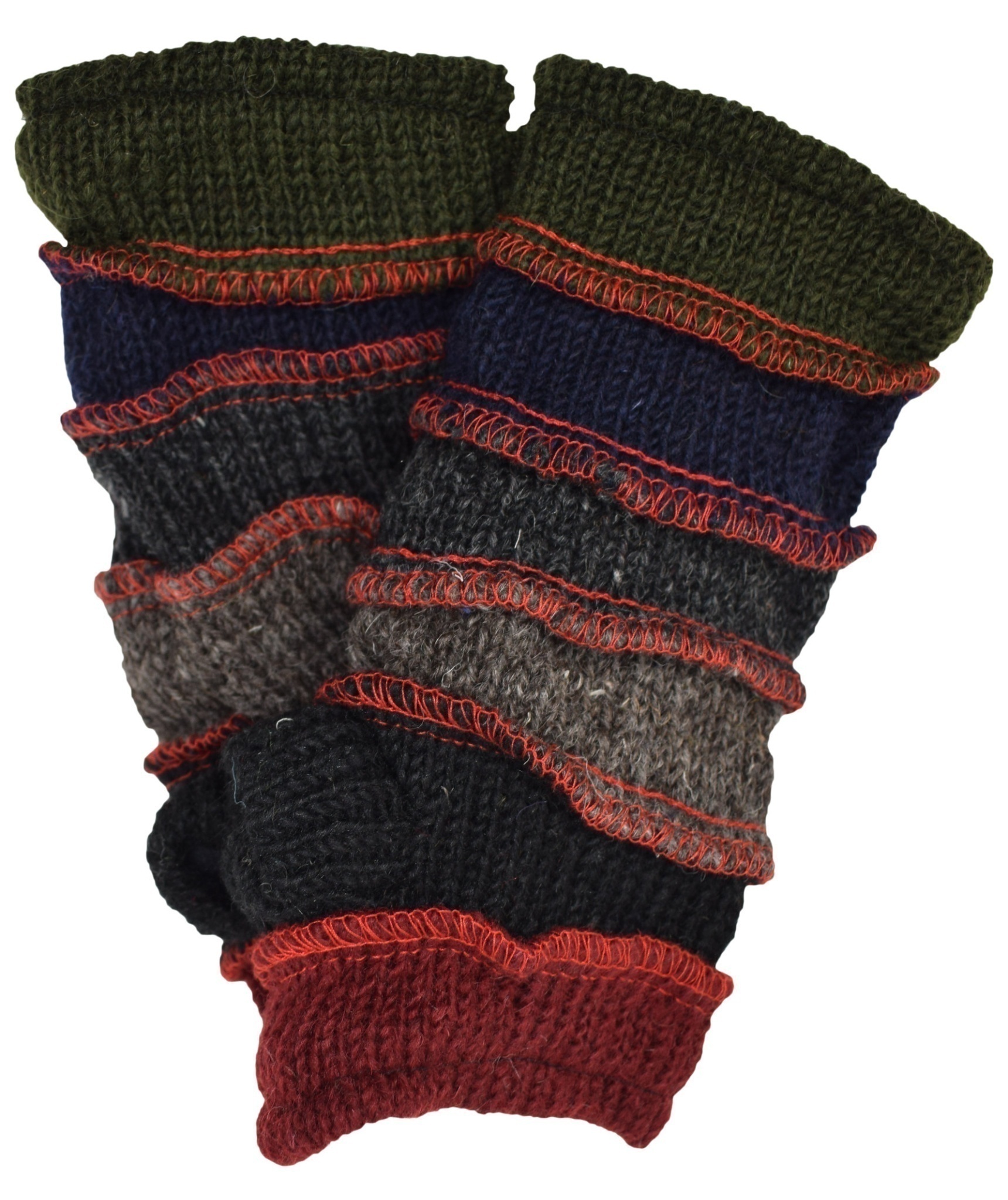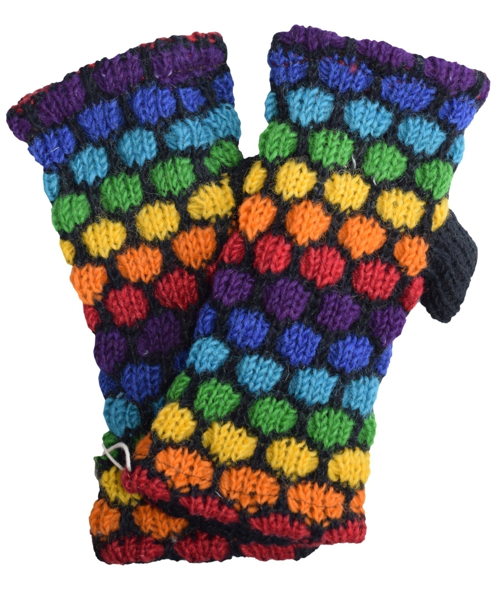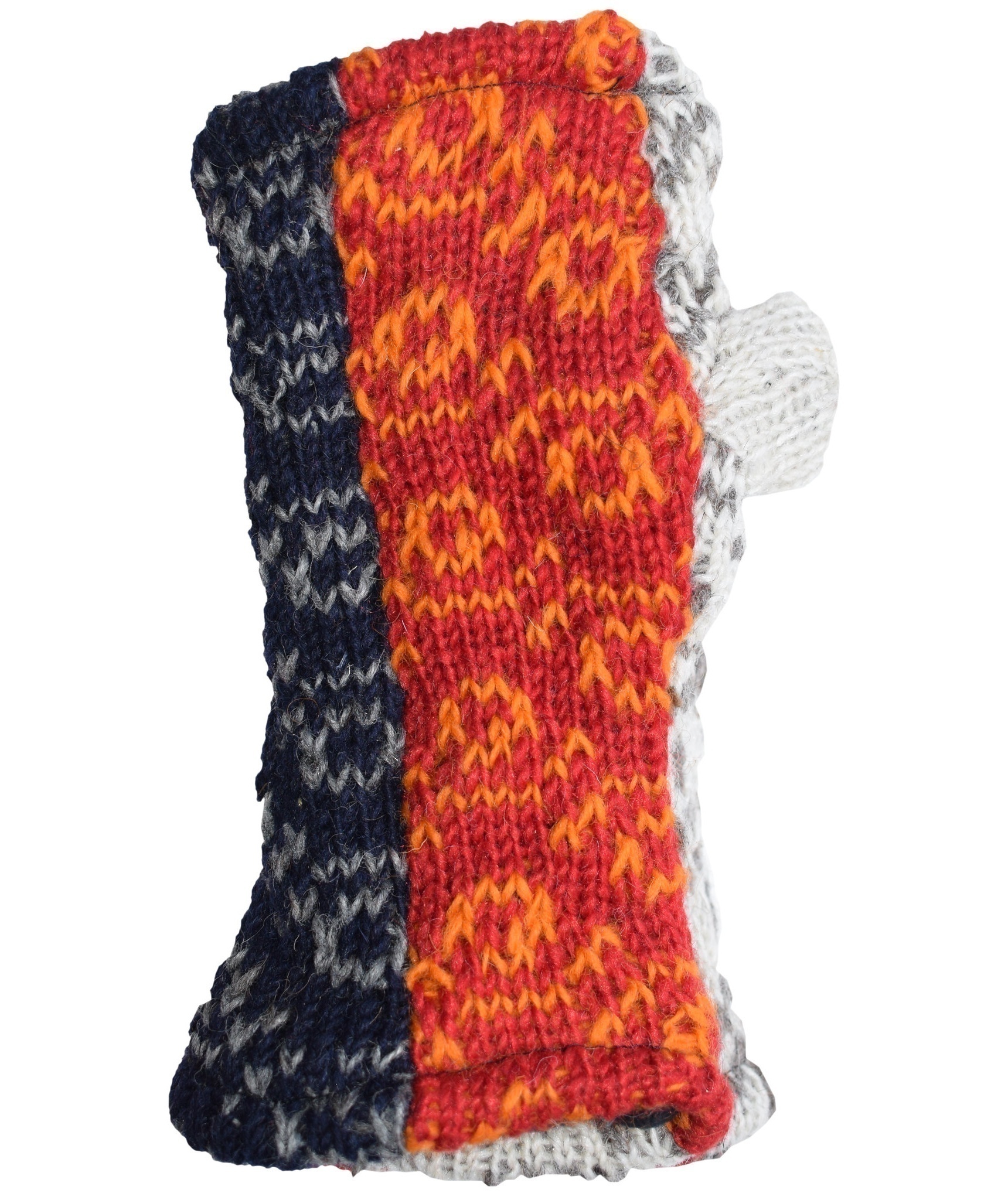Multicolored fingerless long mittens with 2 separate sections for thumb and other fingers