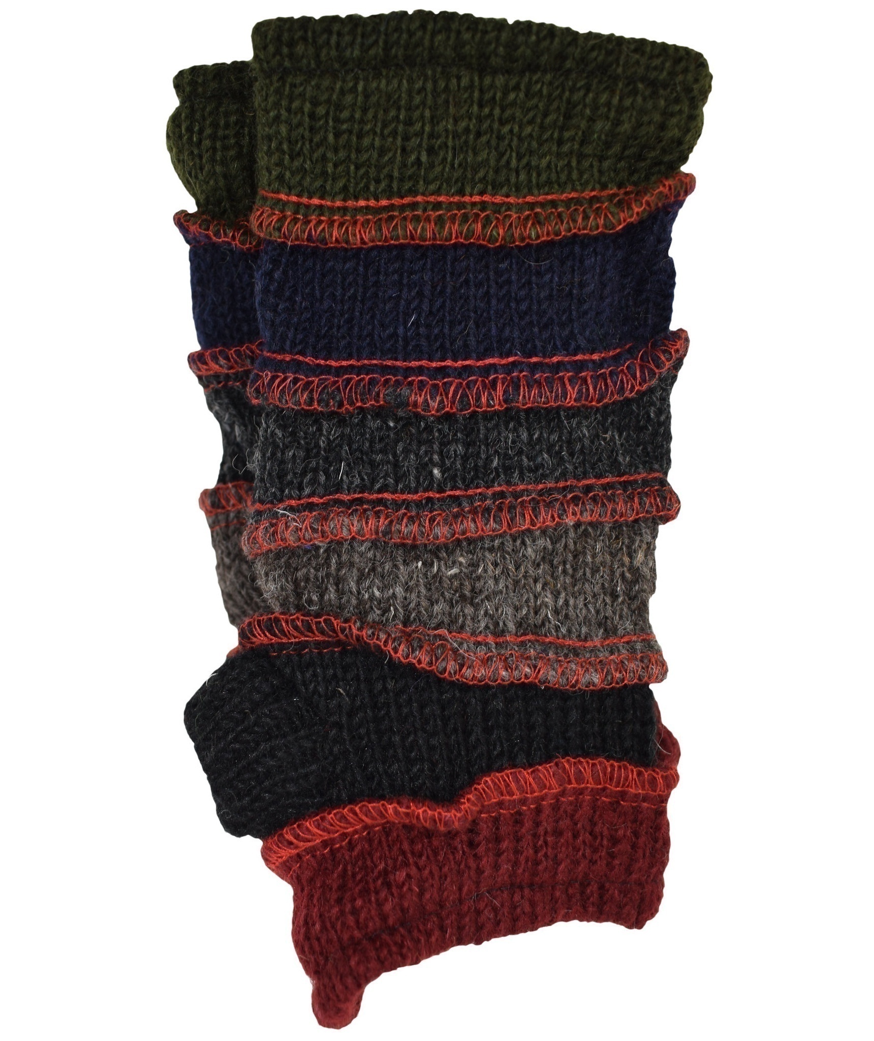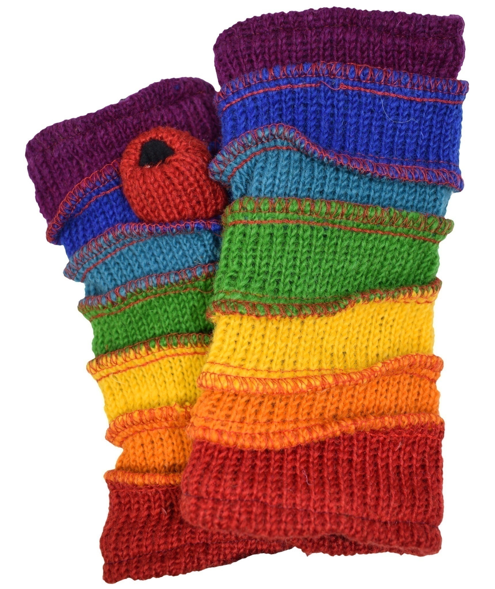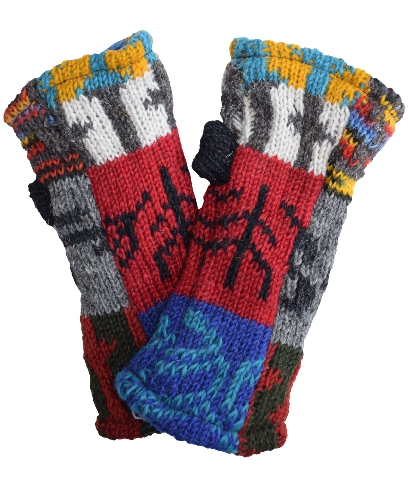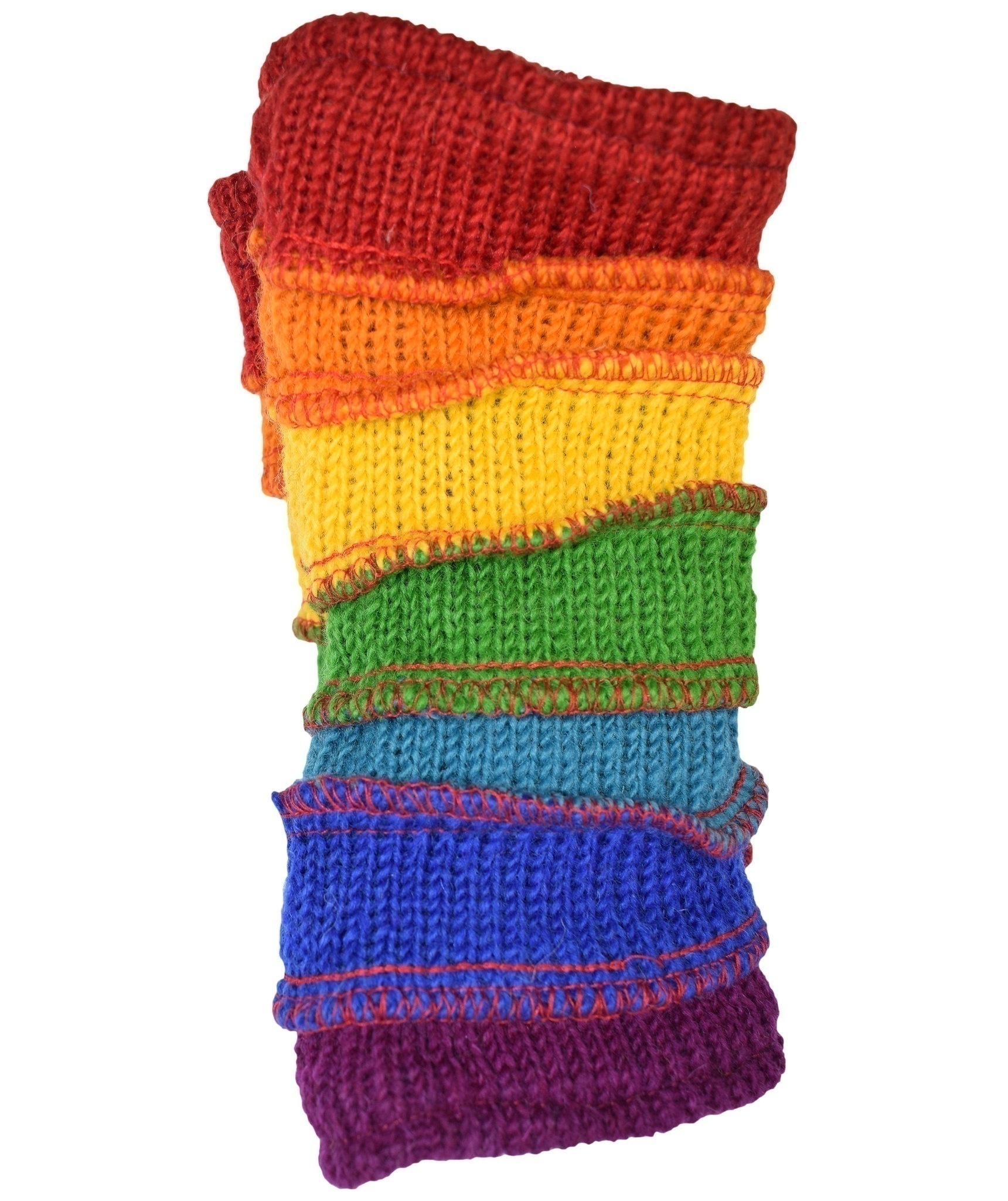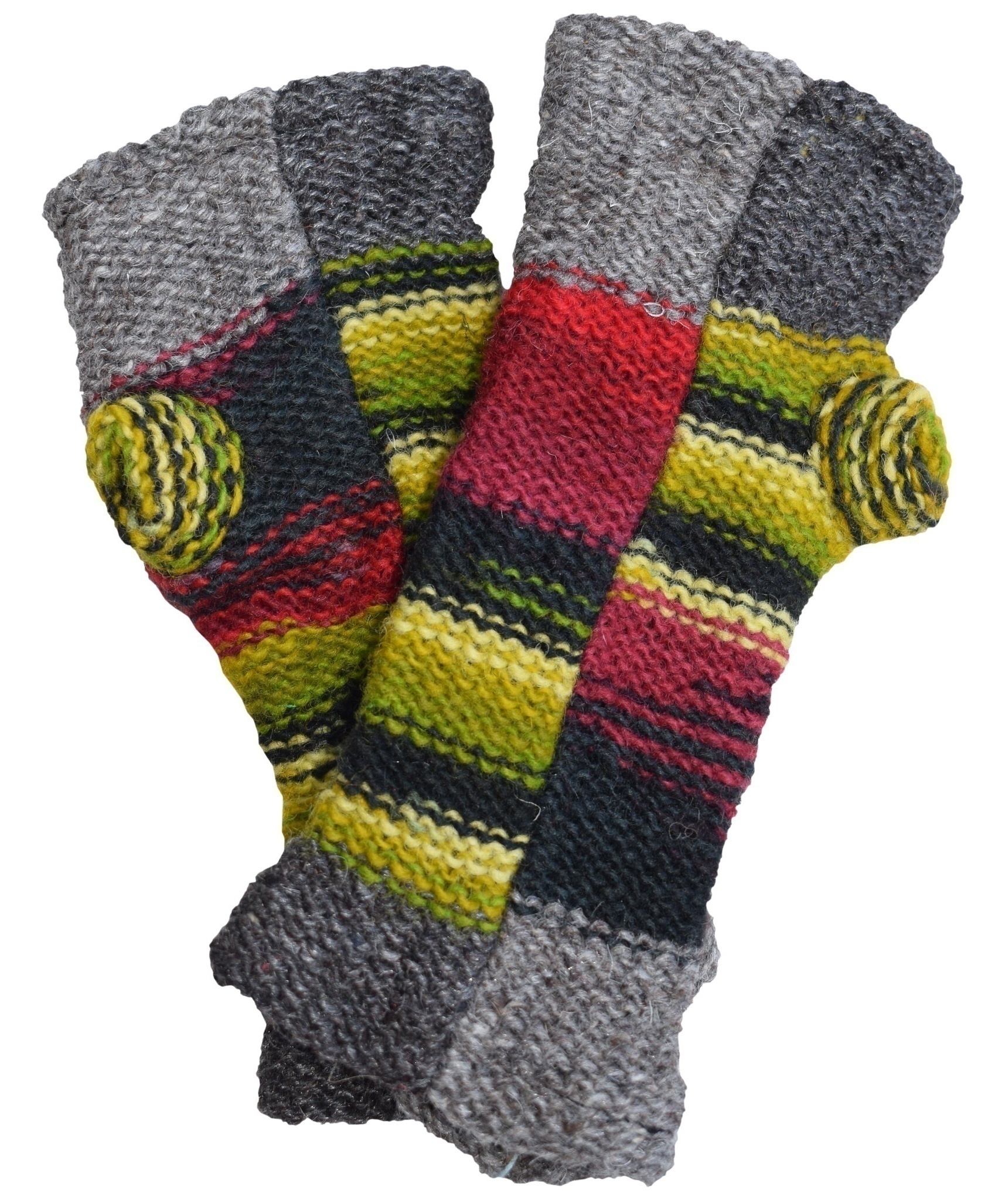 Multicolored fingerless long mittens with 2 separate sections for thumb and other fingers