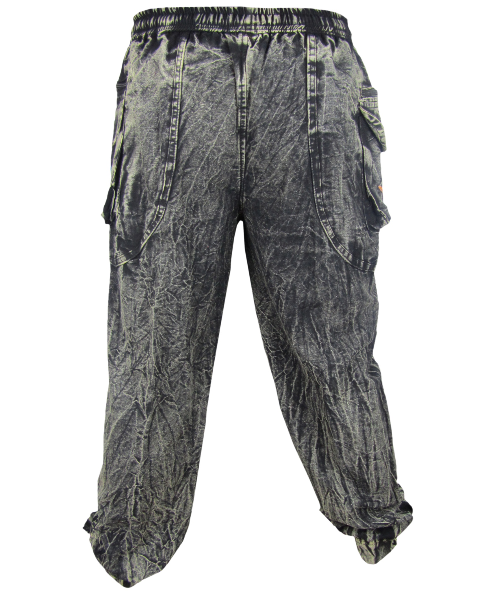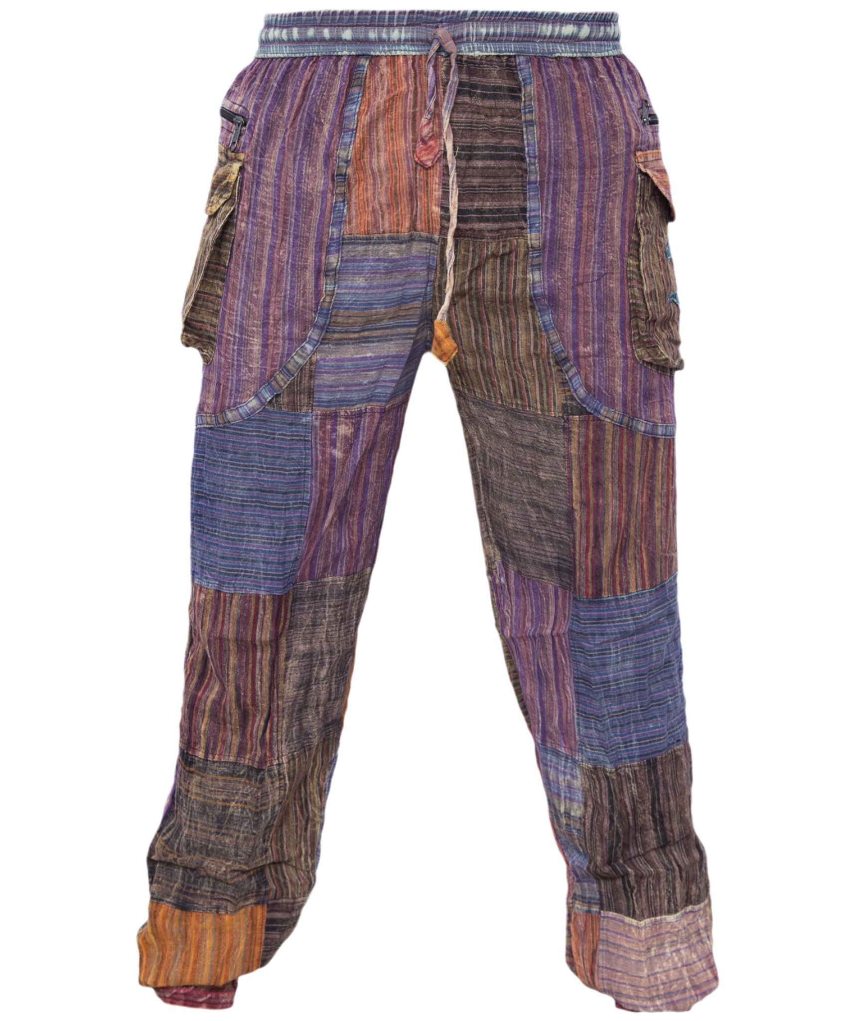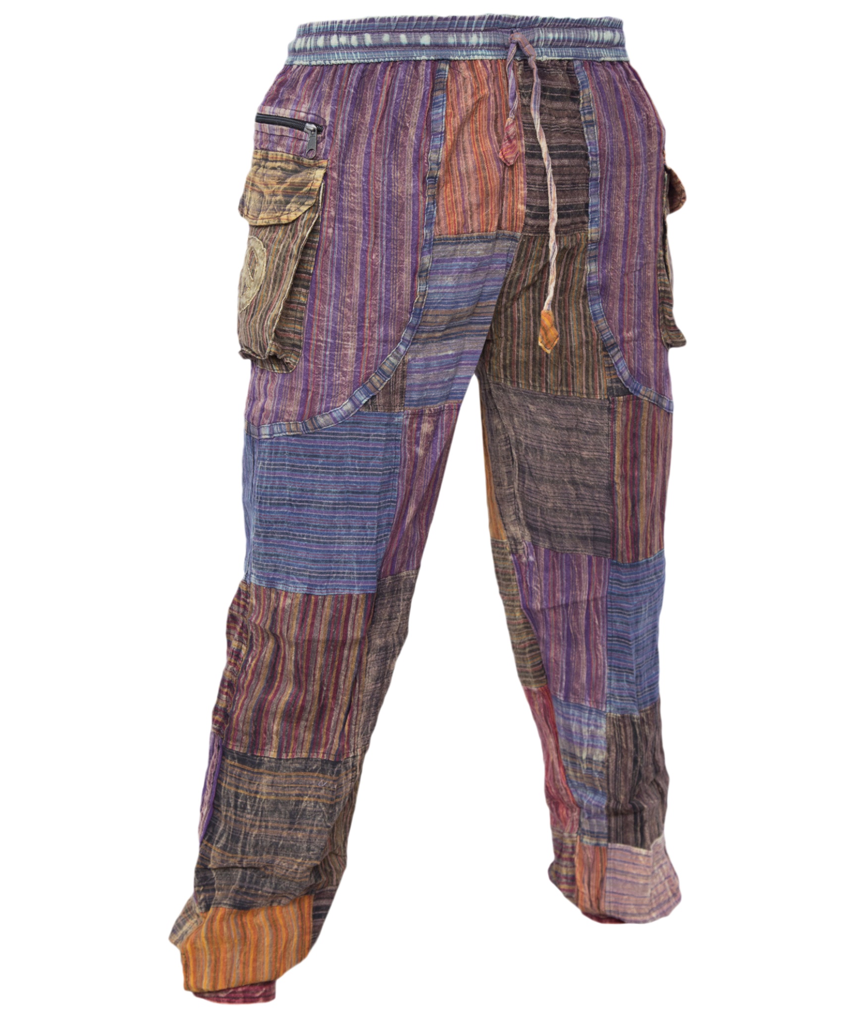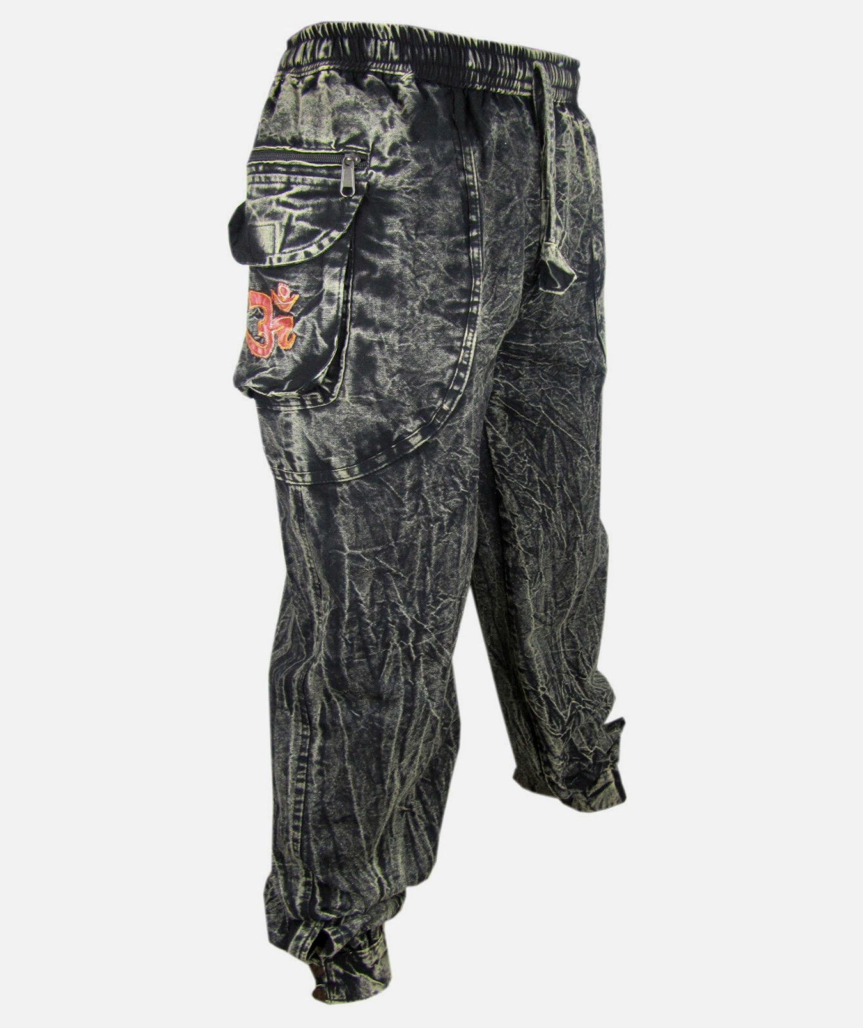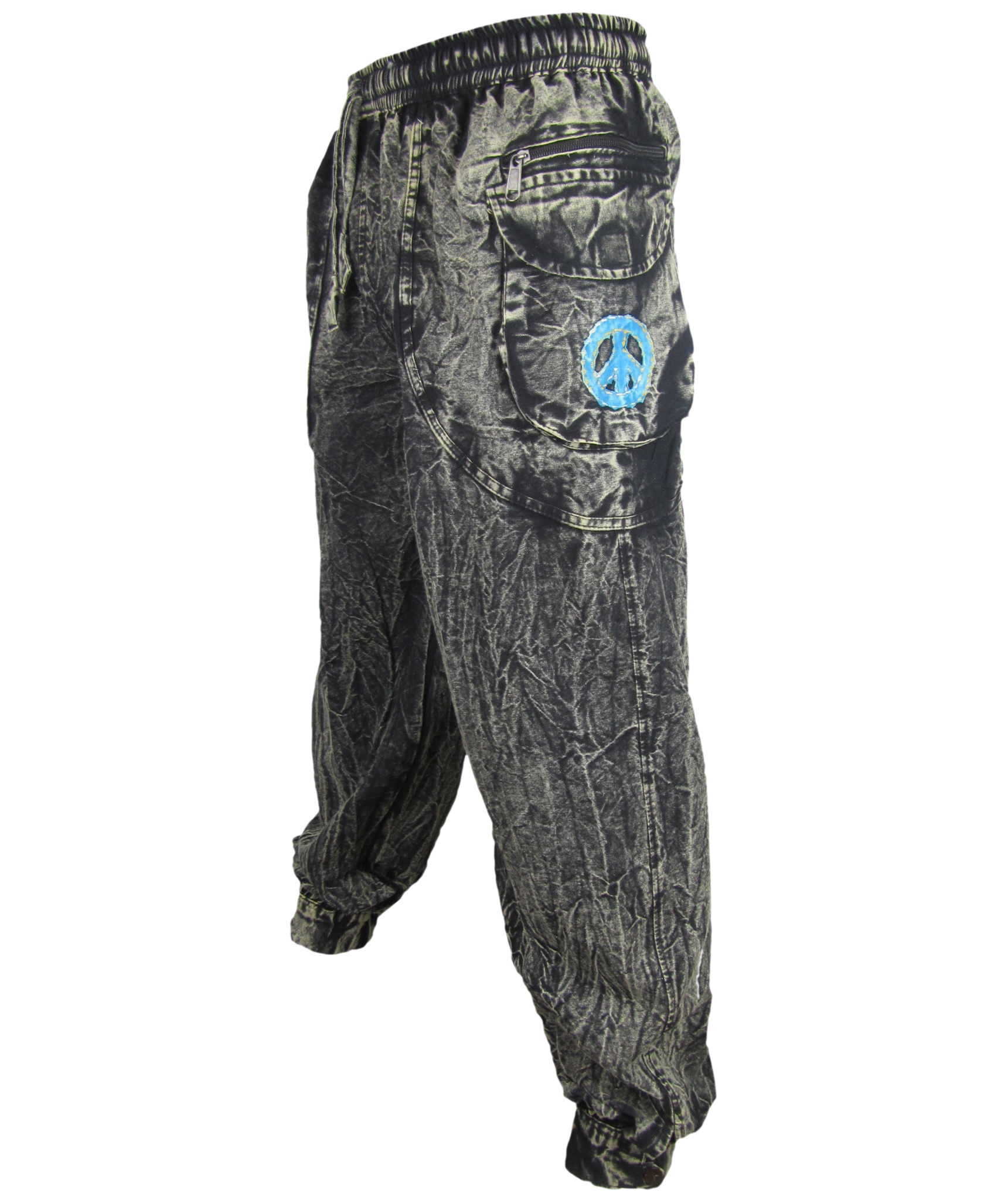 This patchwork stonewashed pant has zip pockets at both sides with peace symbol on one side and Om symbol on the other side. Elastic waist with a drawstring to adjust size. As shown in the picture, there are two button in the ankle. It is very comfortable and light to wear that can be your ideal choice for this hot climate or you can just lounge around in the house. Each pants are individually made so the color combination will always vary slightly.