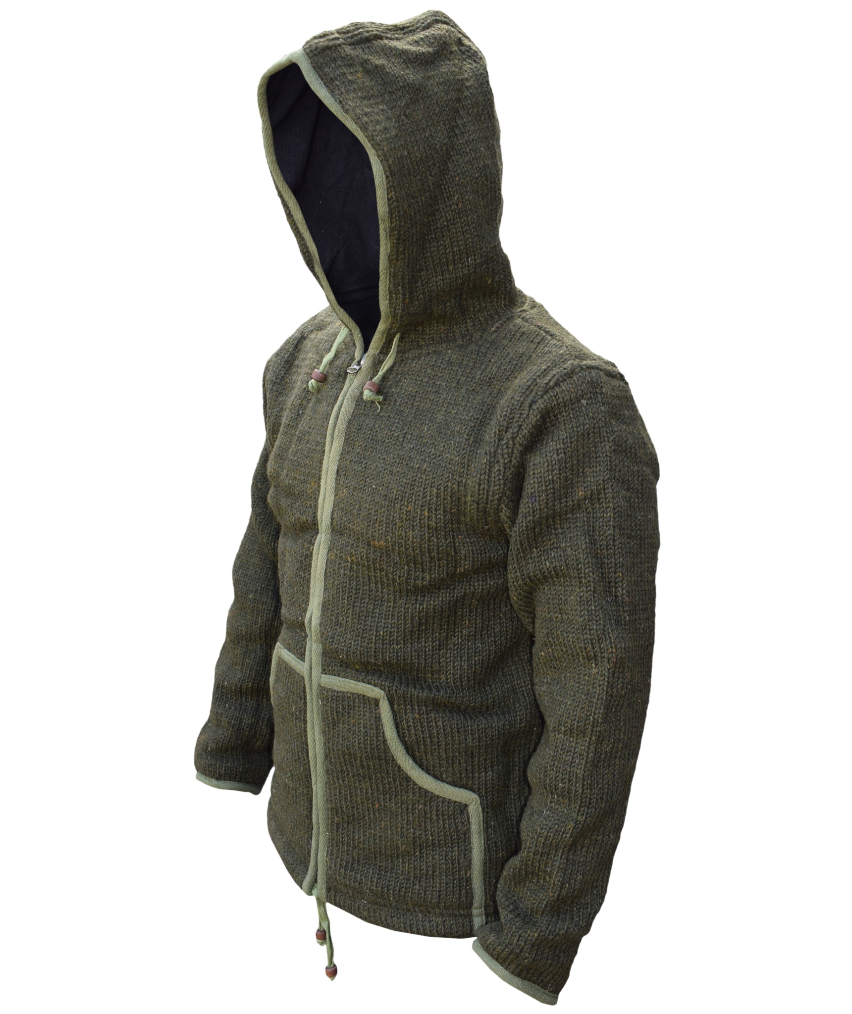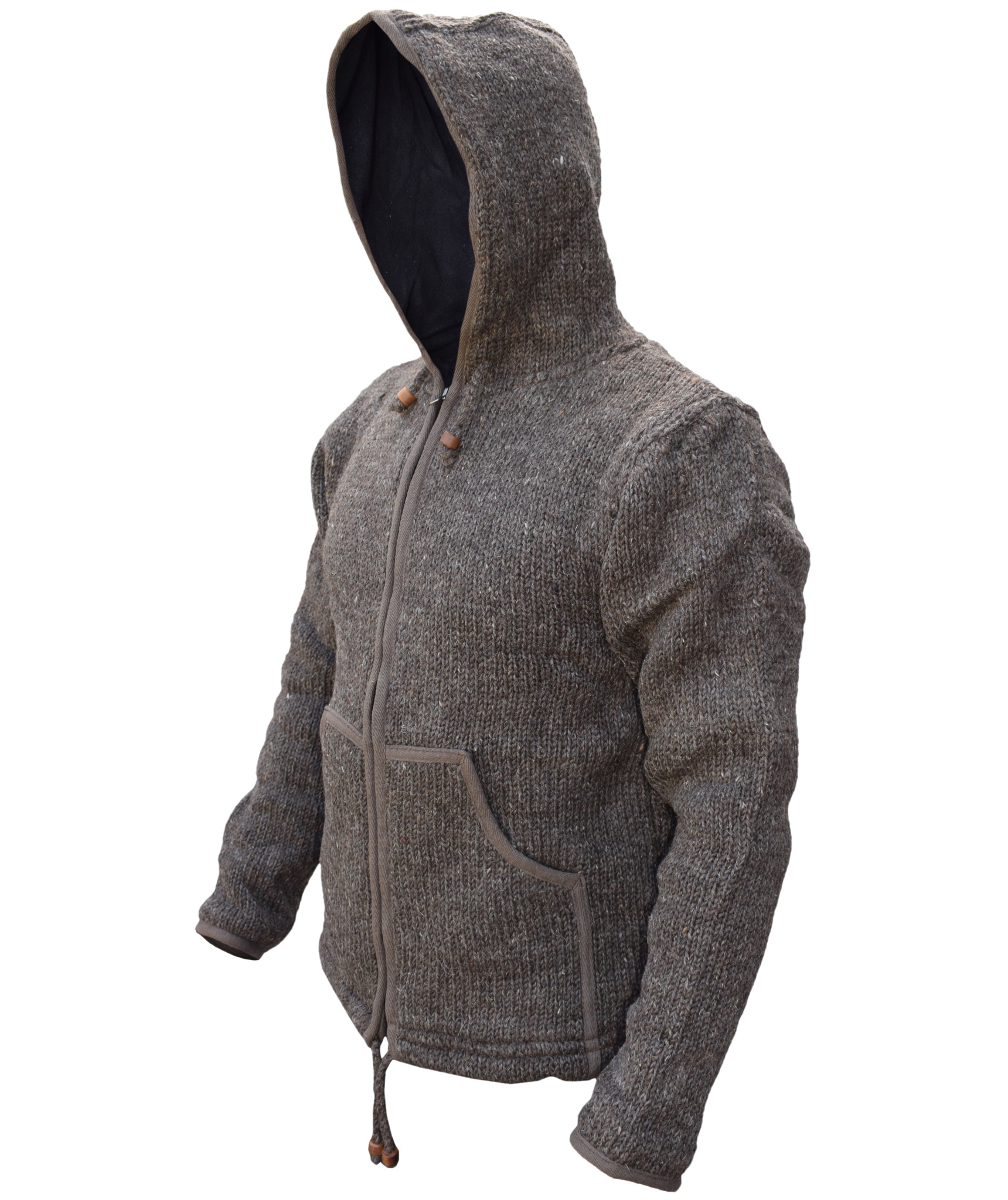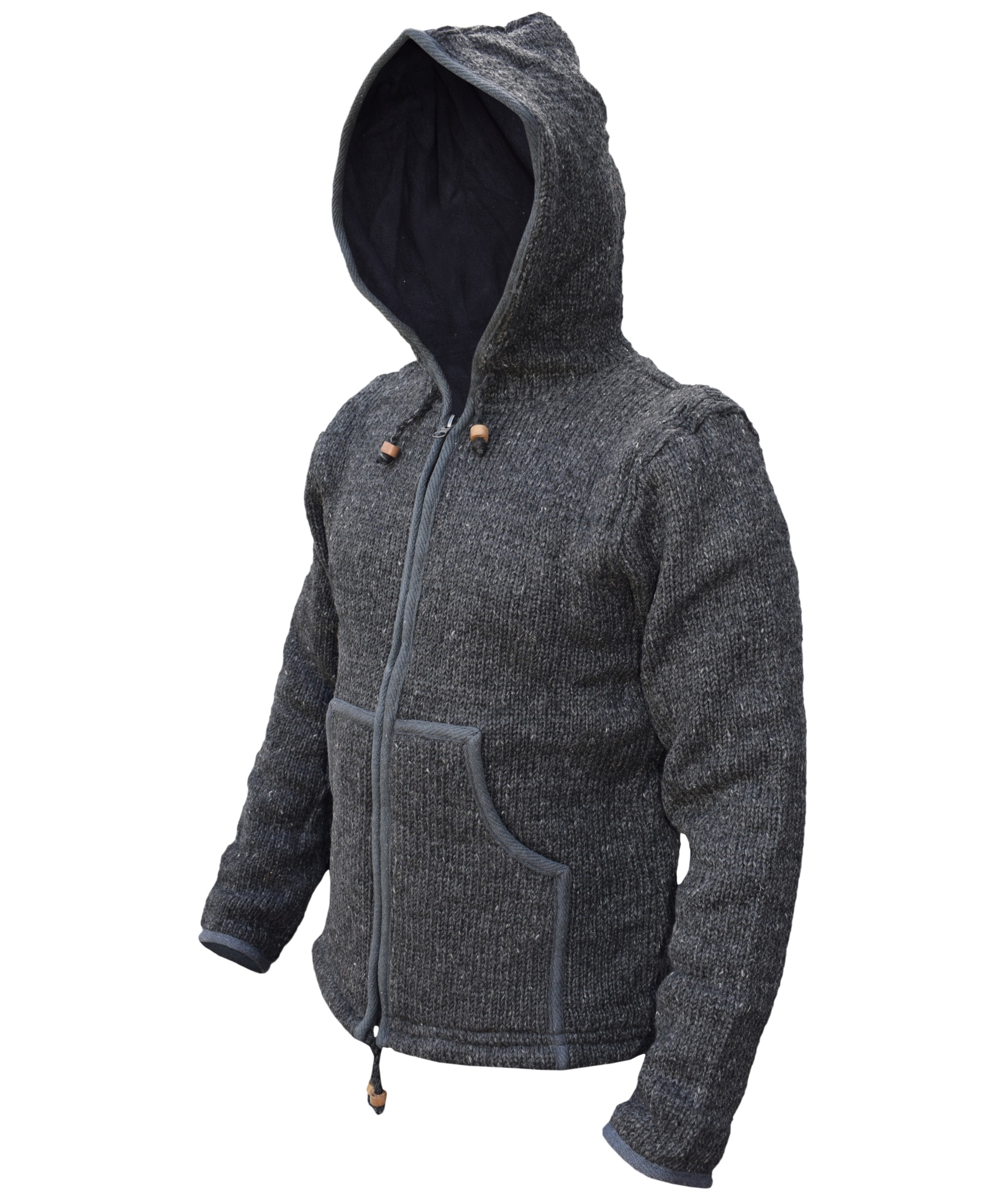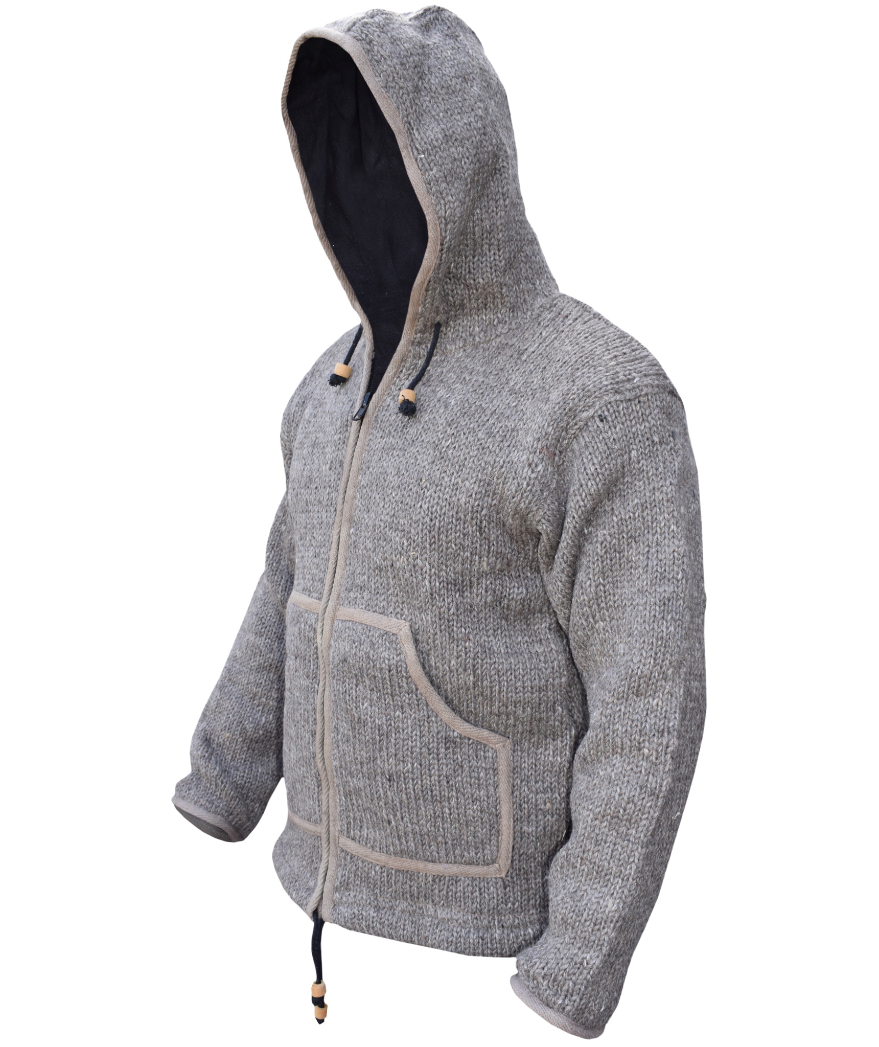 These woolen jackets have two deep front pockets and an inner breast pocket at one side. They are hooded jacket with hood and bottom hem provided with a drawstring that has wooden beads. They have full zip fastening. They are double knitted as well as fleece lined that makes these jackets more suitable for chilling weather.