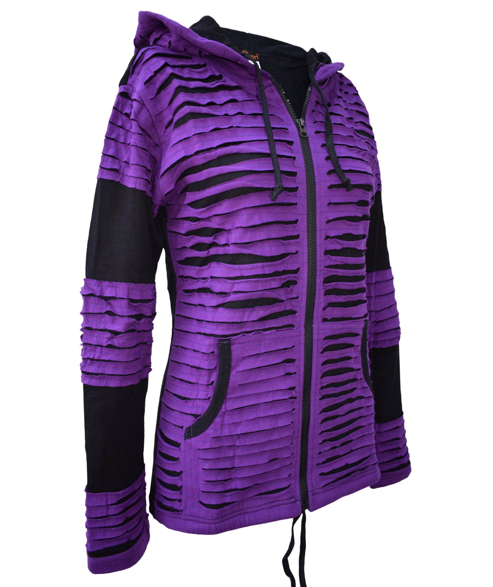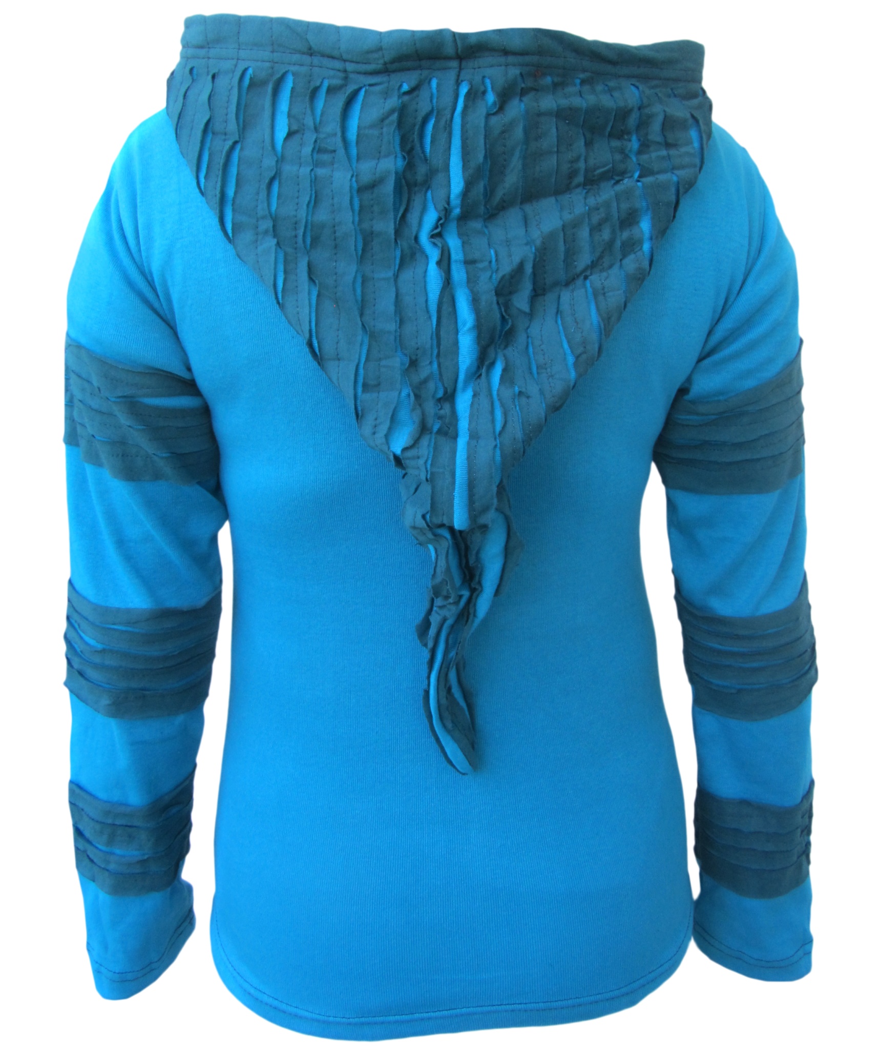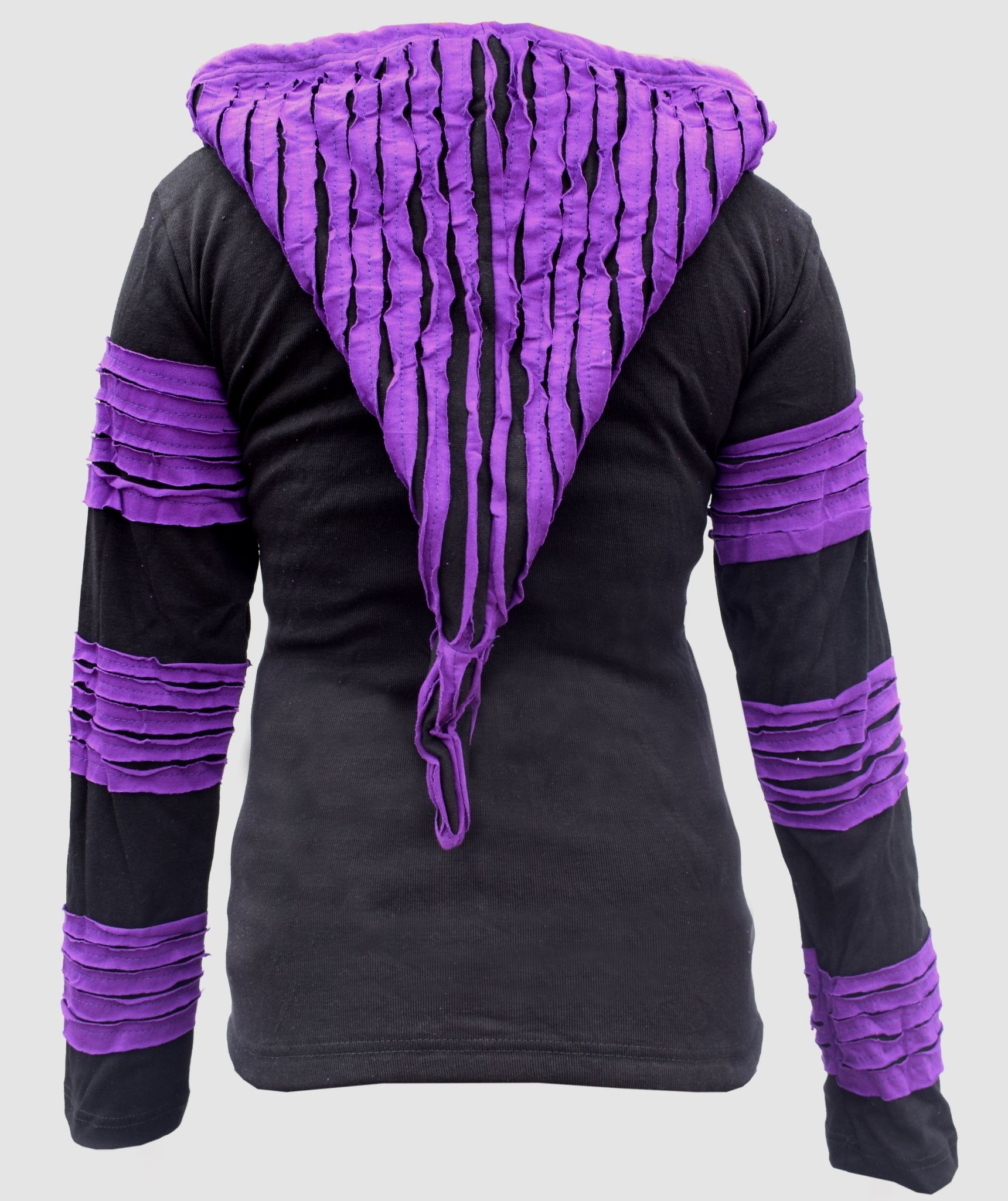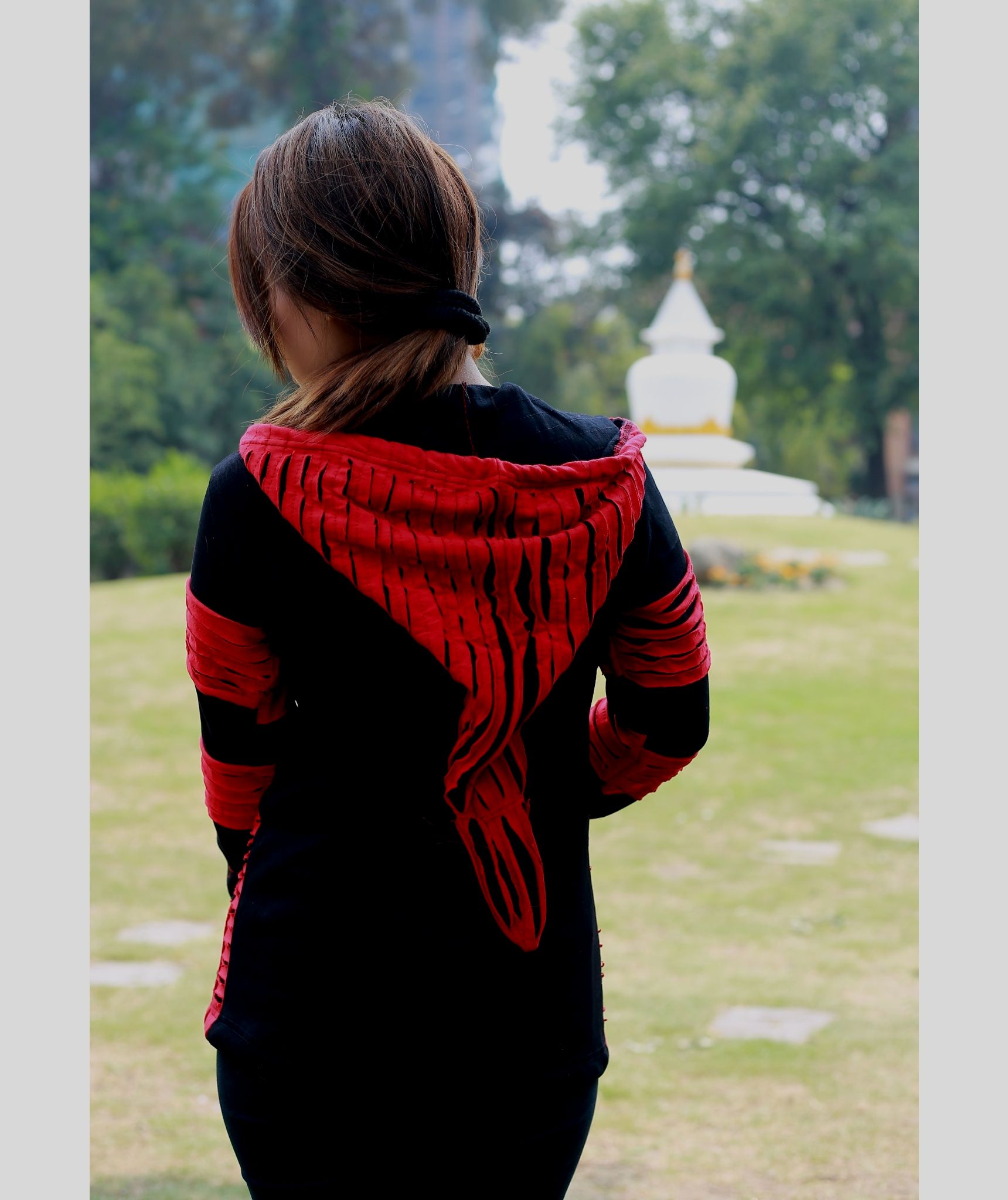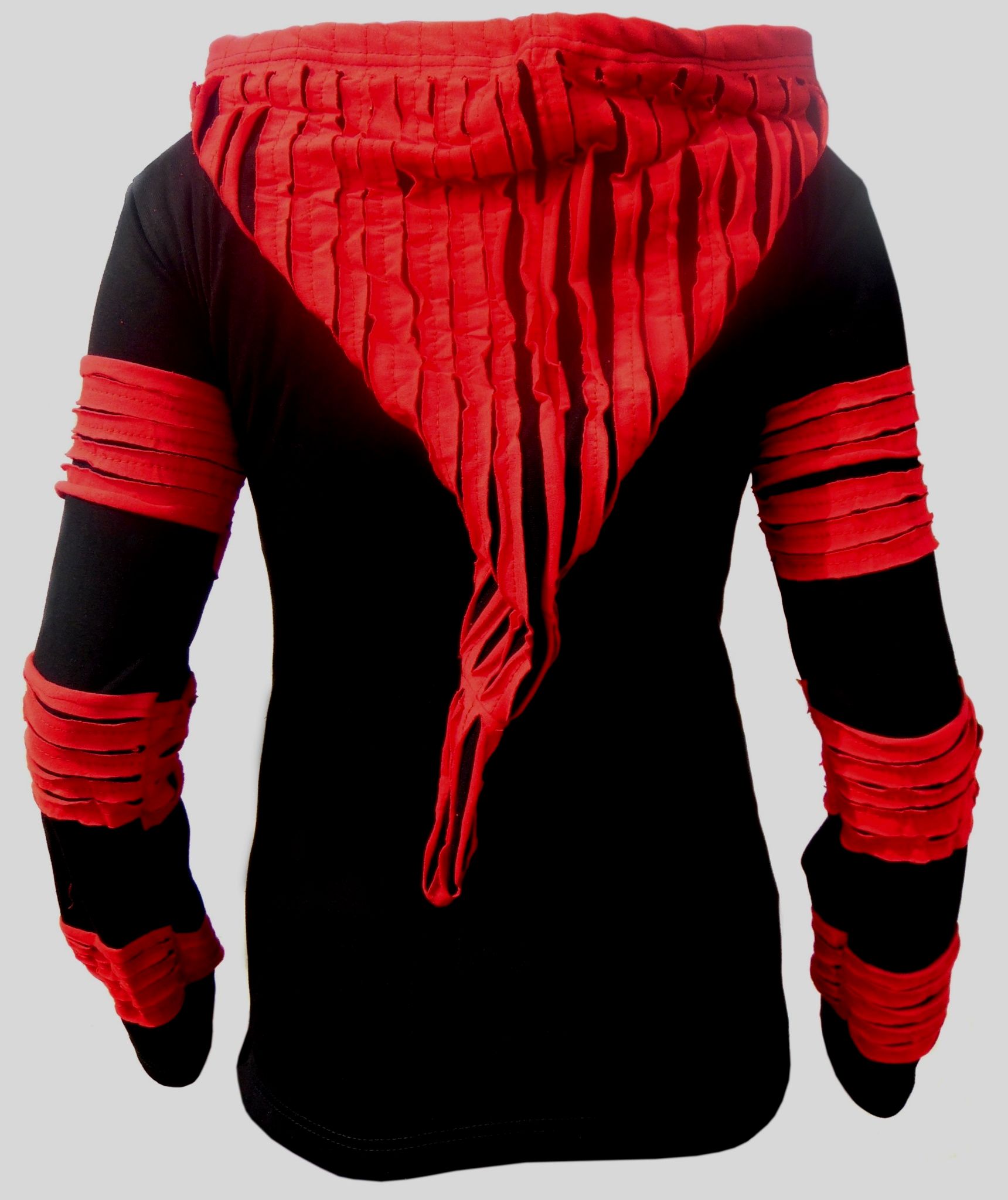 100% Cotton slashed hoodies with pixie hood. We add two layer of fabric and carefully cut the outer one with razor.
