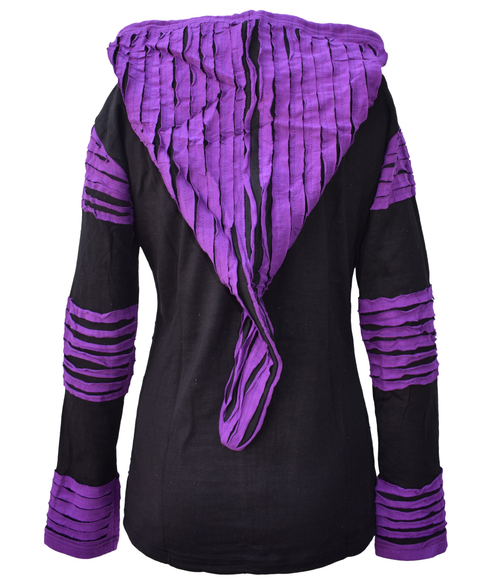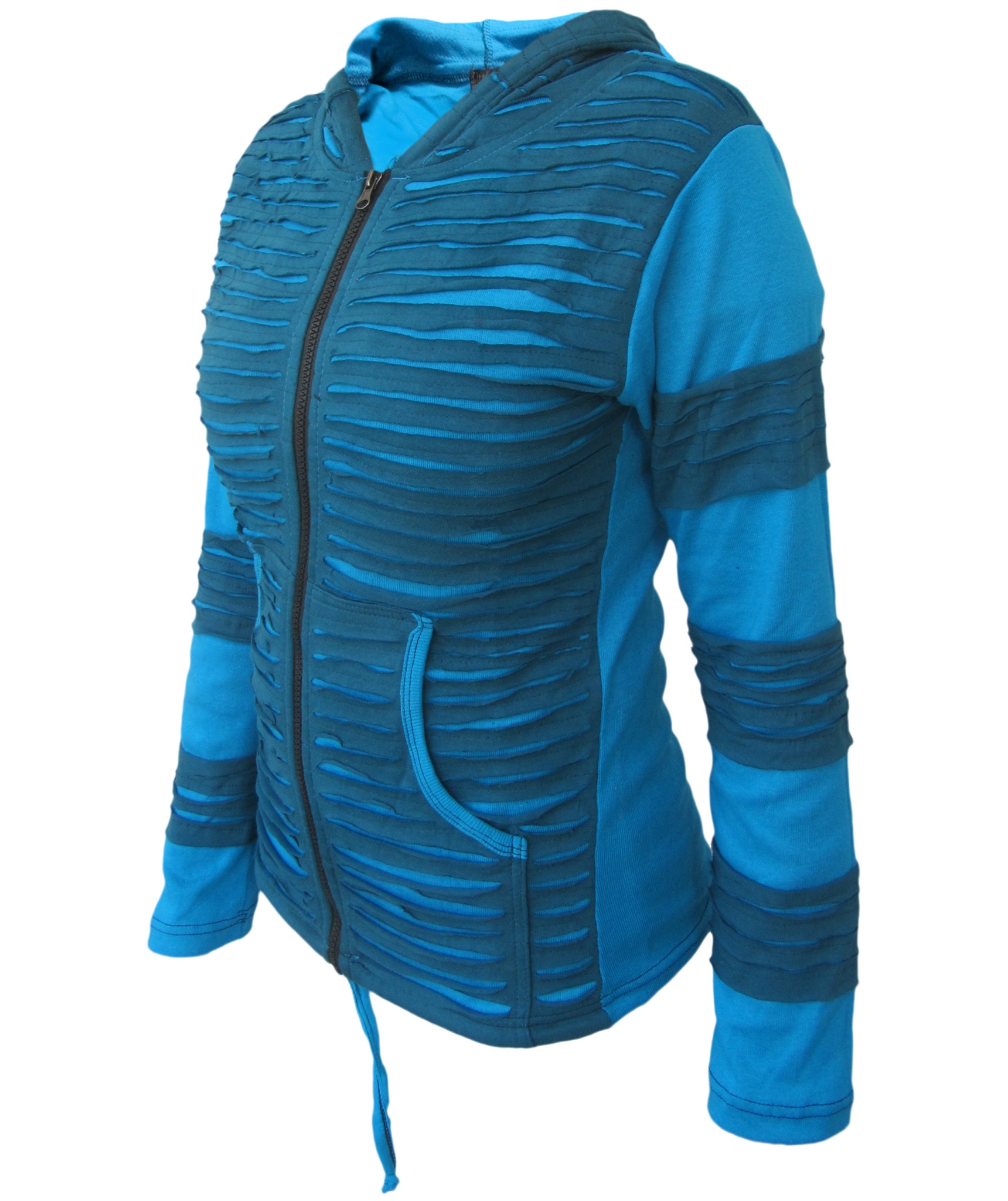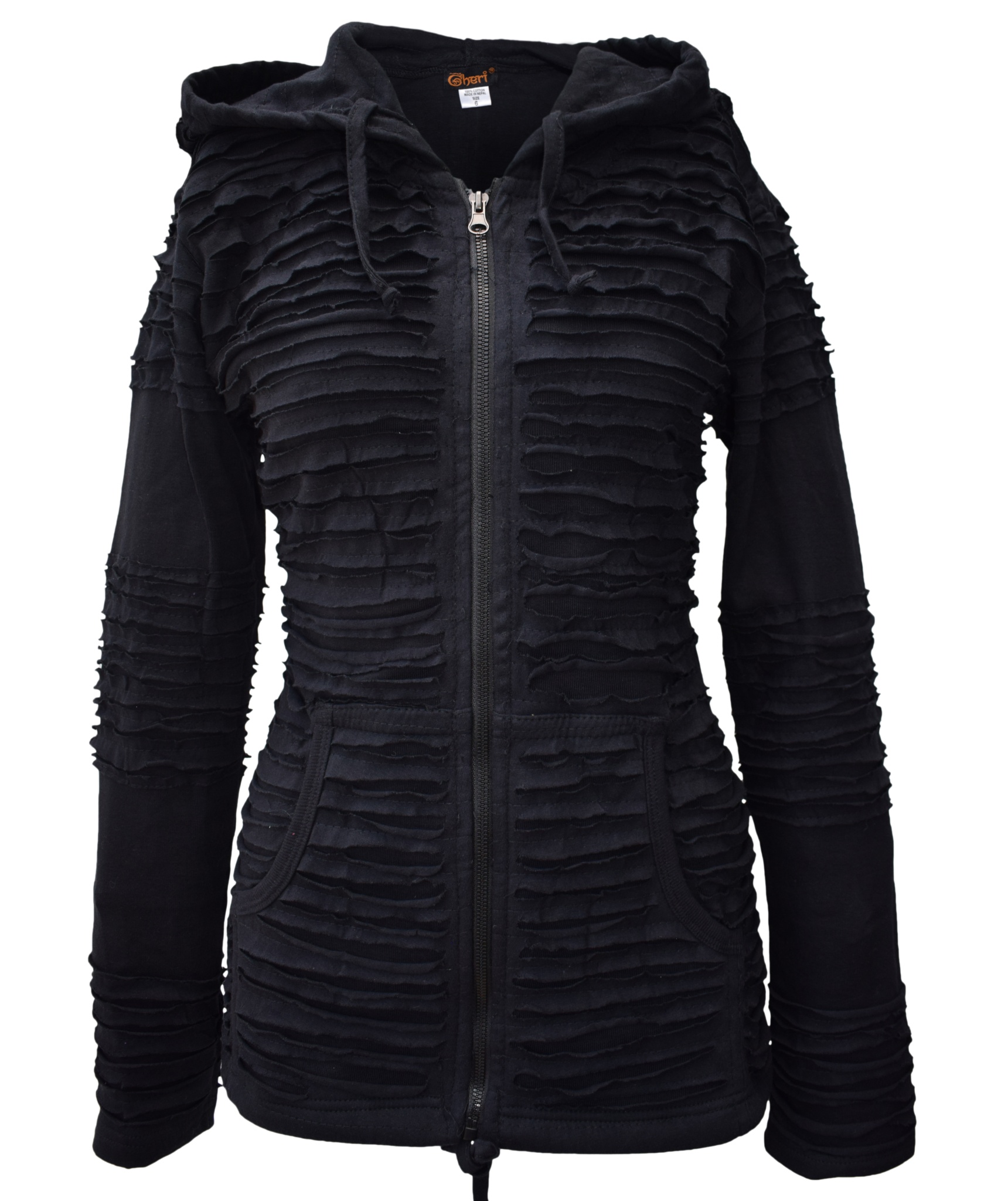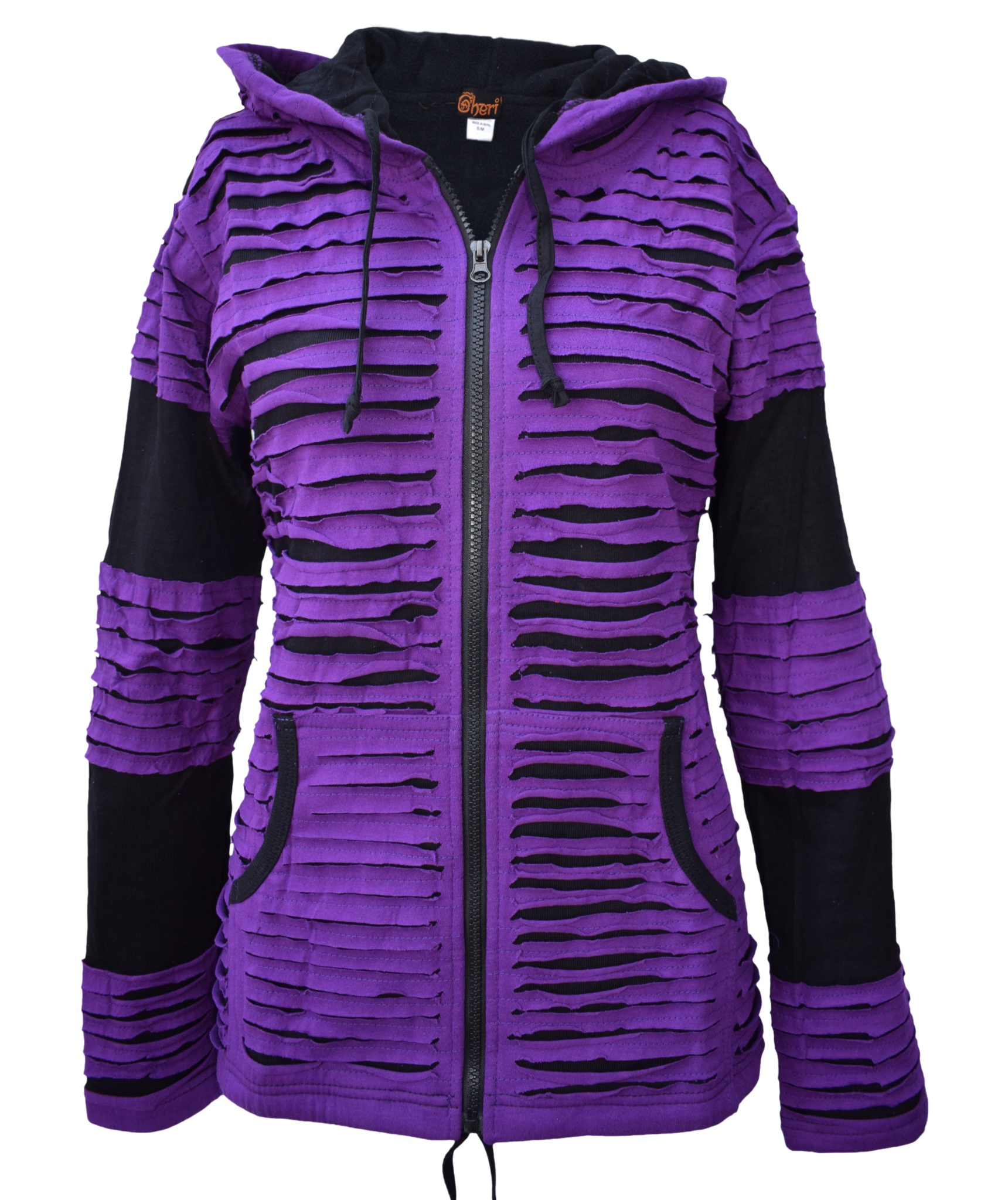 100% Cotton slashed hoodies with pixie hood. We add two layer of fabric and carefully cut the outer one with razor.