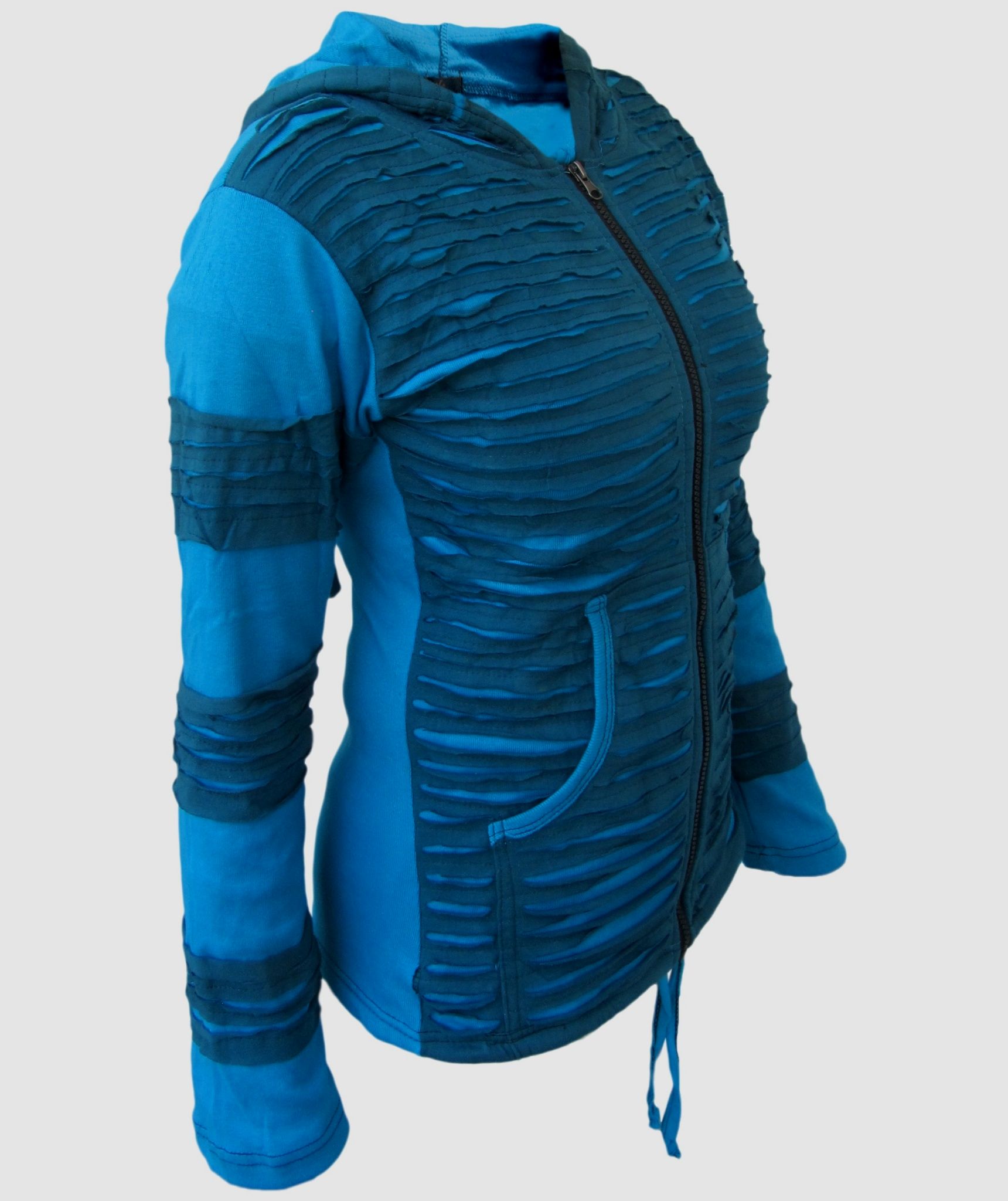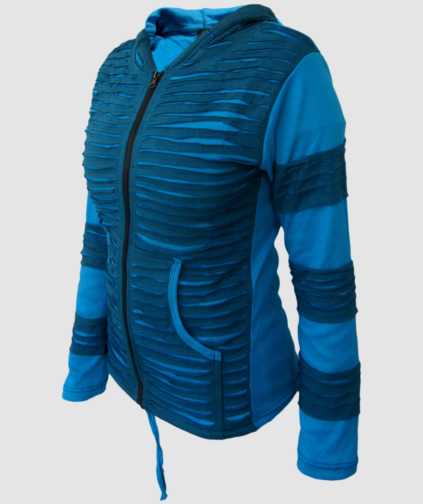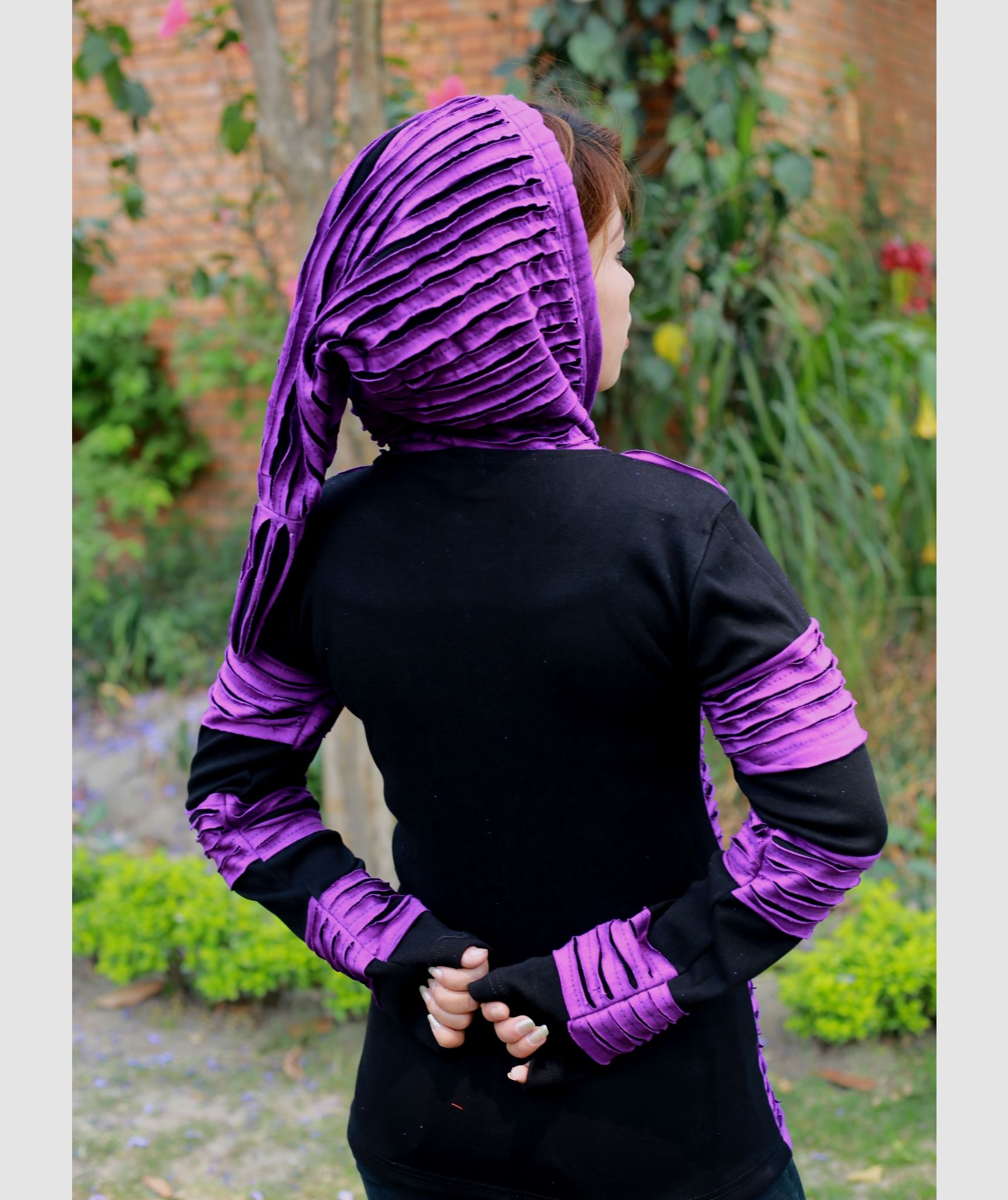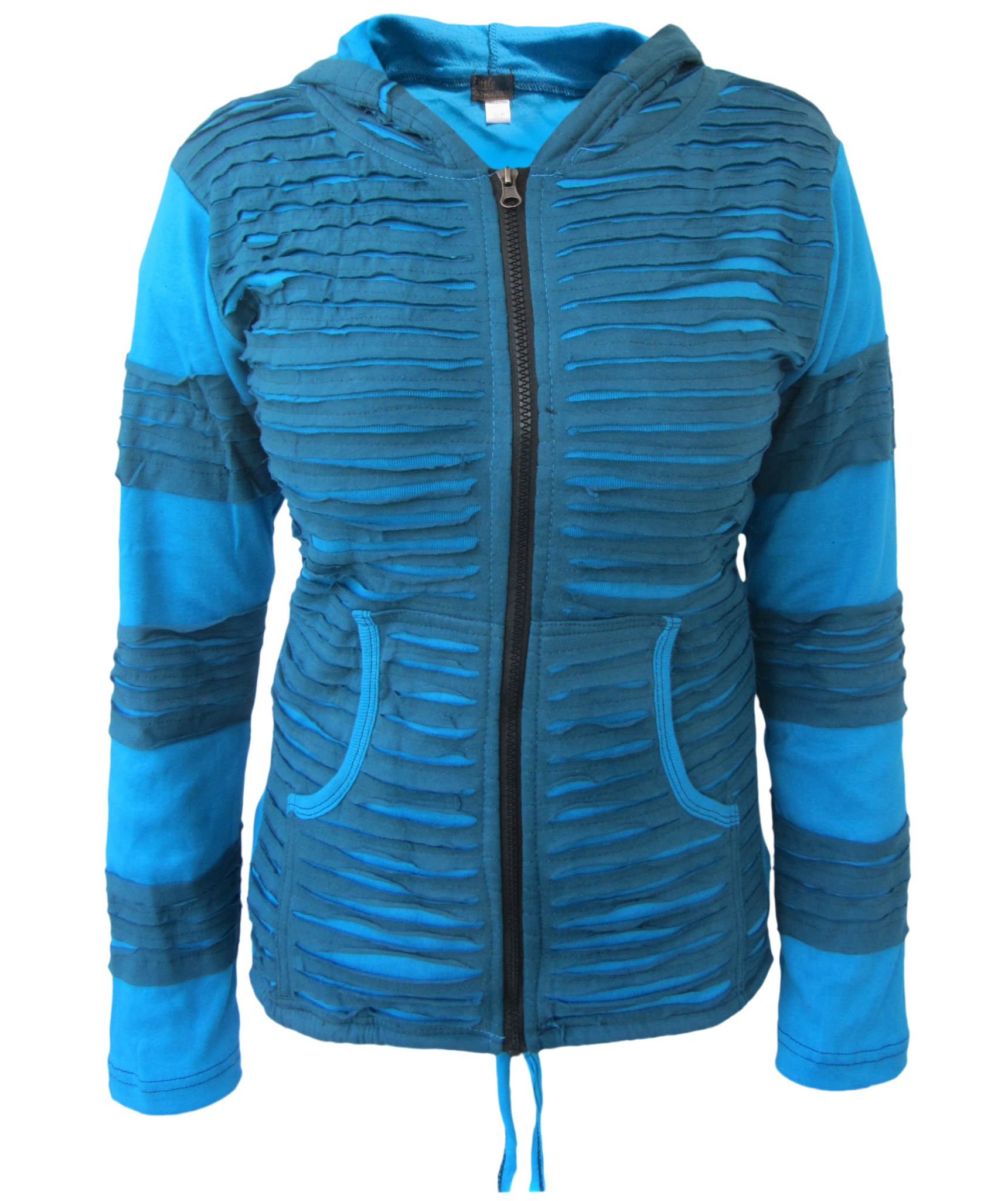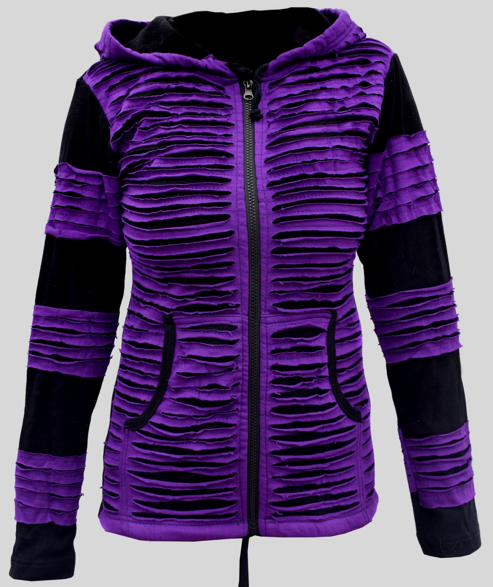 100% Cotton slashed hoodies with pixie hood. We add two layer of fabric and carefully cut the outer one with razor.