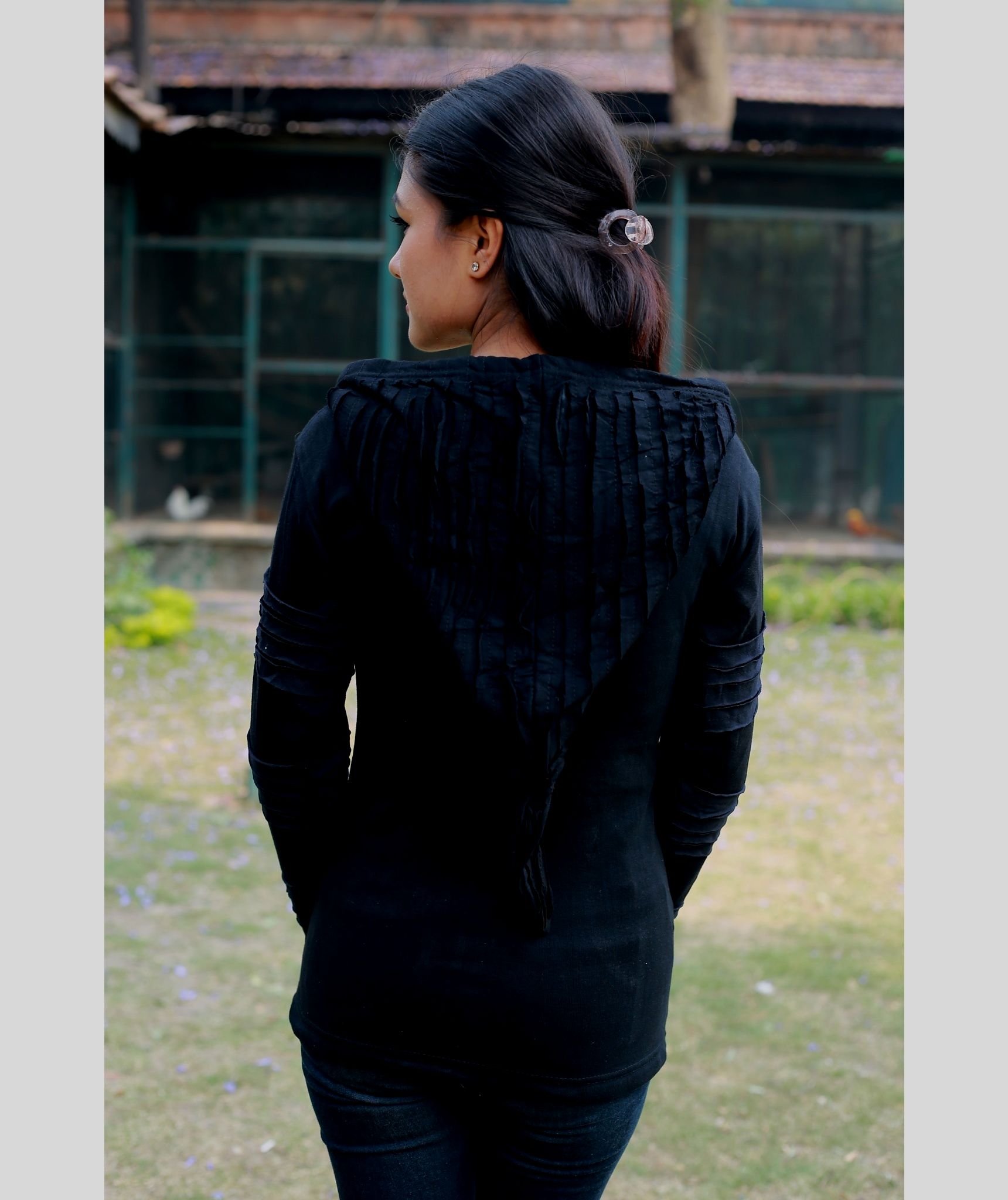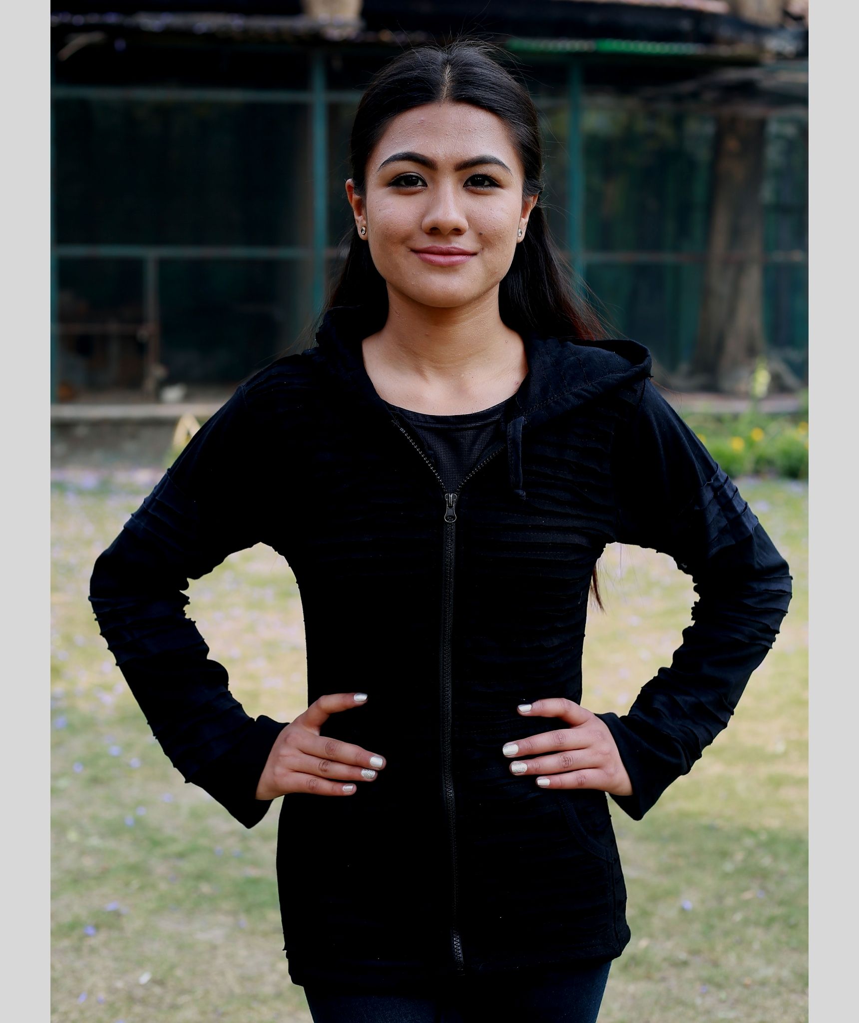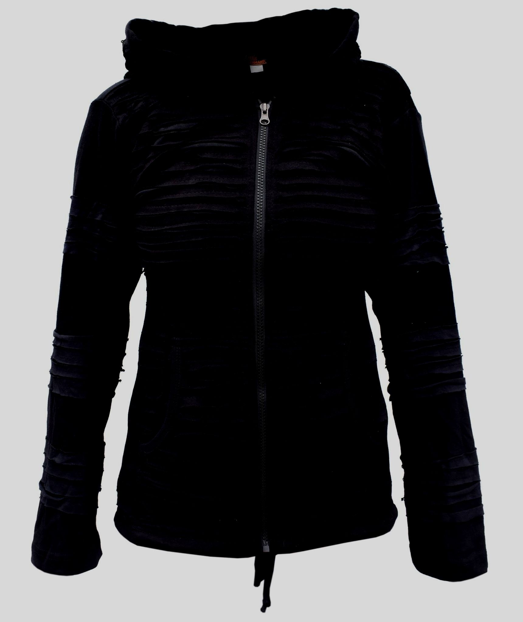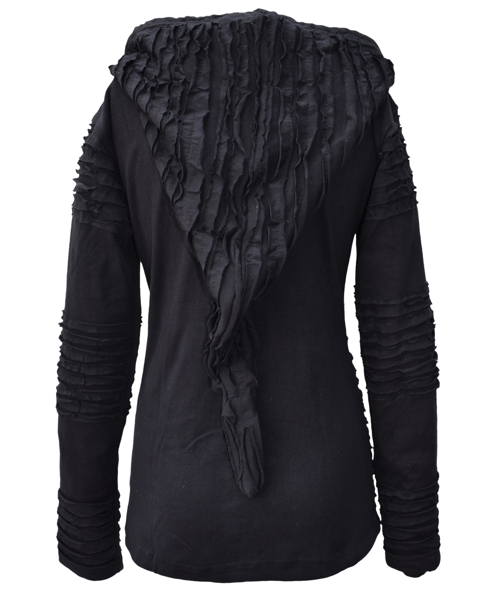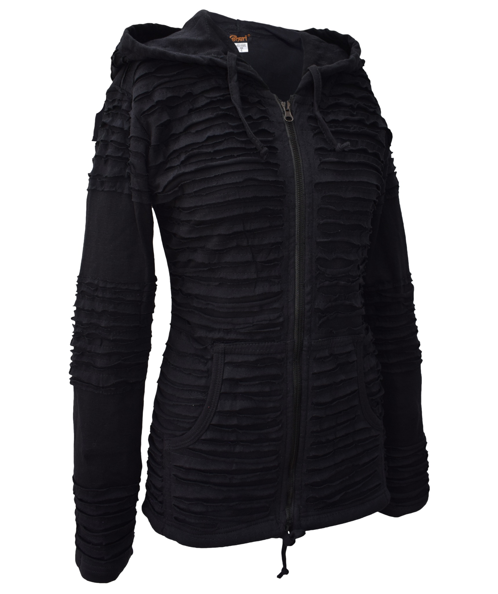 100% Cotton slashed hoodies with pixie hood. We add two layer of fabric and carefully cut the outer one with razor.