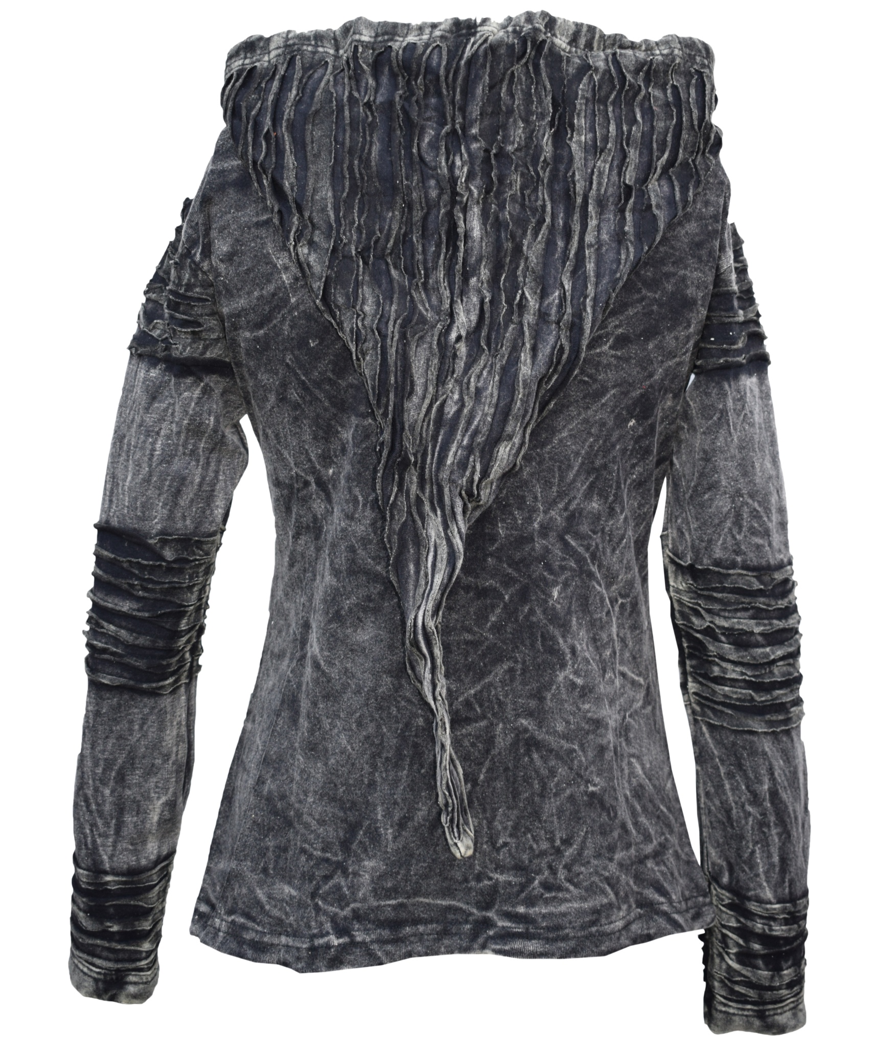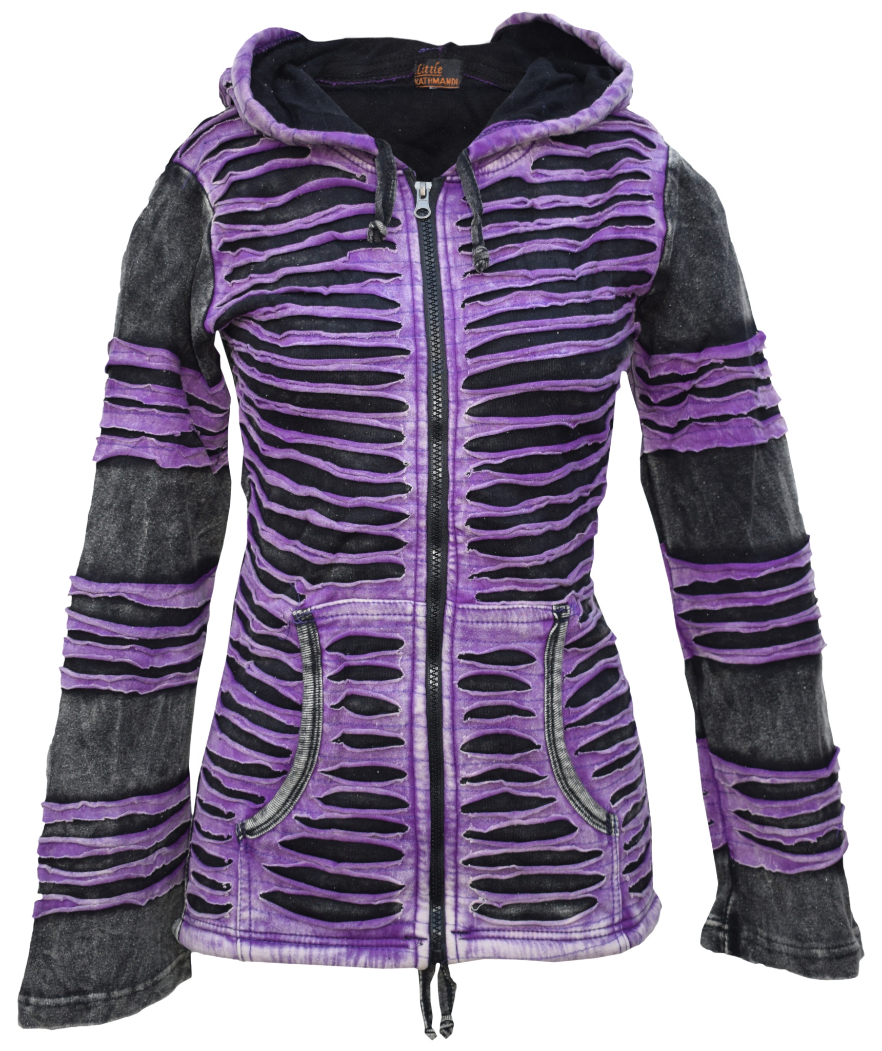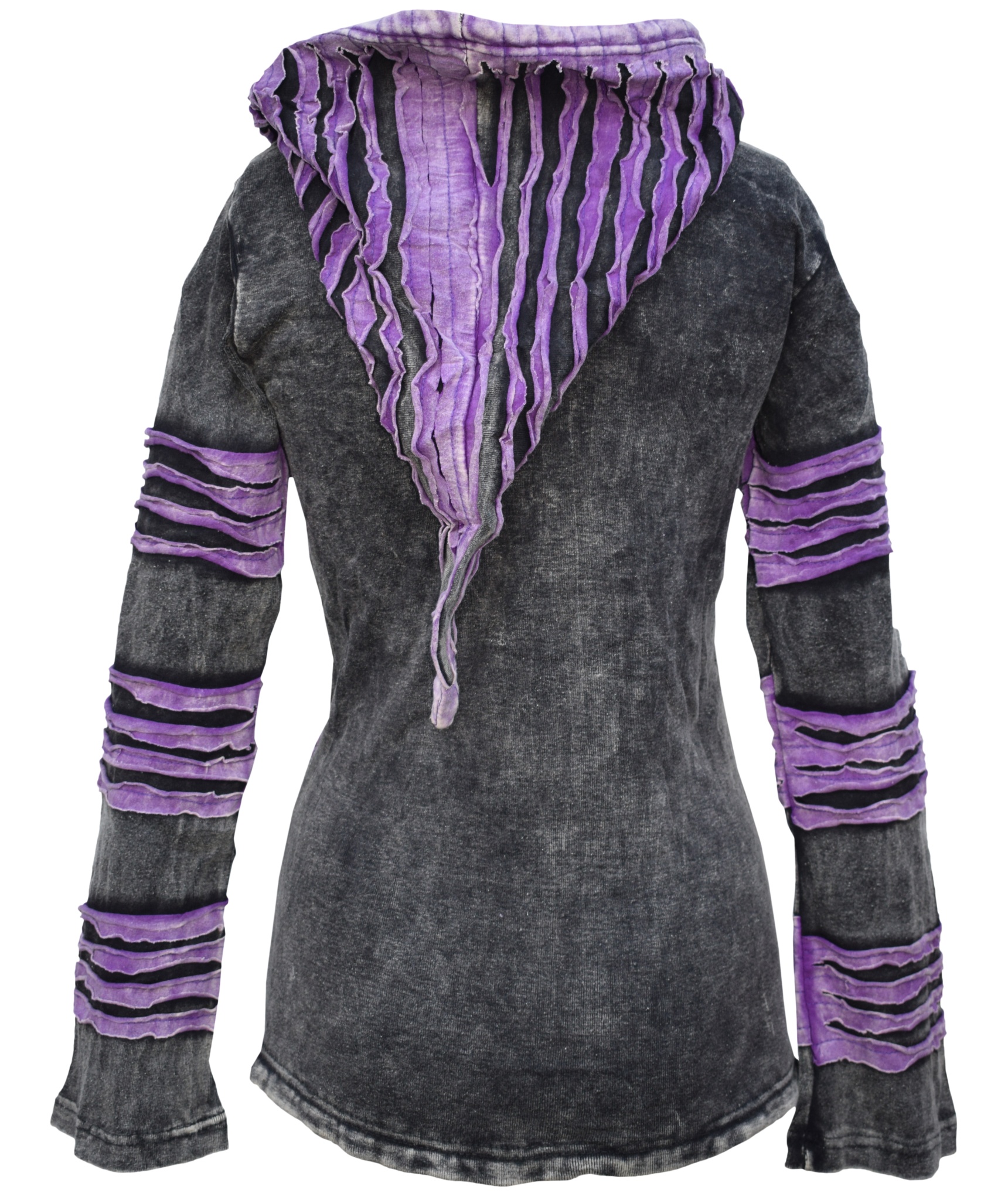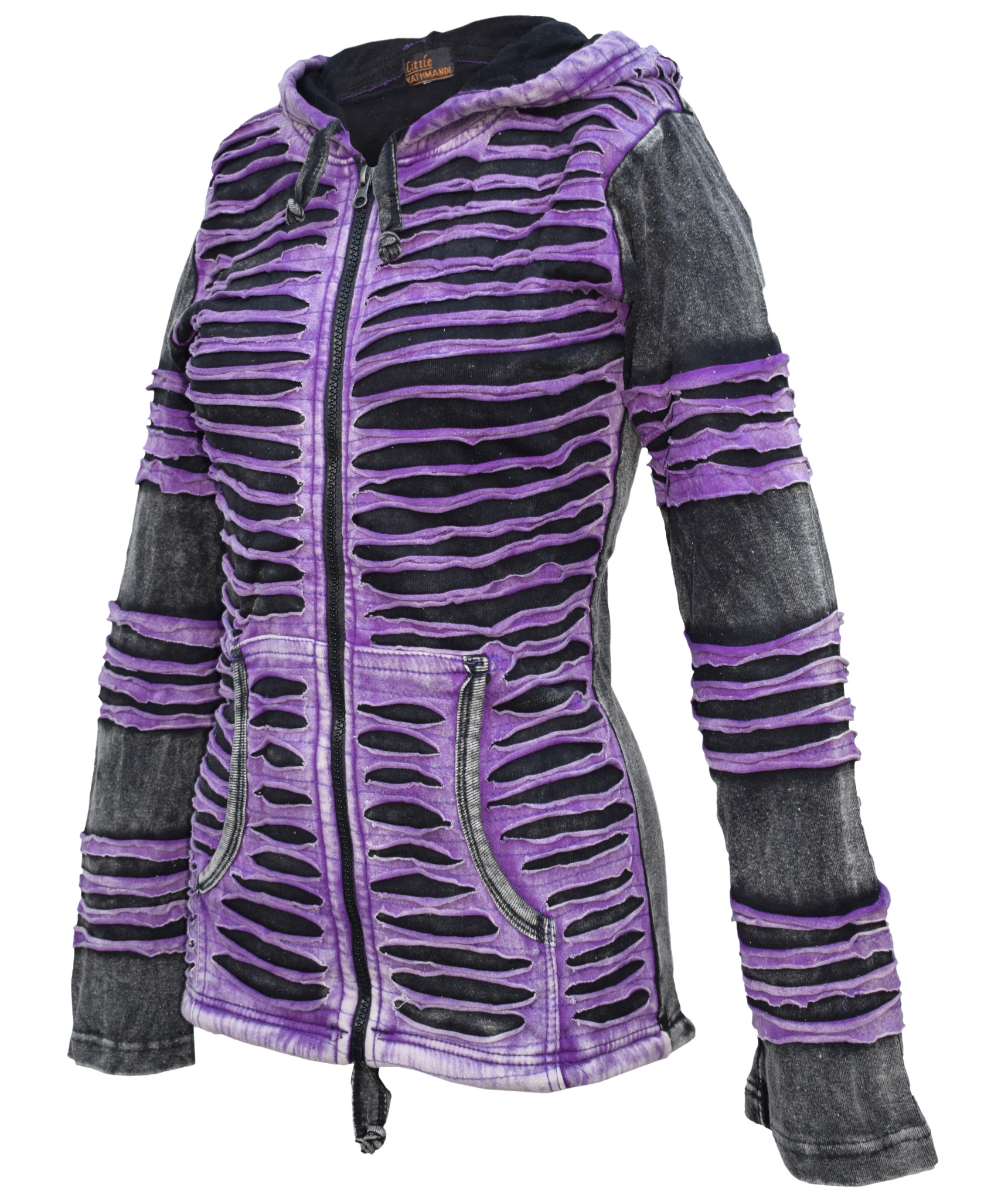 100% Cotton slashed hoodies with pixie hood. We add two layer of fabric and carefully cut the outer one with razor.