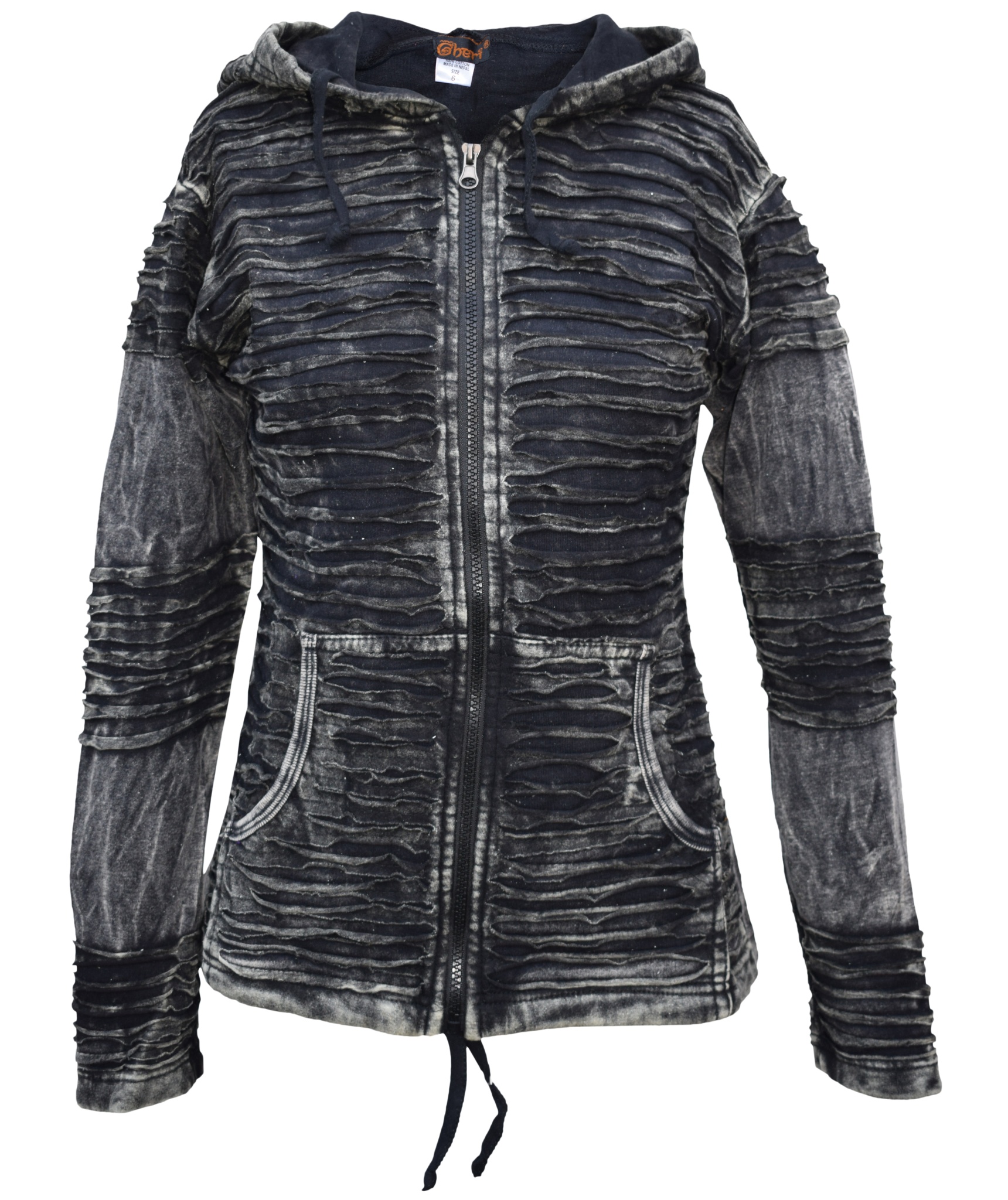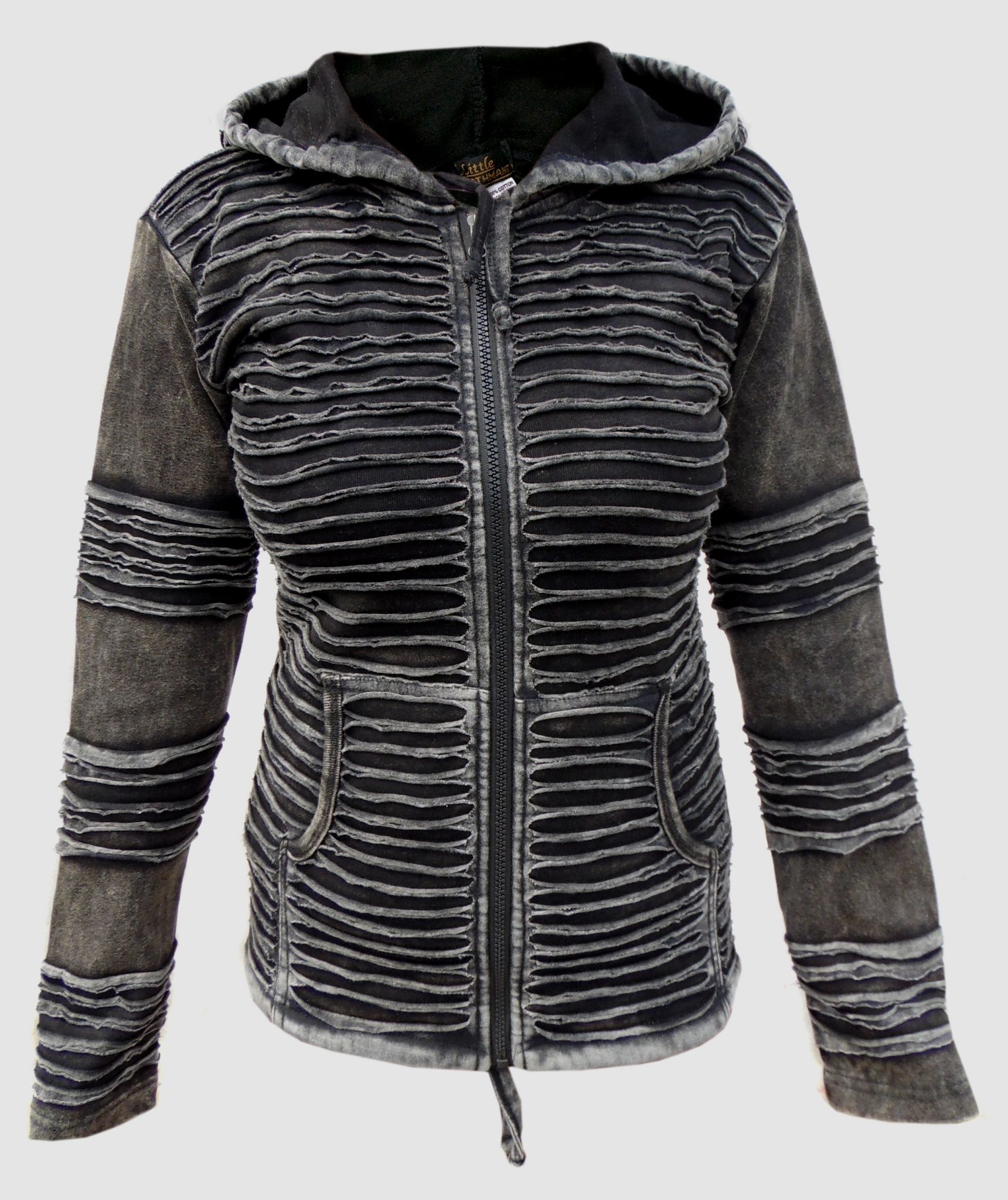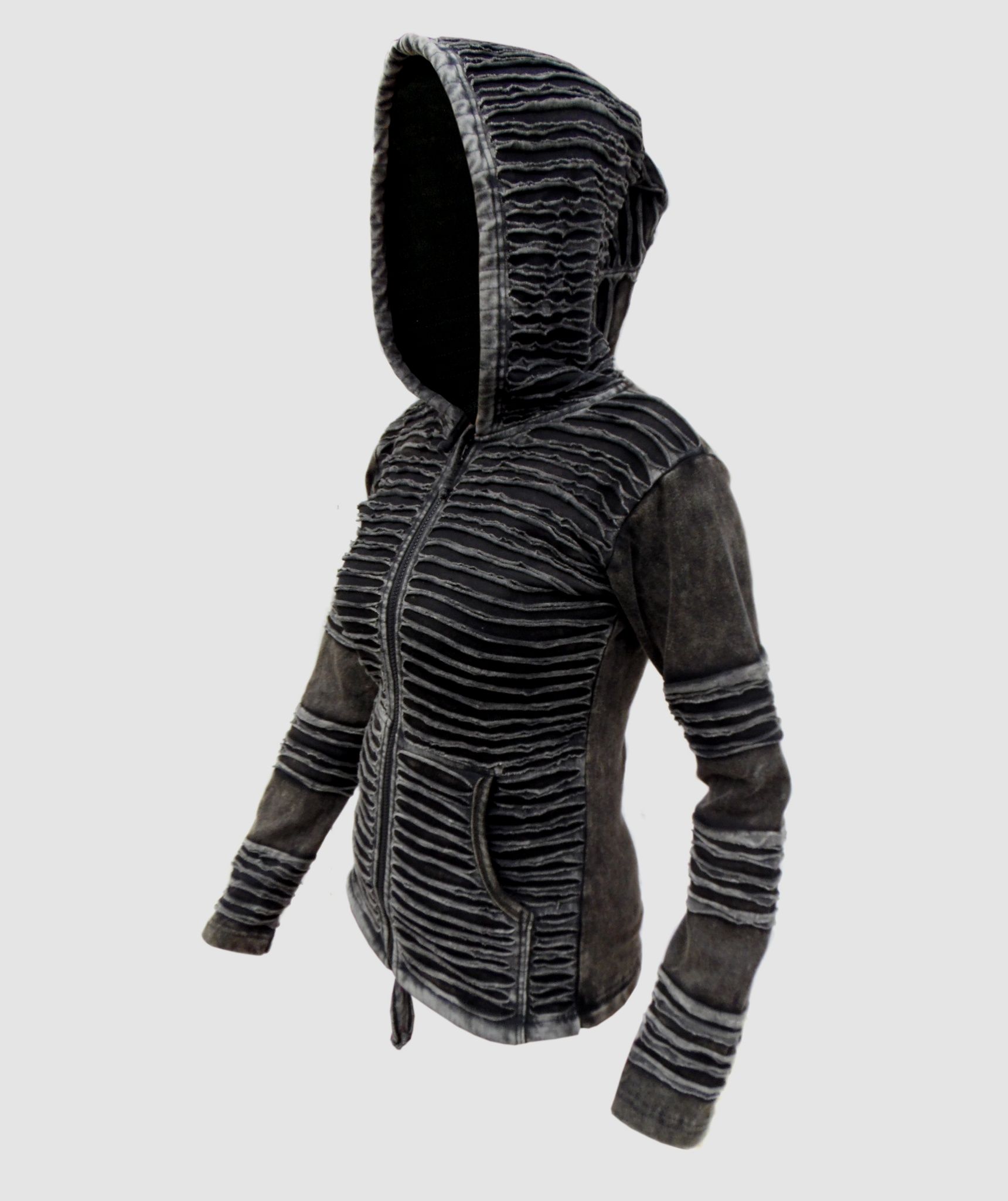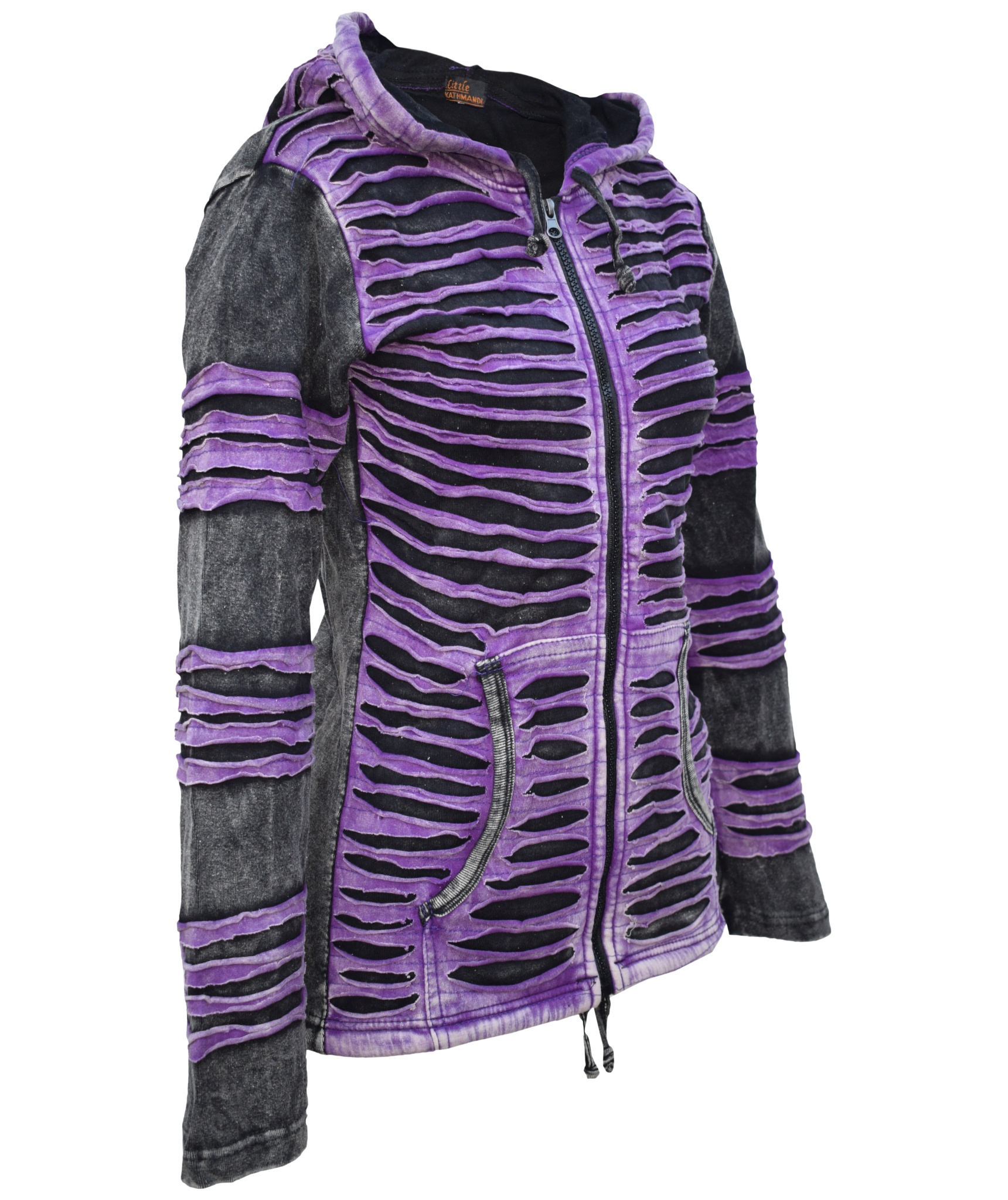 100% Cotton slashed hoodies with pixie hood. We add two layer of fabric and carefully cut the outer one with razor.