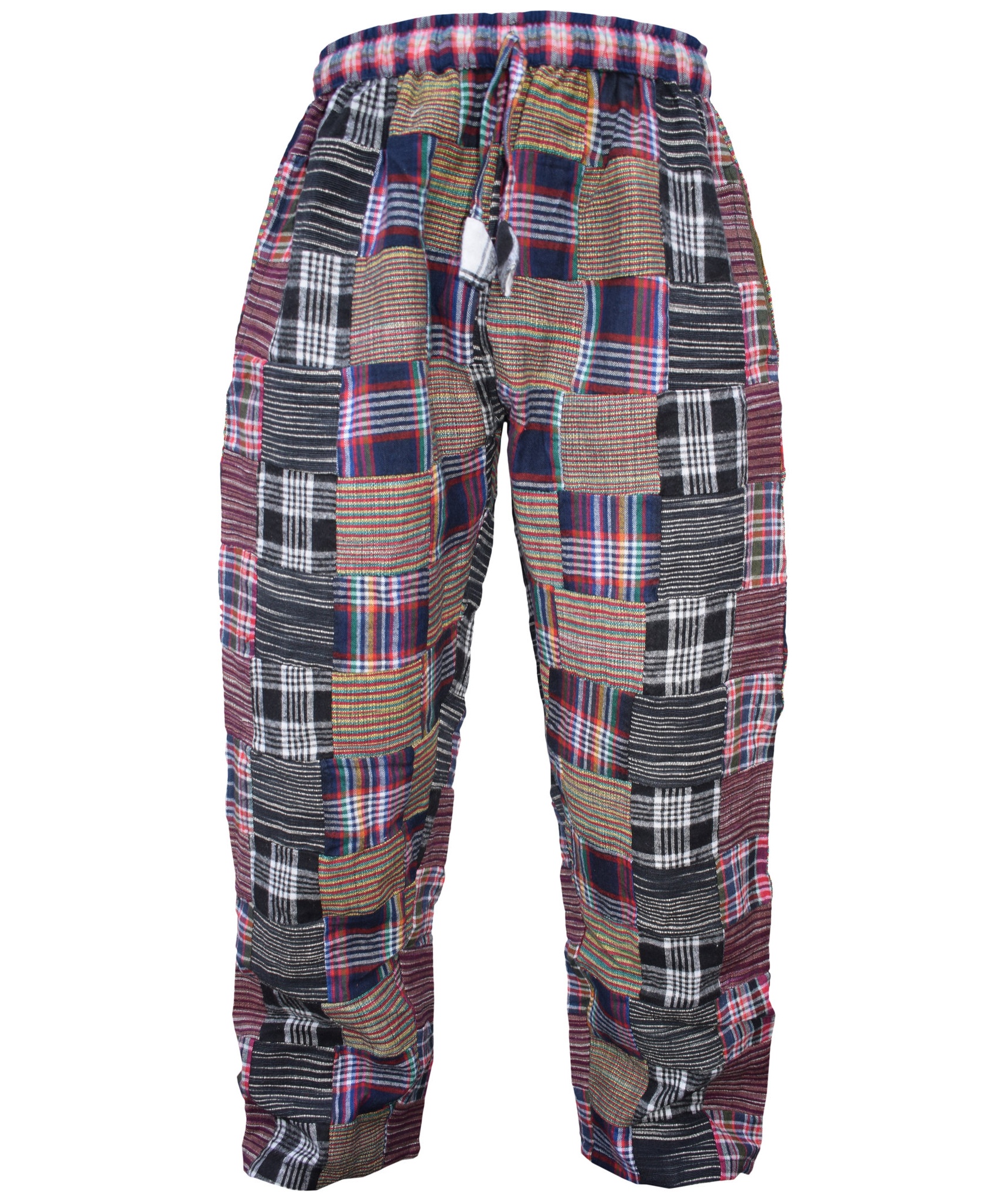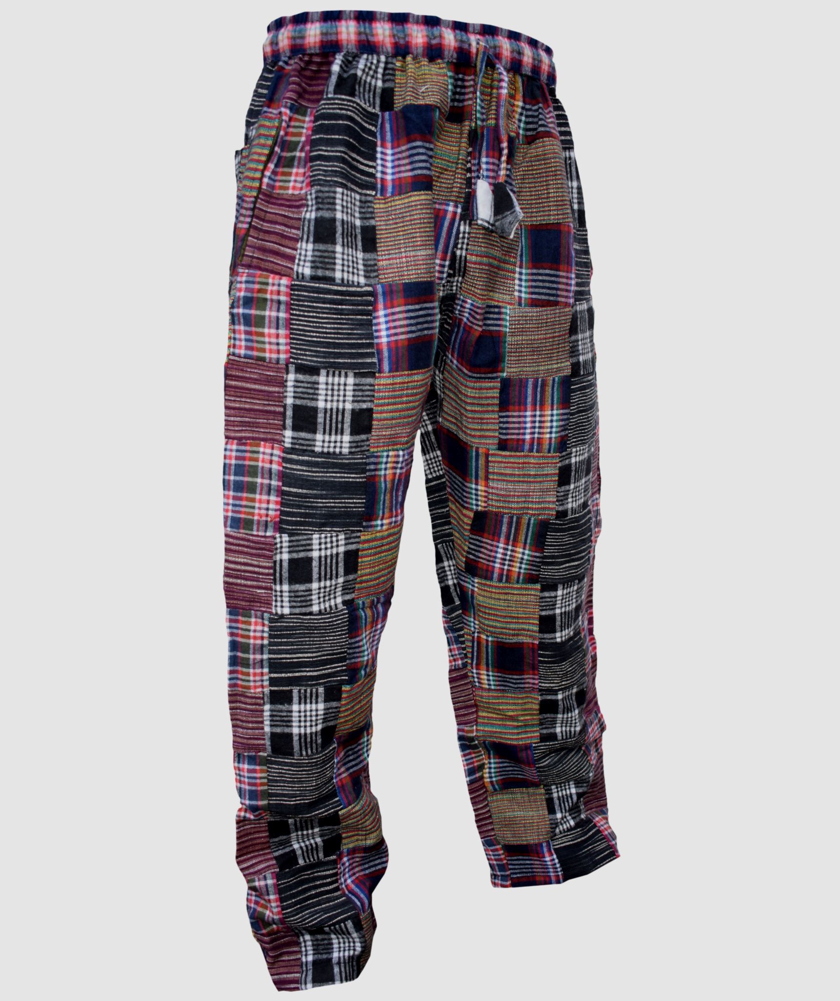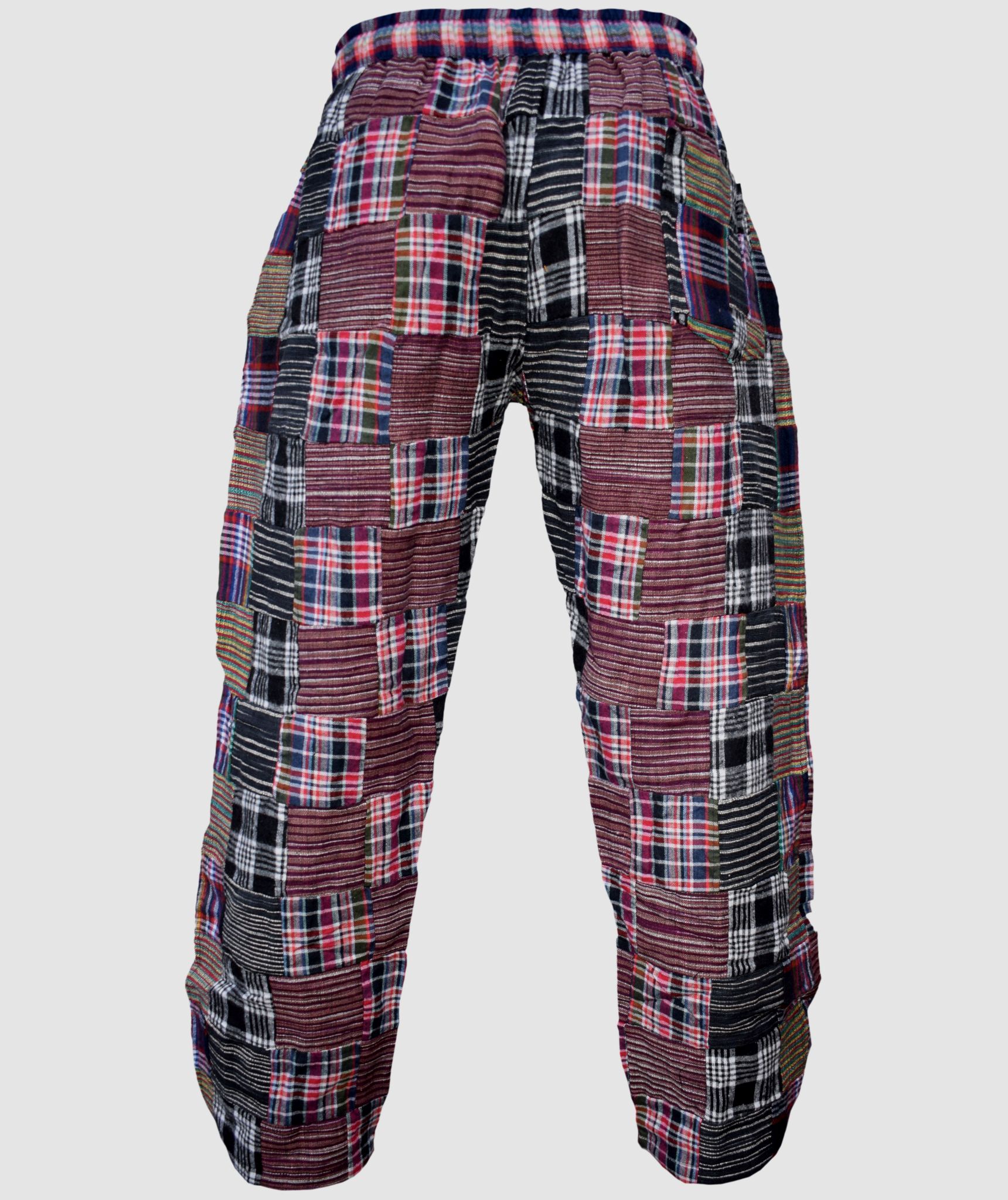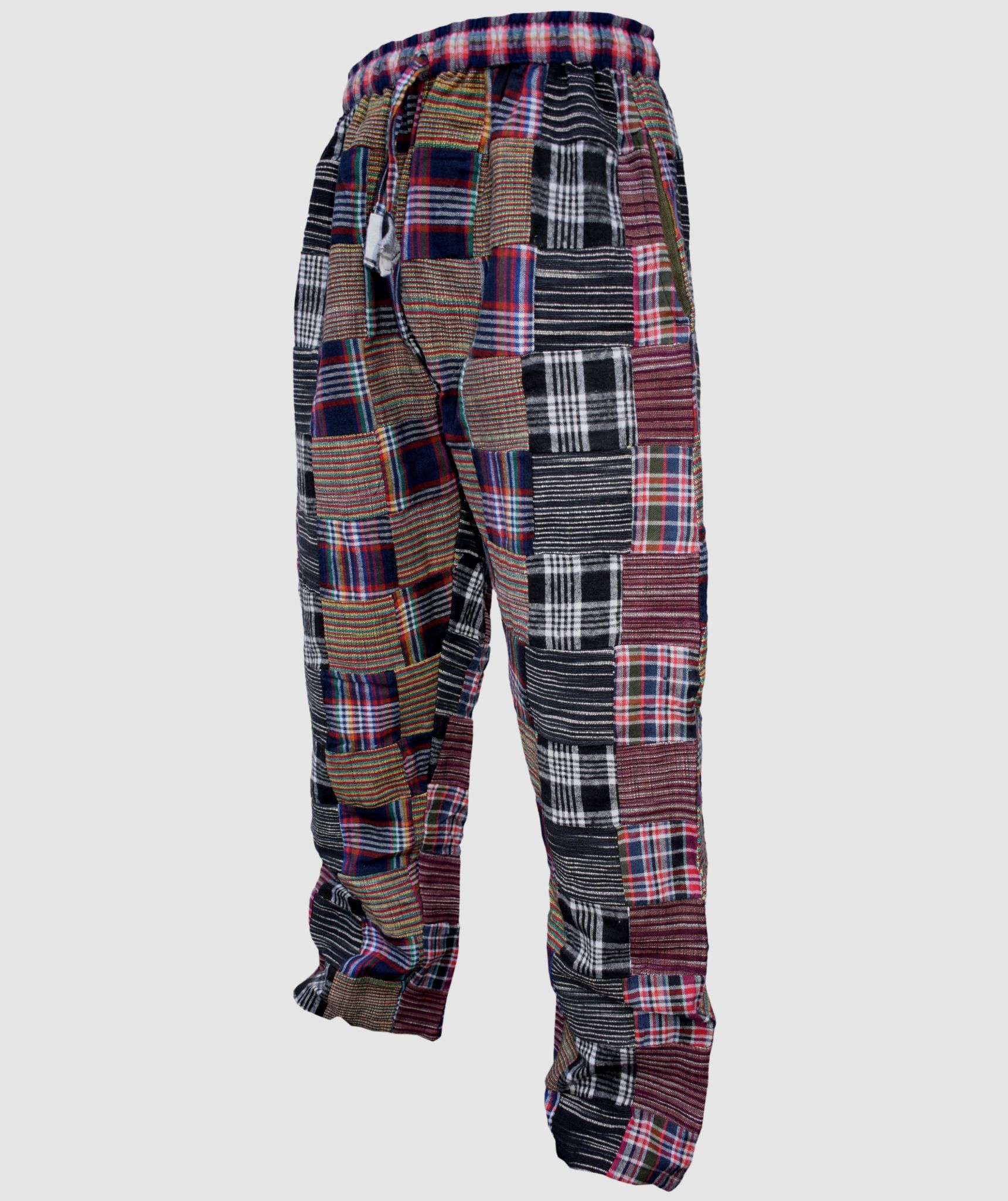Fashionable and comfortable winter cargo style pants suits everyone. Striped patches give a festive and merry vibe. These bohemian trousers will be a great addition to your winter closet. Snug and cozy thick cotton is skin friendly and all natural. There are two side pockets and a back pocket . Elastic waistband and a drawstring is also present.