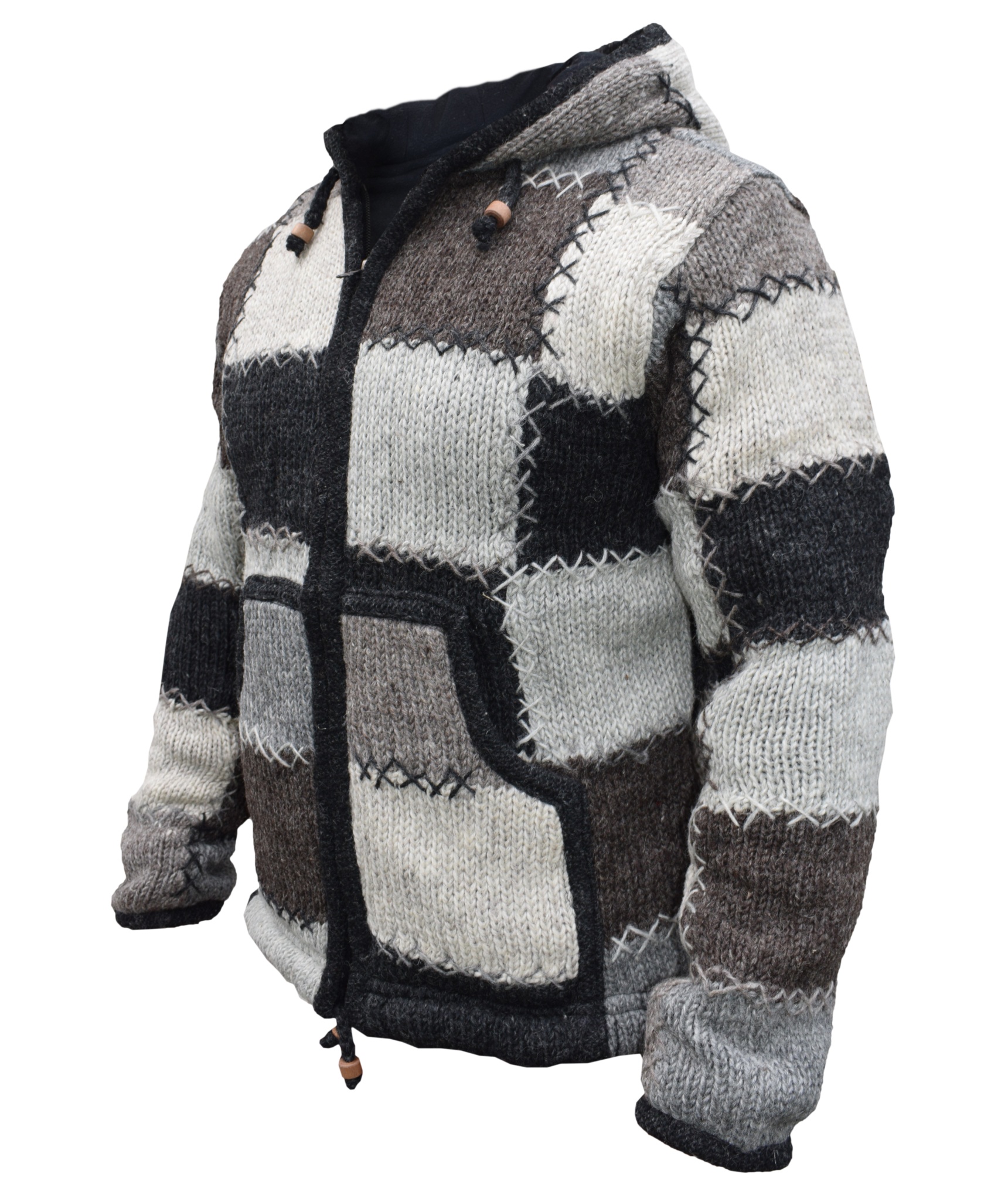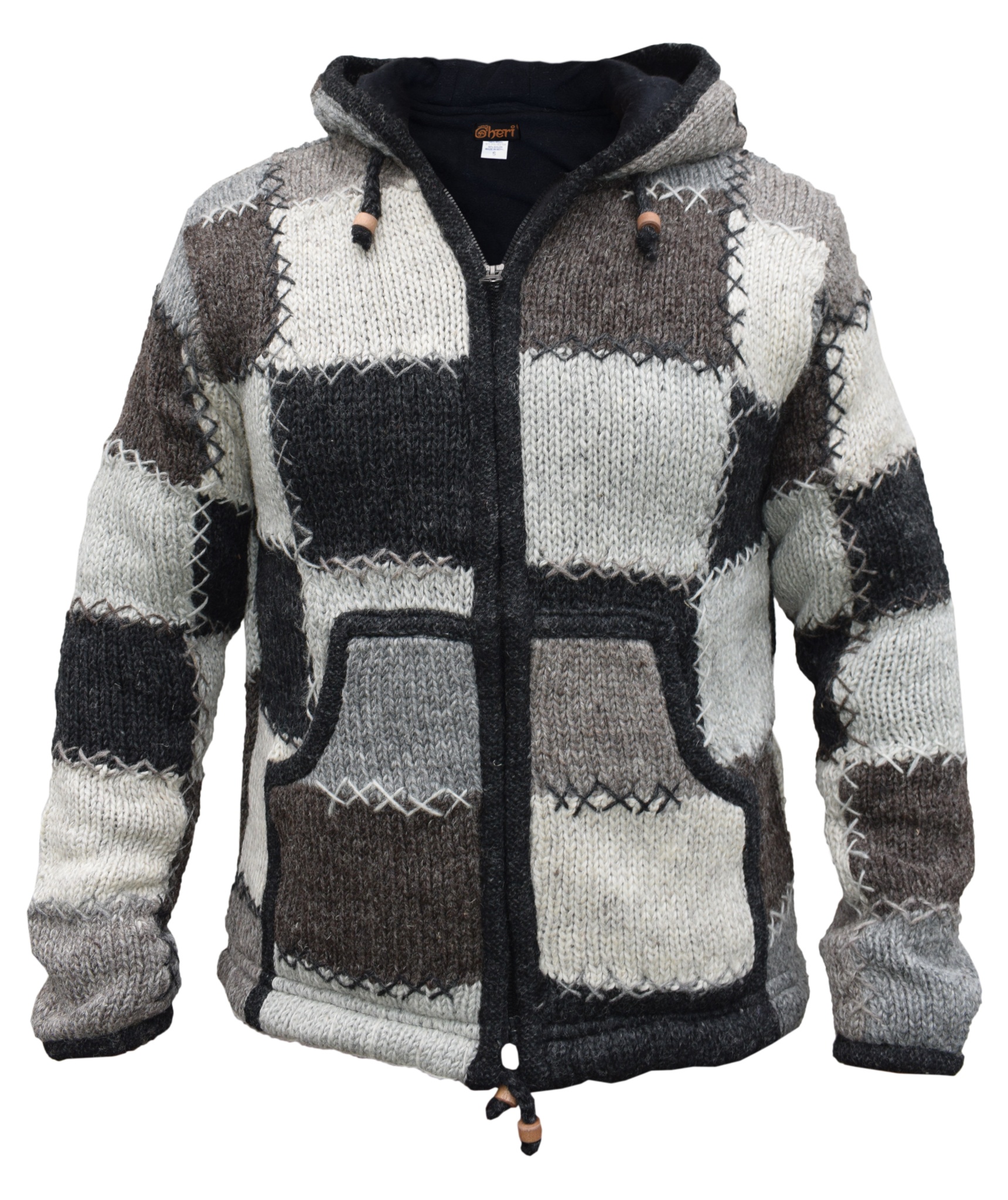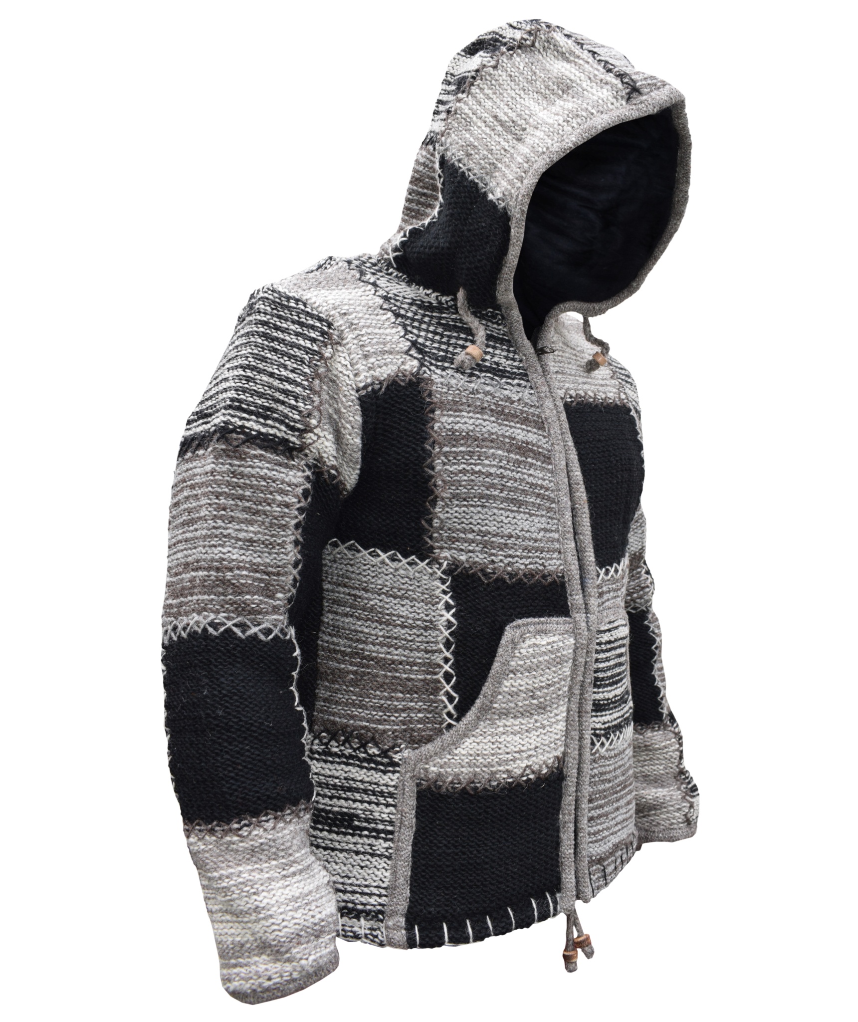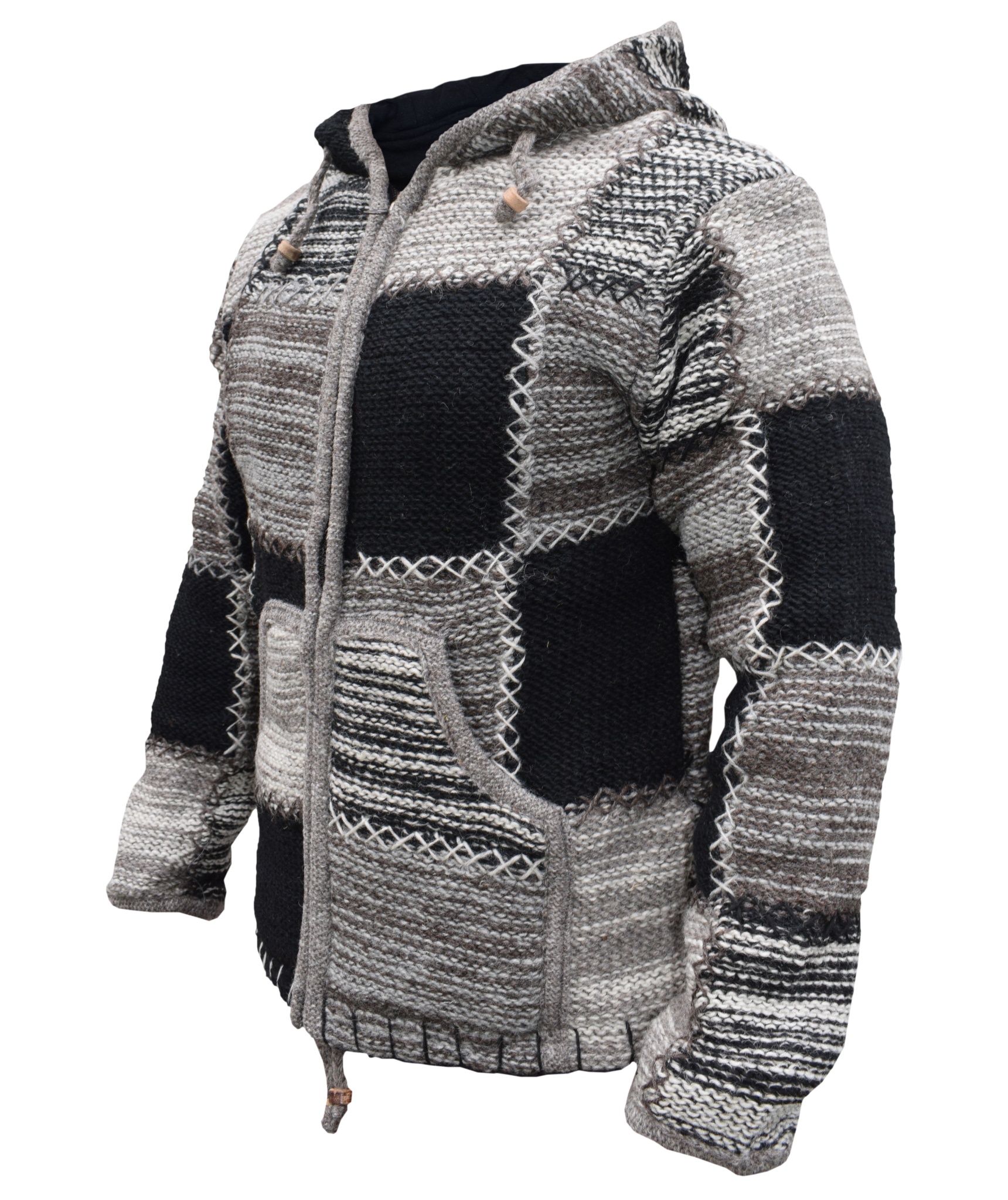 These are one of our popular jackets among woolen design. They are knitted patch jackets where every patch is stitched with wool thread that gives them more natural look. Each of them has two deep front pockets and one inner pocket. Unlike our other Nepalese jackets that are normally single knit, these ones are double knitted making them extra thick and warm. They have drawstring in hood as well as in bottom hem.
