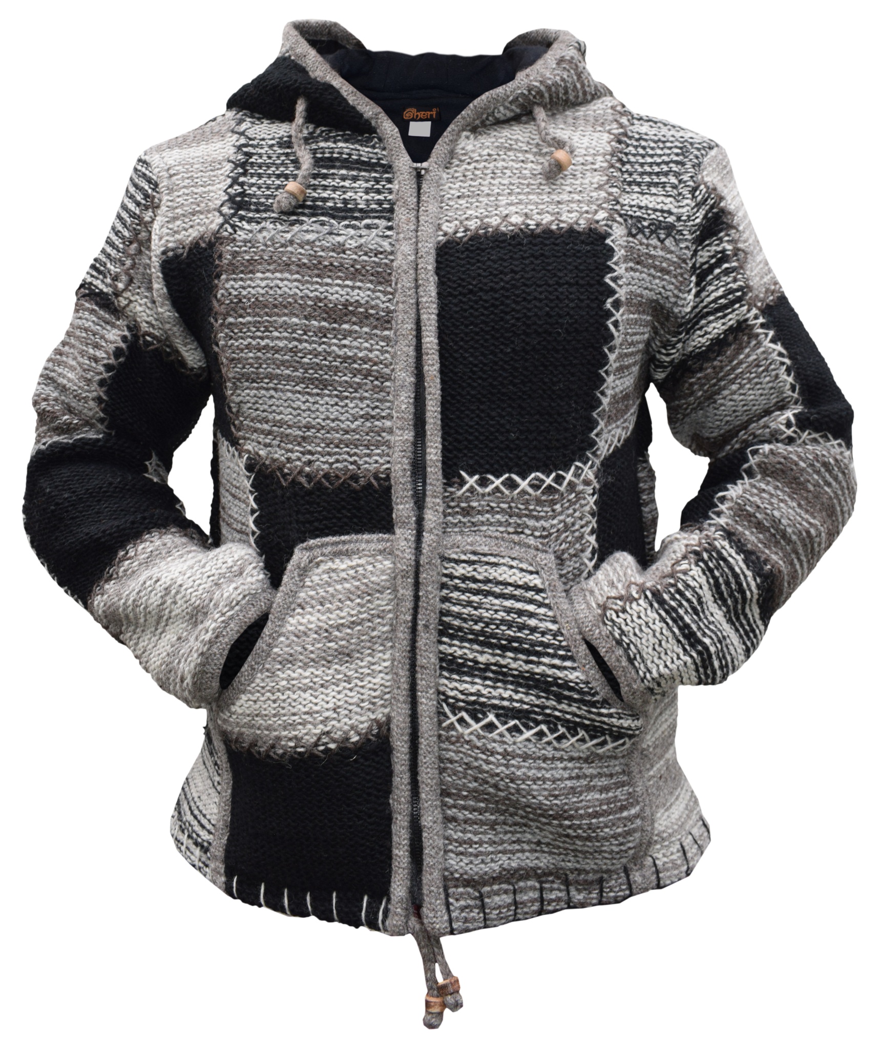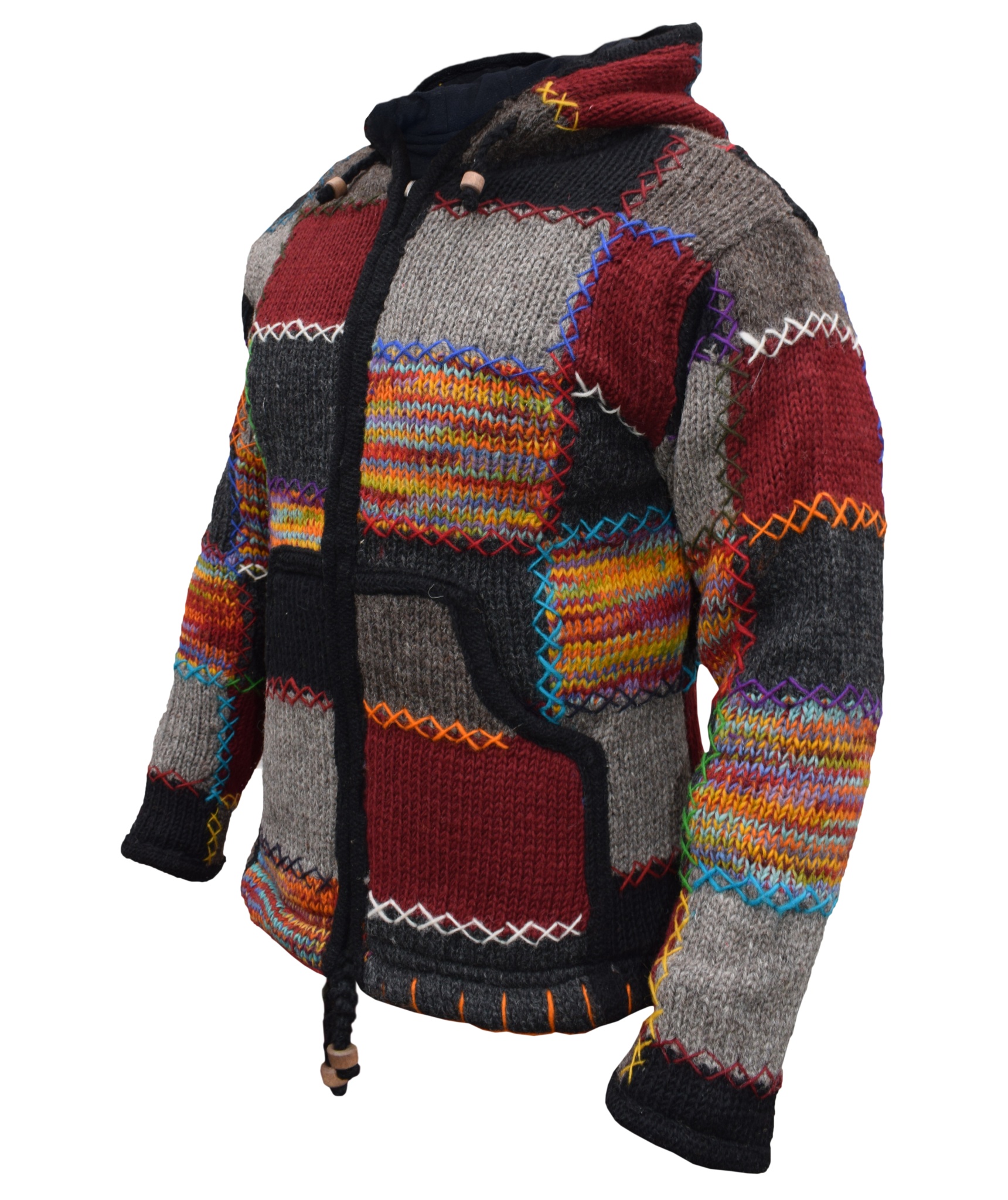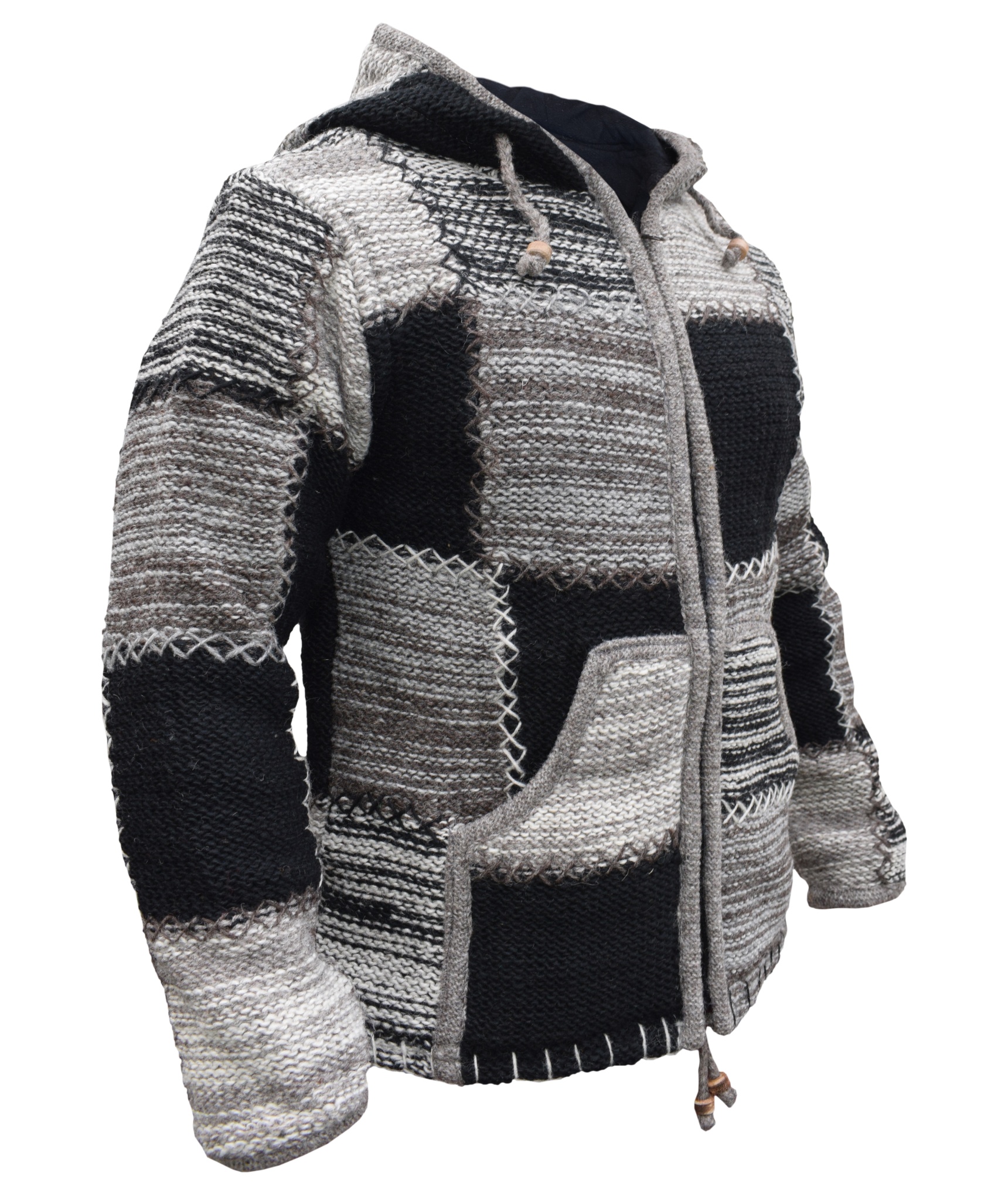 These are one of our popular jackets among woolen design. They are knitted patch jackets where every patch is stitched with wool thread that gives them more natural look. Each of them has two deep front pockets and one inner pocket. Unlike our other Nepalese jackets that are normally single knit, these ones are double knitted making them extra thick and warm. They have drawstring in hood as well as in bottom hem.