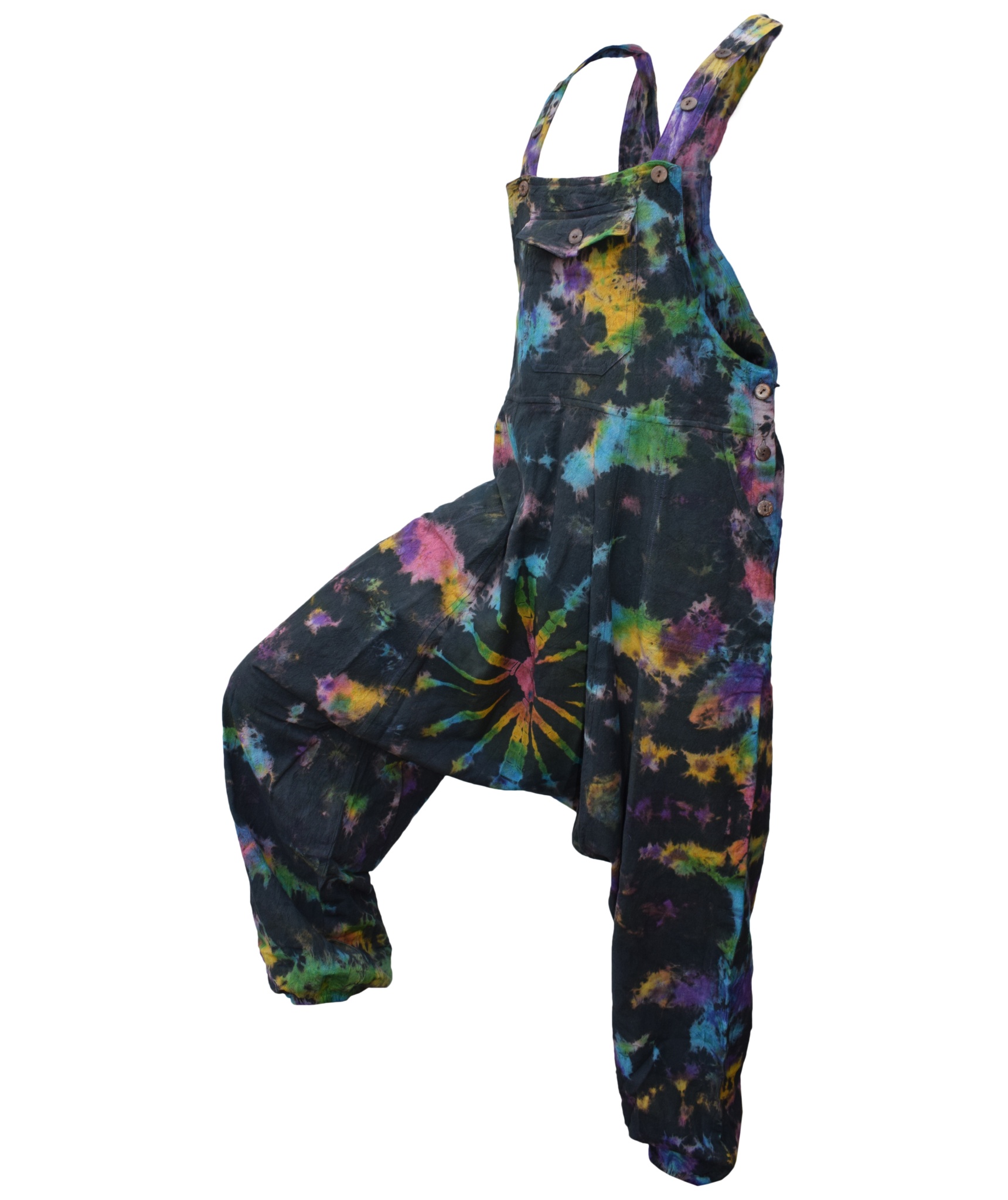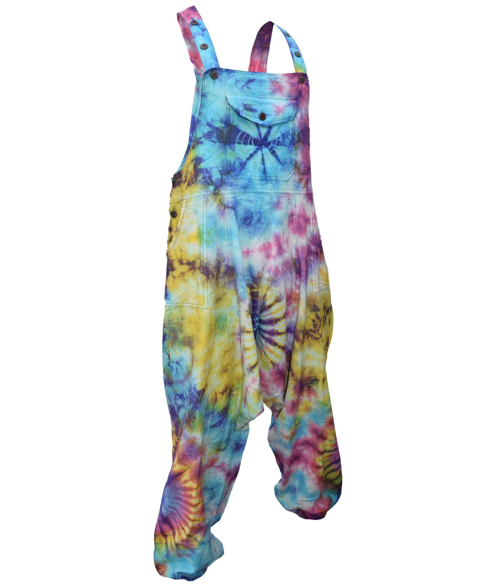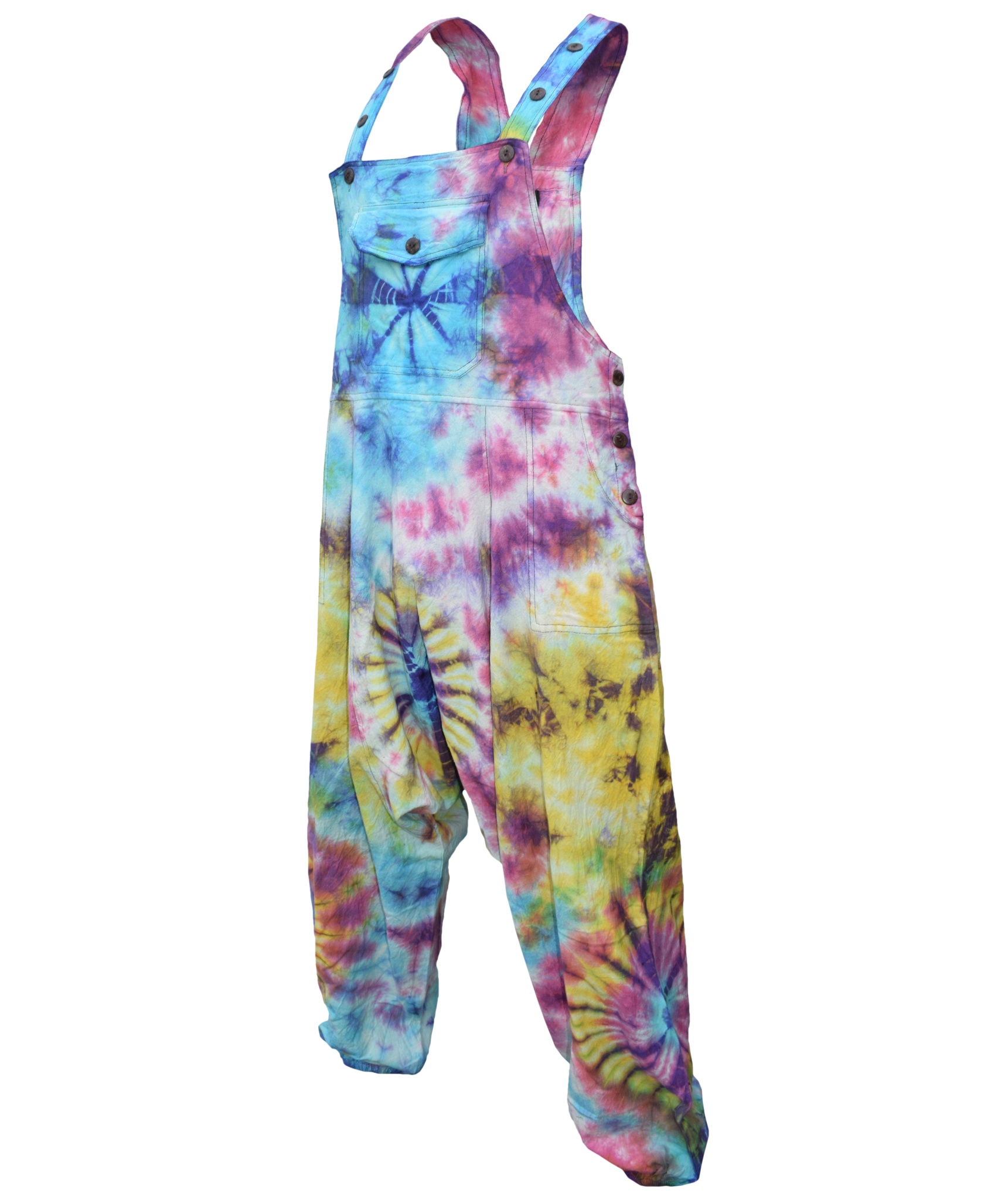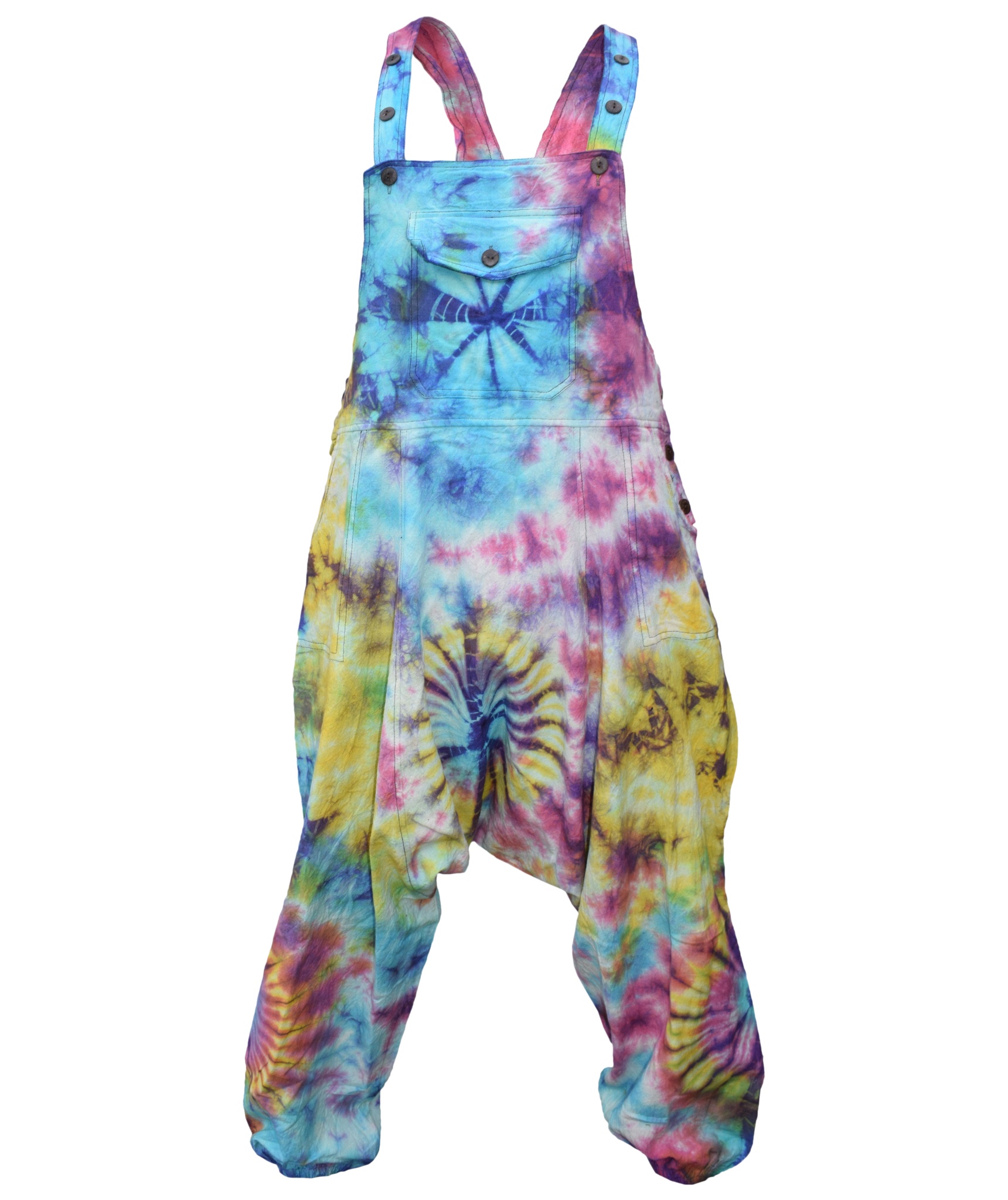 These dungarees are the unique combination of urban swag and traditional Gheri fashion wear. The tie dye design gives these dungarees most unique style in whole of dungaree market. They are designed for most comfort and are light weighted. The material used is 100% Nepalese natural cotton. These dungarees have traditional one pocket on the body, 2 side pockets and an additional 2 back patch pockets. It is suitable for casual wear, festivals or lounging. These overall harem pants will look awesome on both male and female as they are unisex. Layer overt t shirts or vests. The measurements are as follows <br><br>.