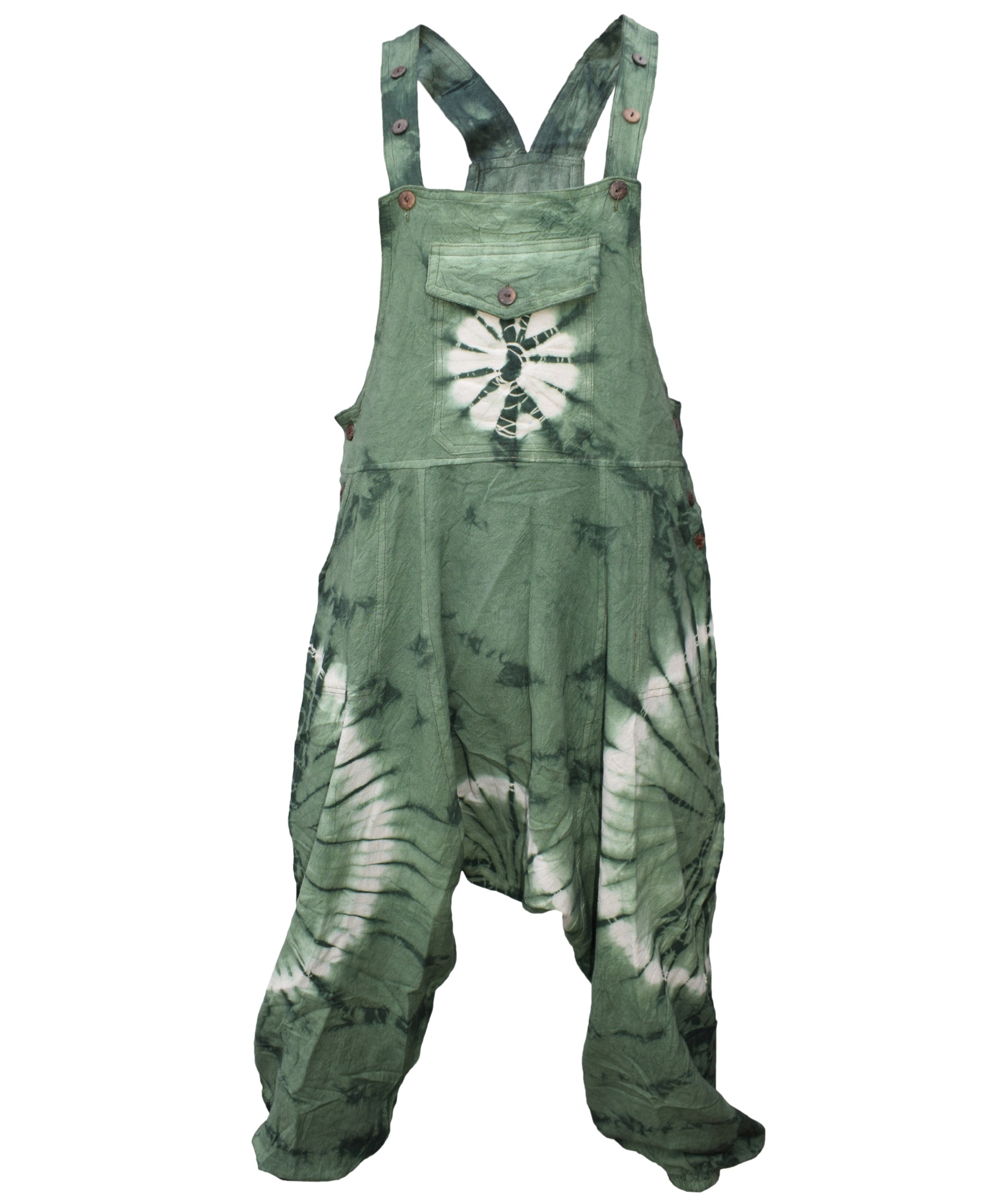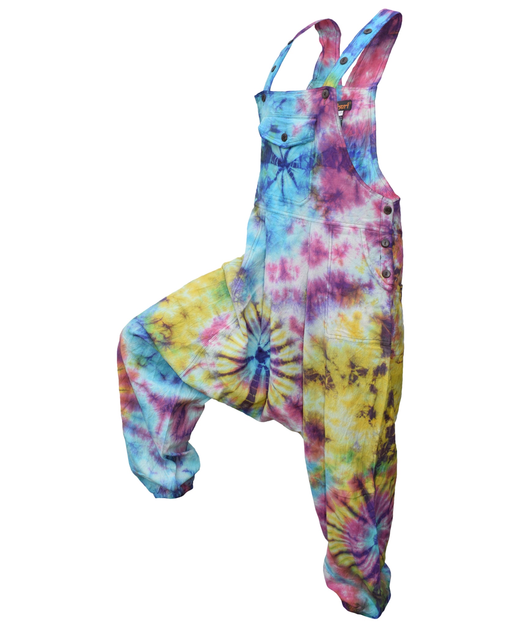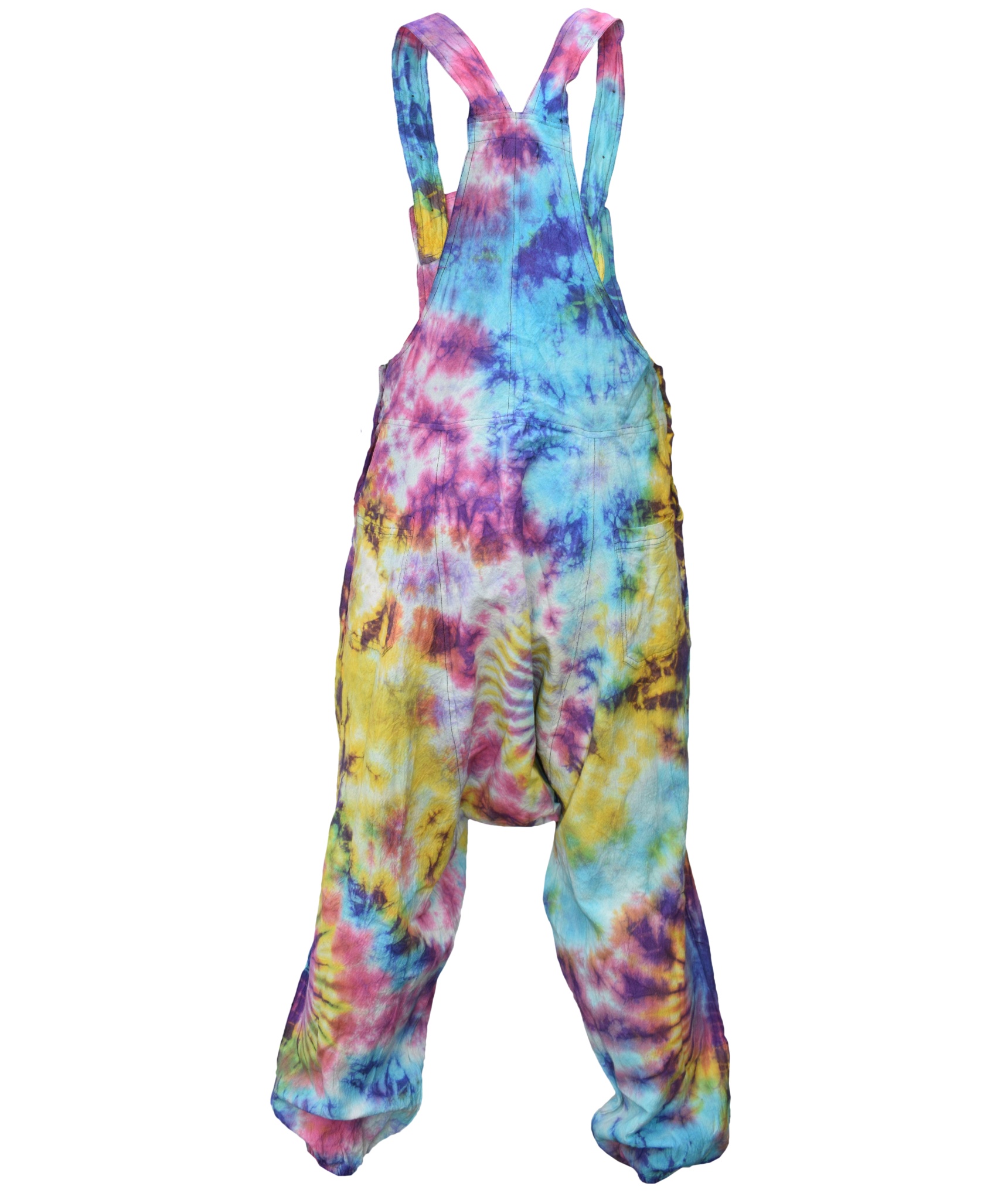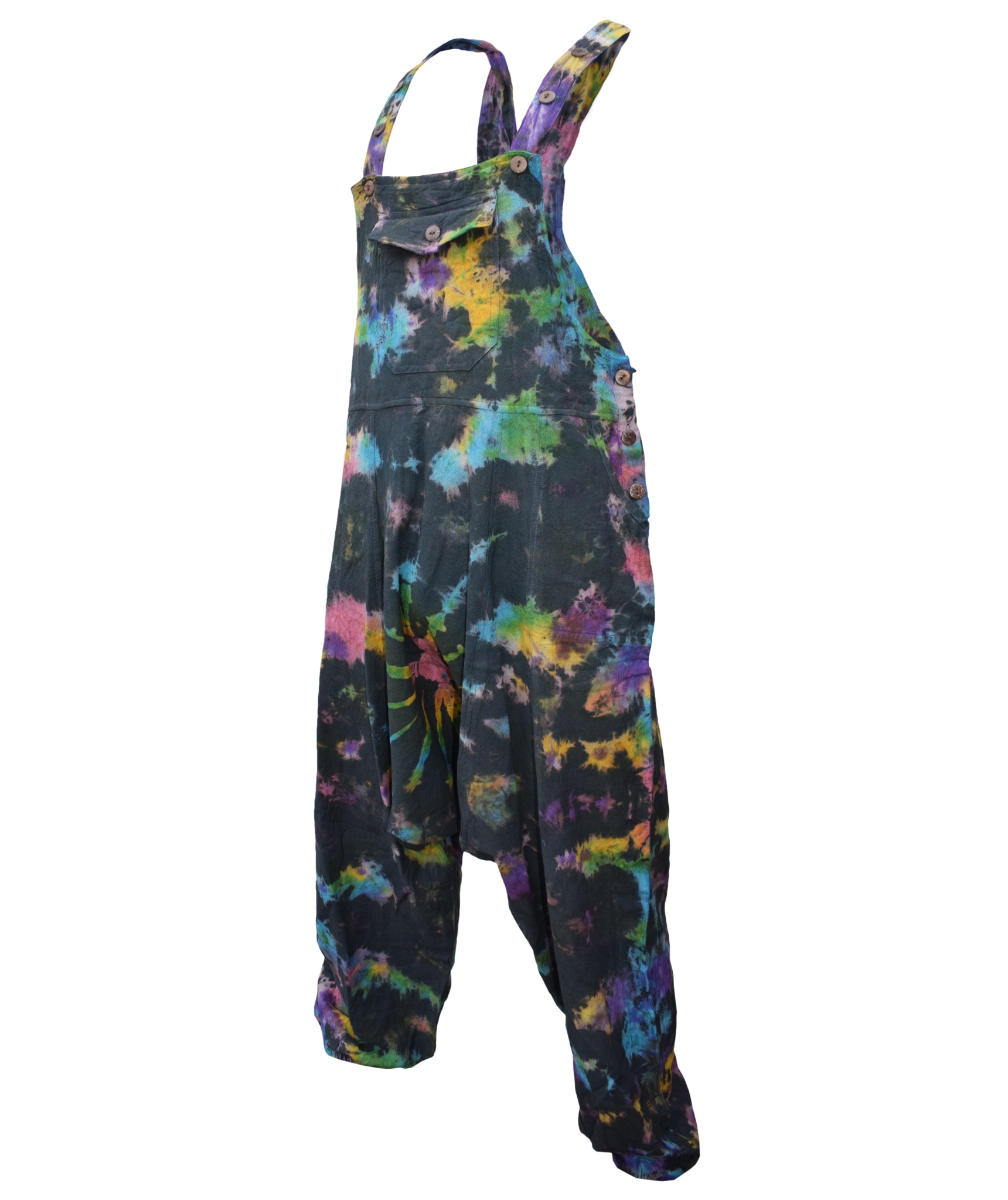 These dungarees are the unique combination of urban swag and traditional Gheri fashion wear. The tie dye design gives these dungarees most unique style in whole of dungaree market. They are designed for most comfort and are light weighted. The material used is 100% Nepalese natural cotton. These dungarees have traditional one pocket on the body, 2 side pockets and an additional 2 back patch pockets. It is suitable for casual wear, festivals or lounging. These overall harem pants will look awesome on both male and female as they are unisex. Layer overt t shirts or vests. The measurements are as follows <br><br>.