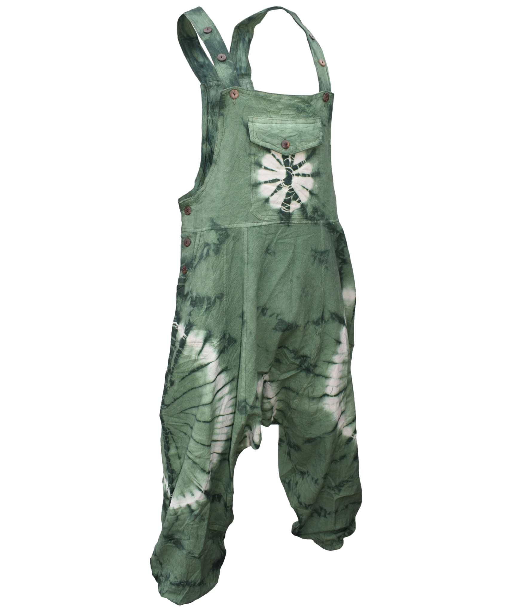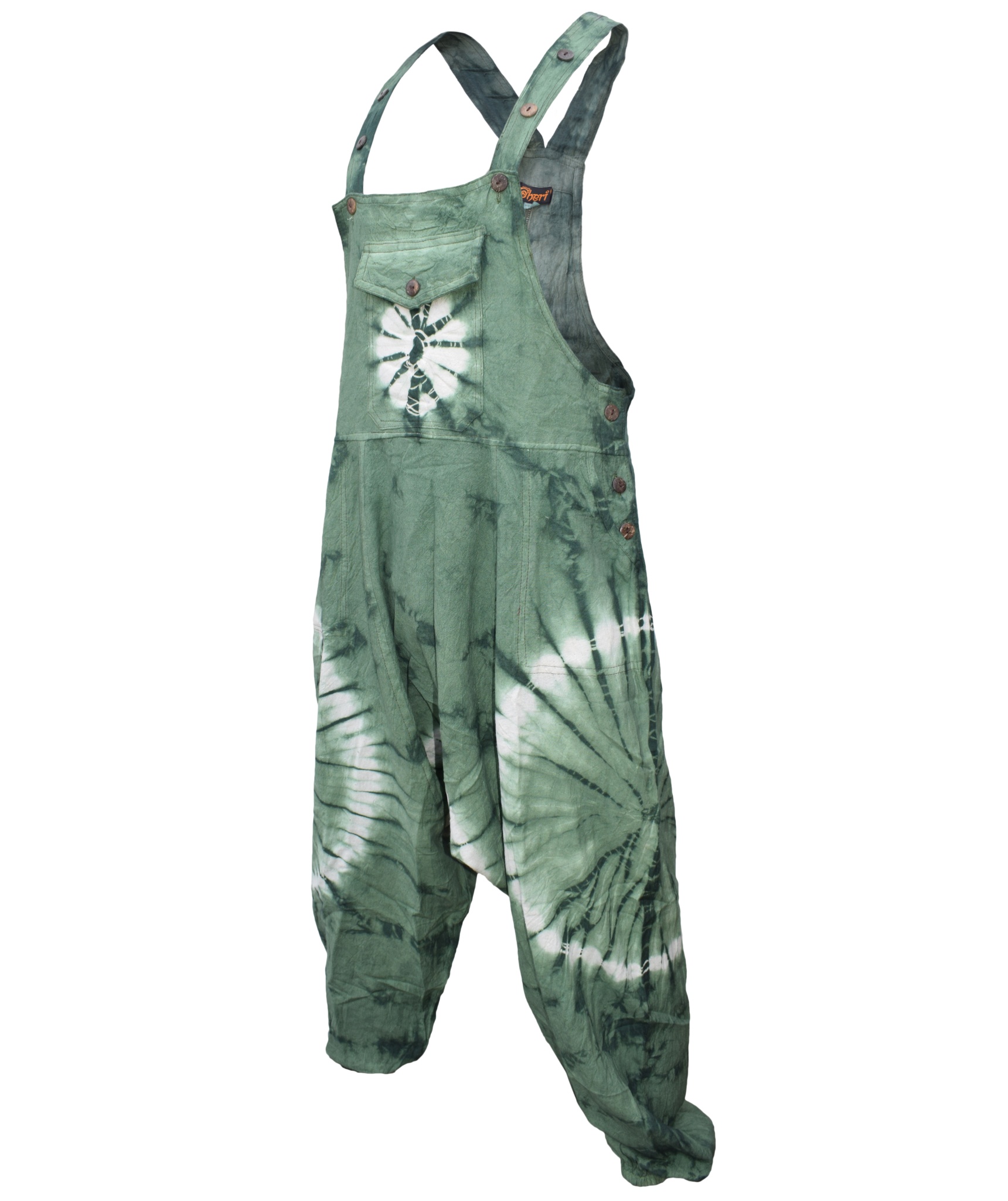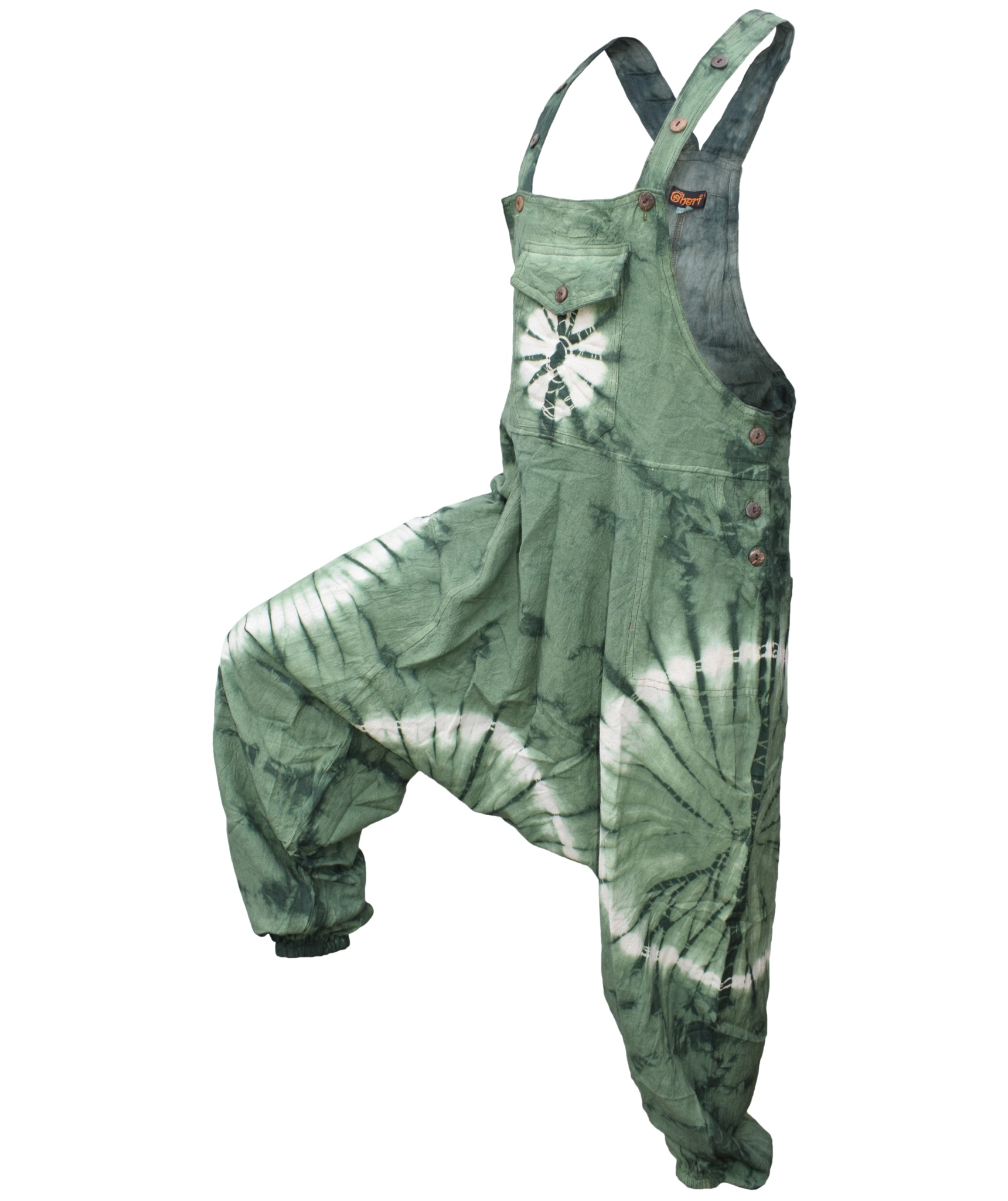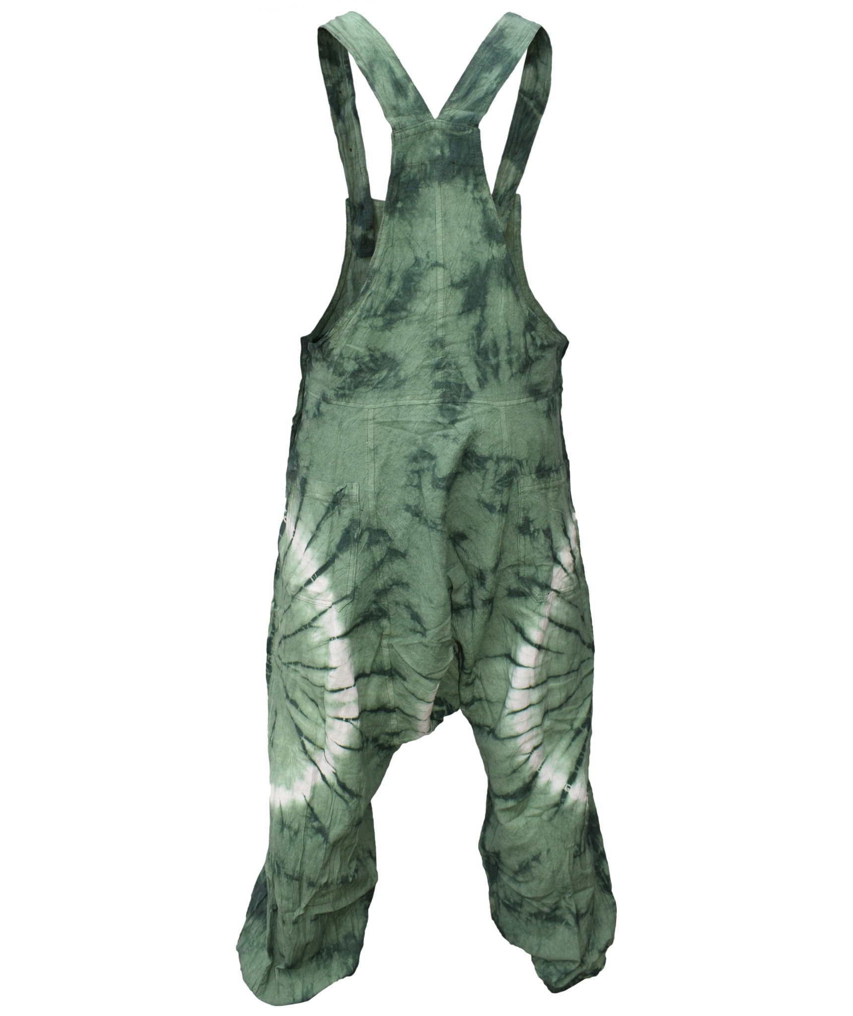 These dungarees are the unique combination of urban swag and traditional Gheri fashion wear. The tie dye design gives these dungarees most unique style in whole of dungaree market. They are designed for most comfort and are light weighted. The material used is 100% Nepalese natural cotton. These dungarees have traditional one pocket on the body, 2 side pockets and an additional 2 back patch pockets. It is suitable for casual wear, festivals or lounging. These overall harem pants will look awesome on both male and female as they are unisex. Layer overt t shirts or vests. The measurements are as follows <br><br>.