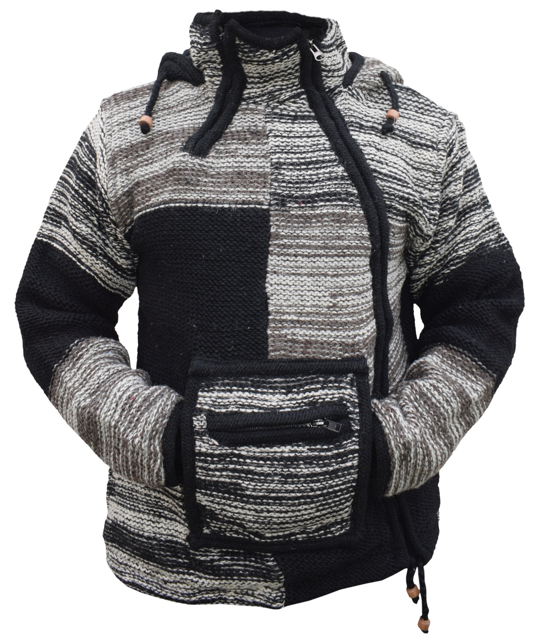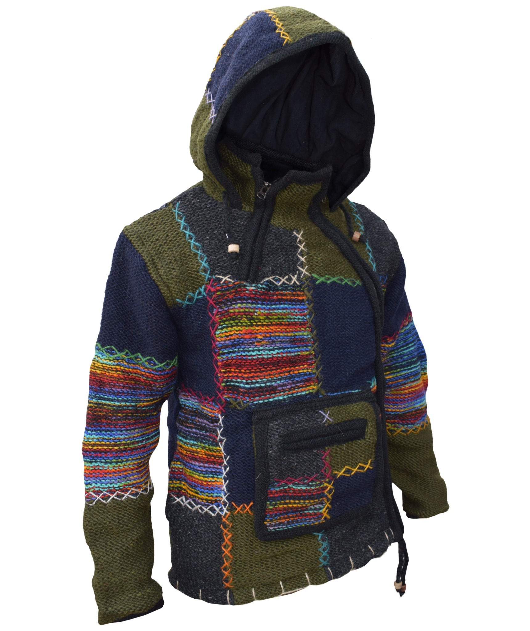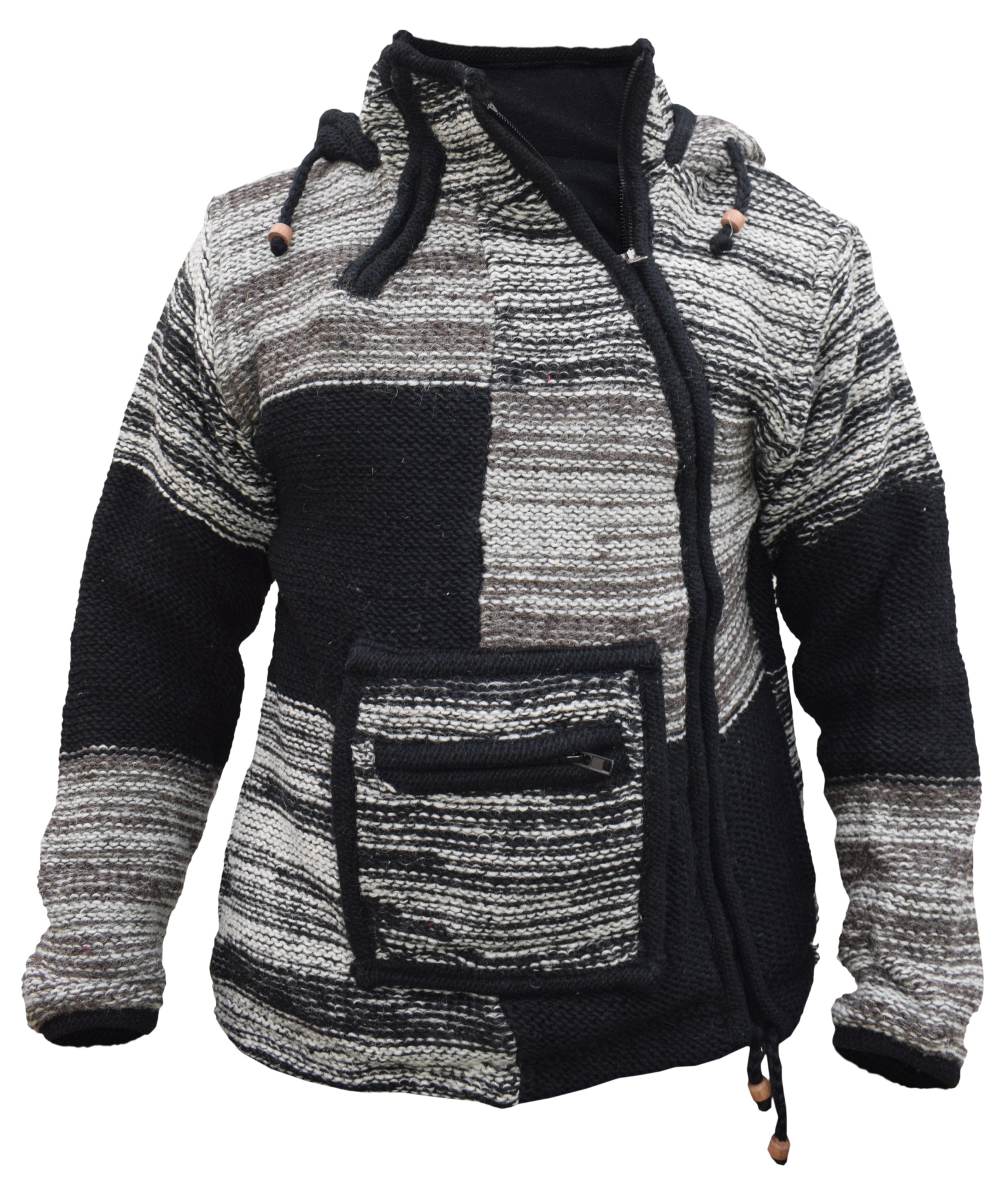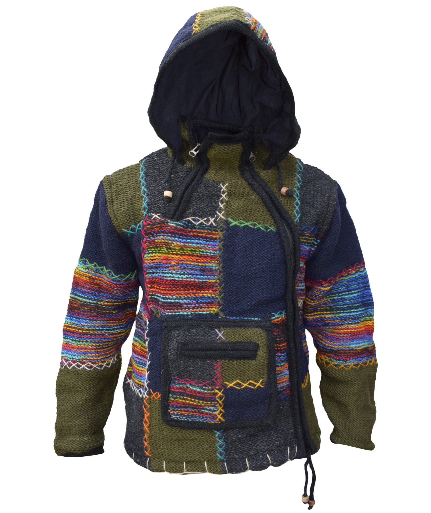 These woolen patch jackets can be your best solution for this winter. They have top quality wool and fleece lined that keep you real warm and is very comfy to wear. They have single side and double side zip fastening with a kangaroo pouch at front. We Drawstring on the hem and hoodie with wooden beads. They are hand knitted patchwork items and every details are provided with special care.