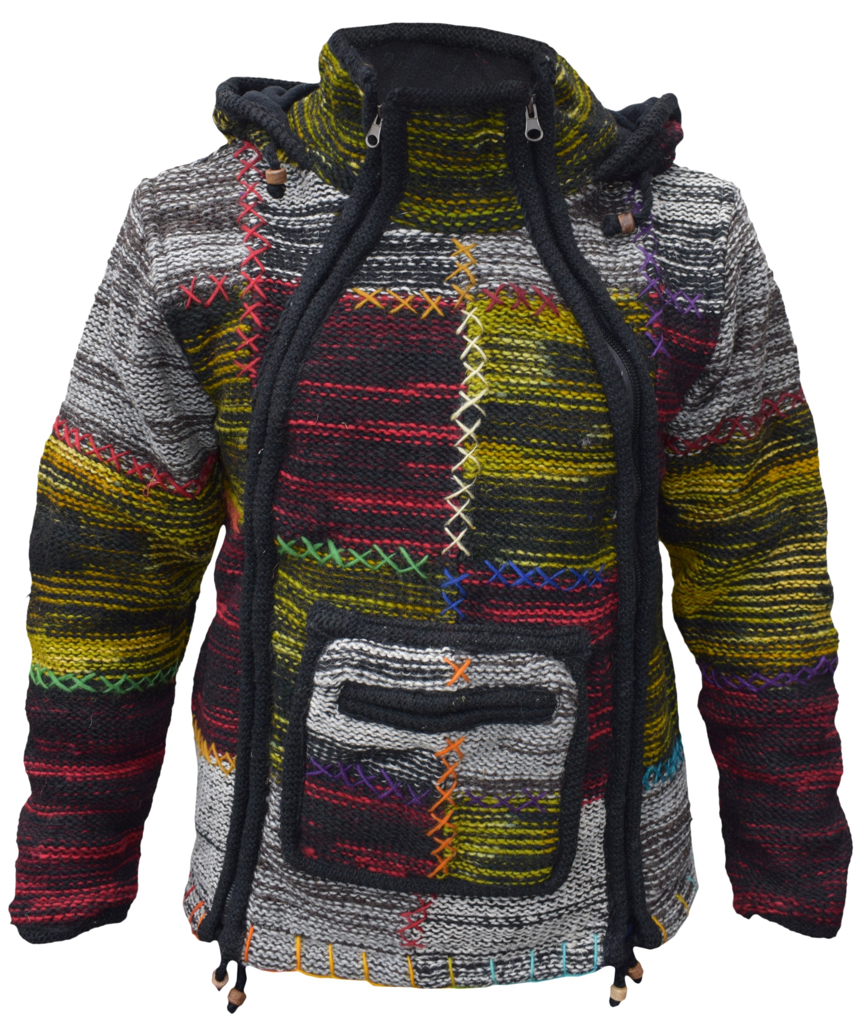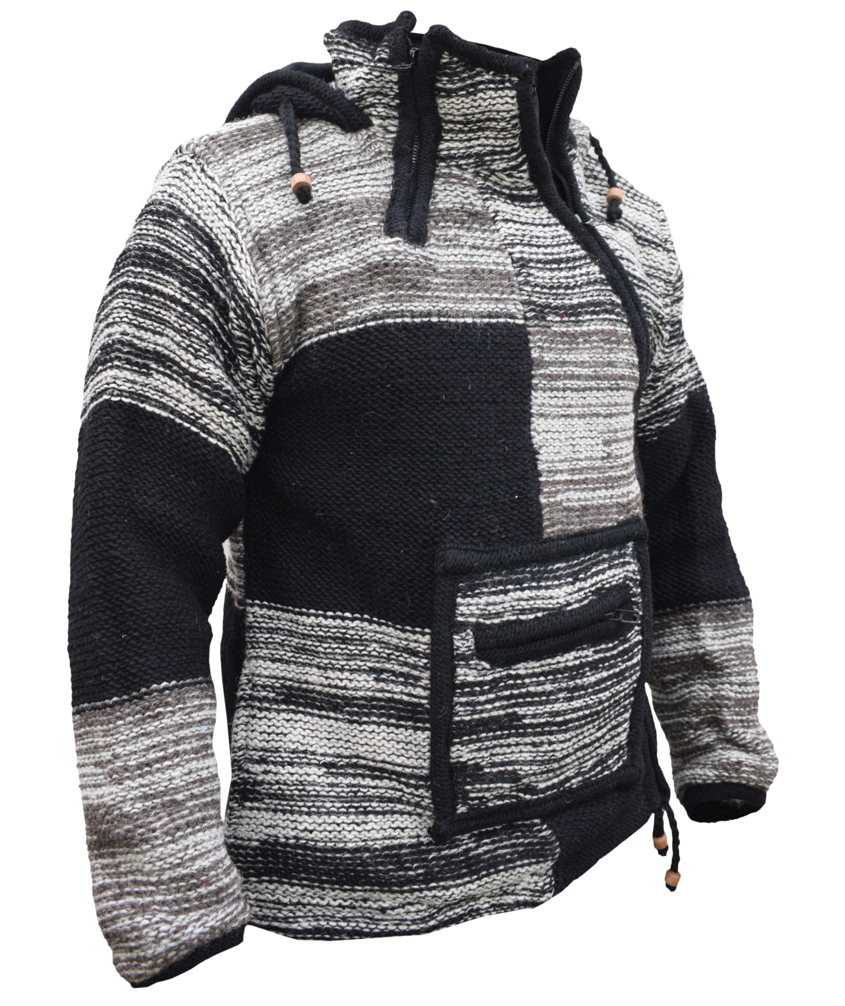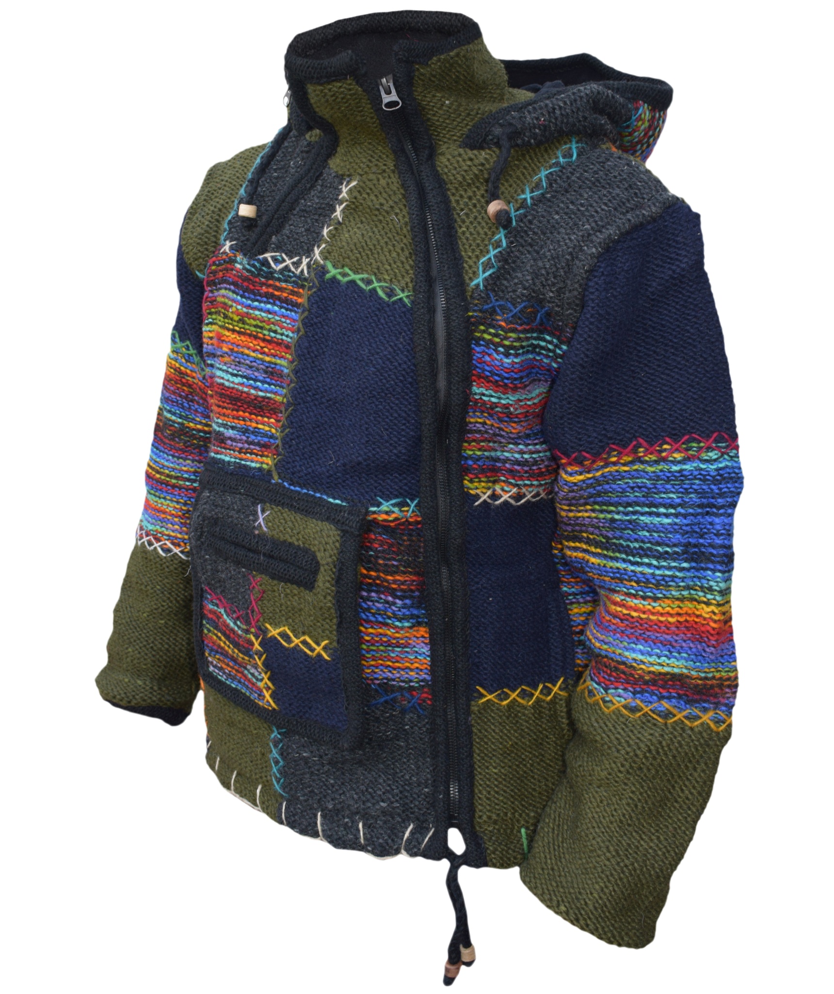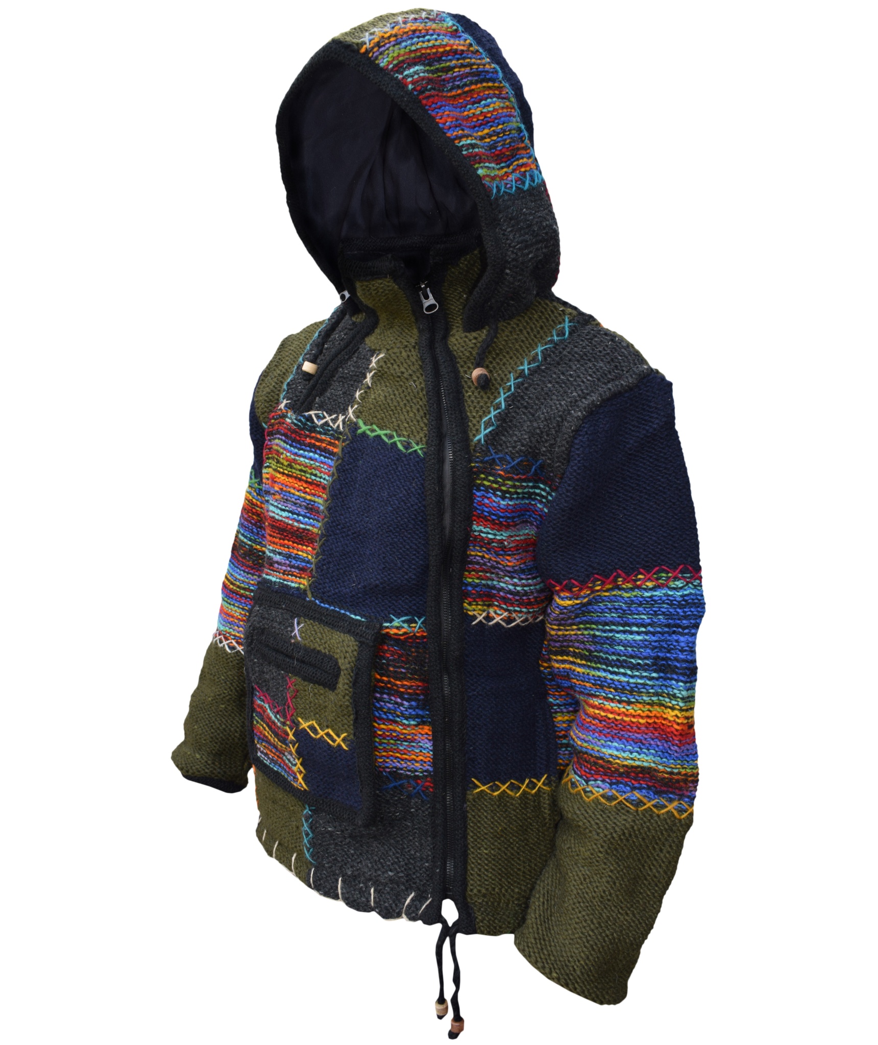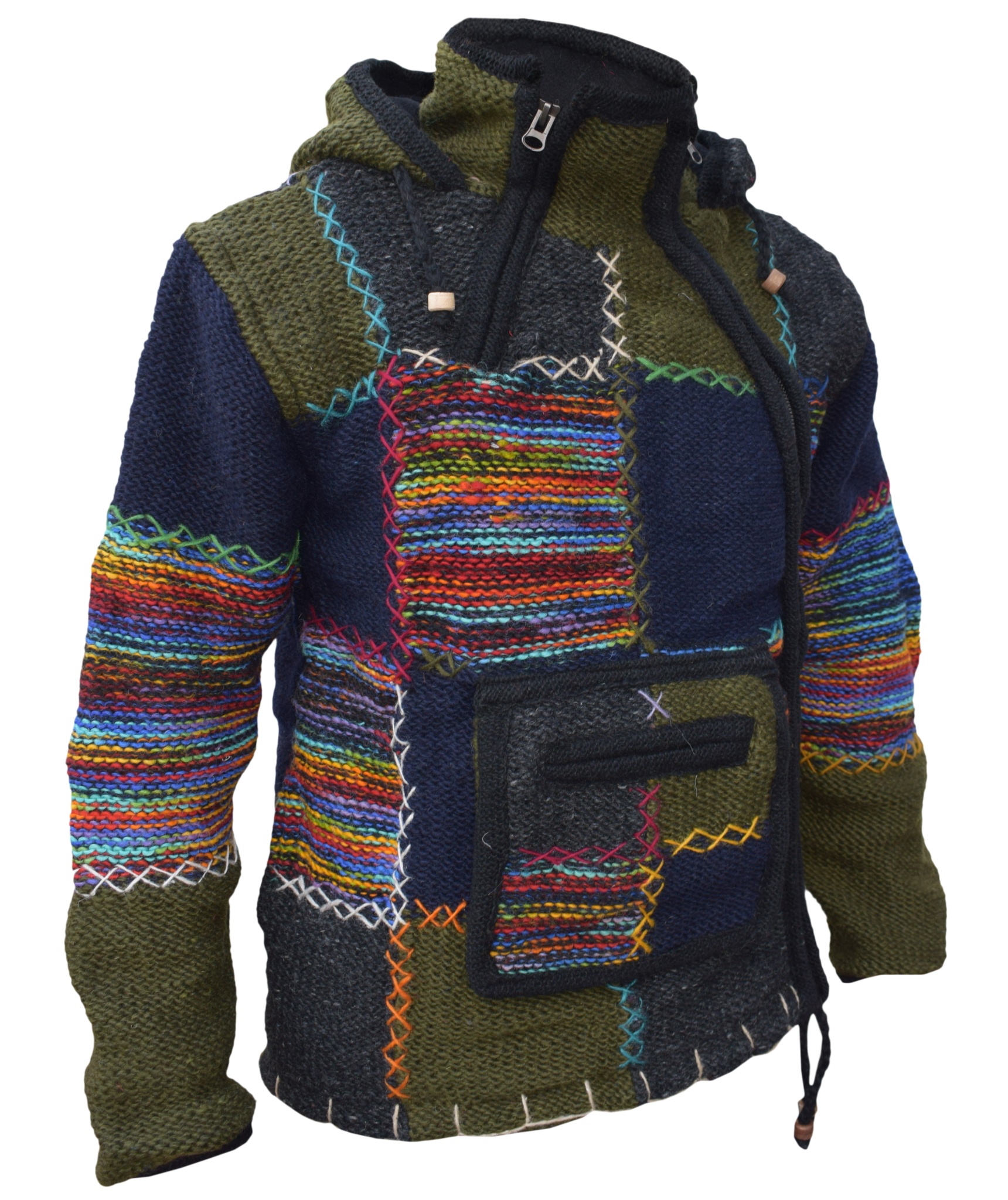 These woolen patch jackets can be your best solution for this winter. They have top quality wool and fleece lined that keep you real warm and is very comfy to wear. They have single side and double side zip fastening with a kangaroo pouch at front. We Drawstring on the hem and hoodie with wooden beads. They are hand knitted patchwork items and every details are provided with special care.